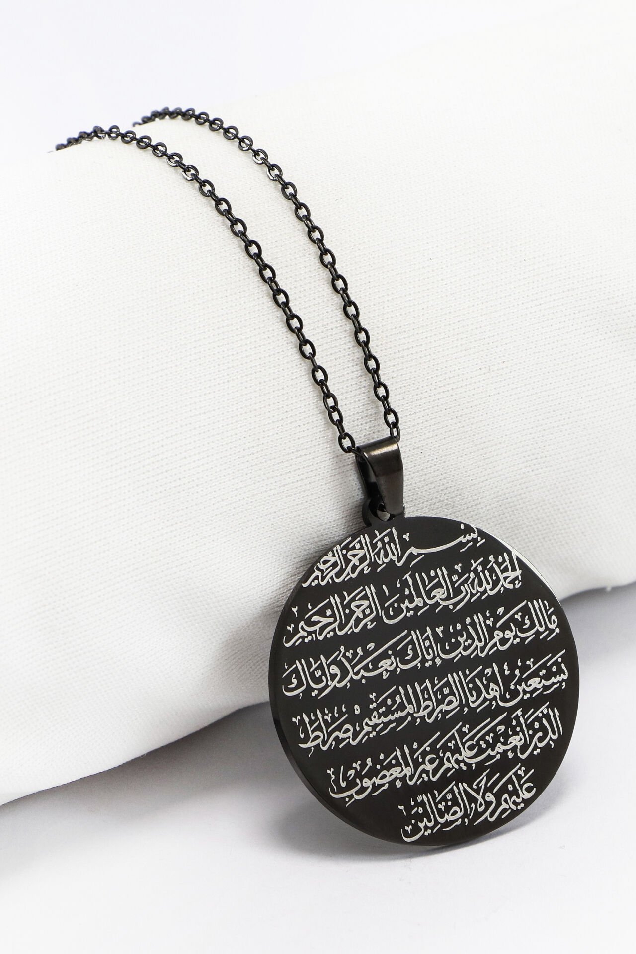 Siyah Çift Taraflı Çelik Kolye Ön Yüzünde Fatiha Arka Yüzünde Ayetel Kürsi Yazılı Kolye (3,5 cm)