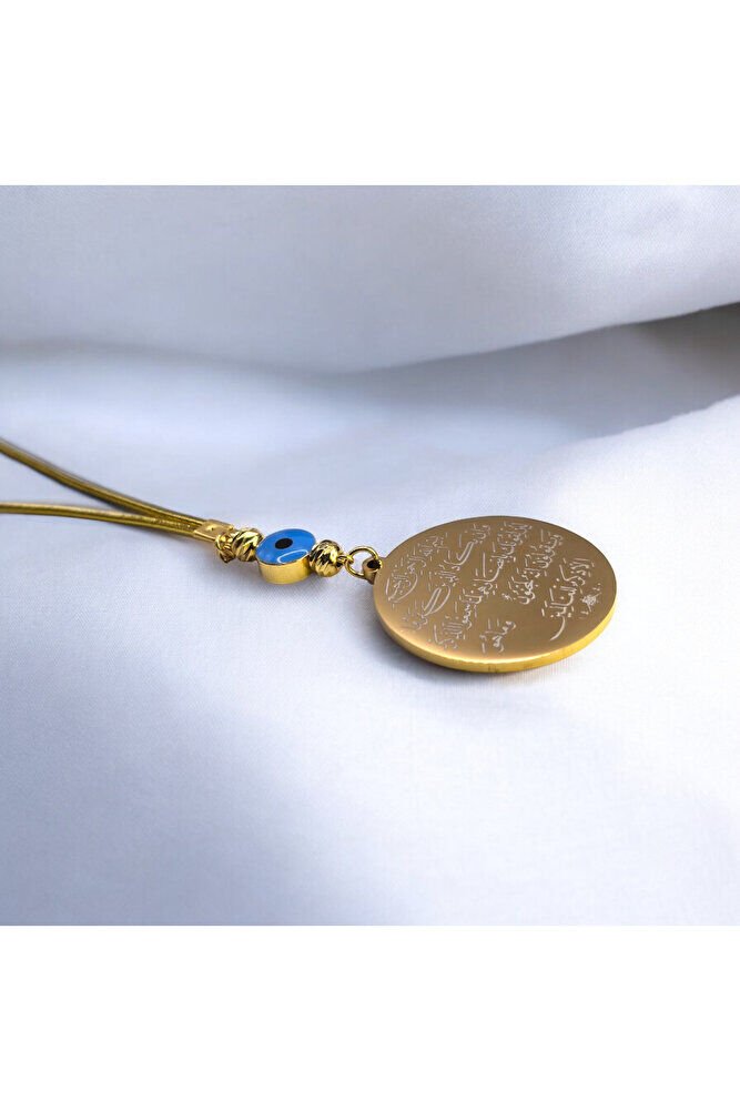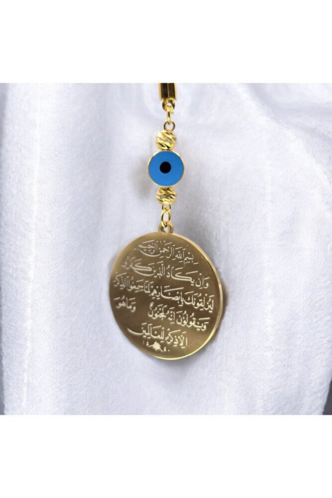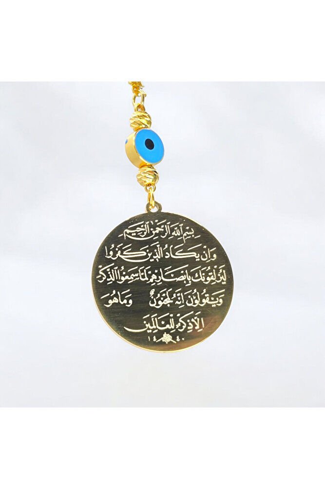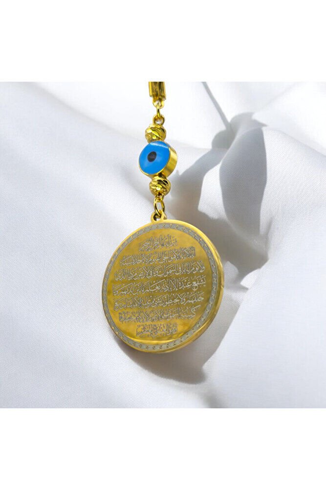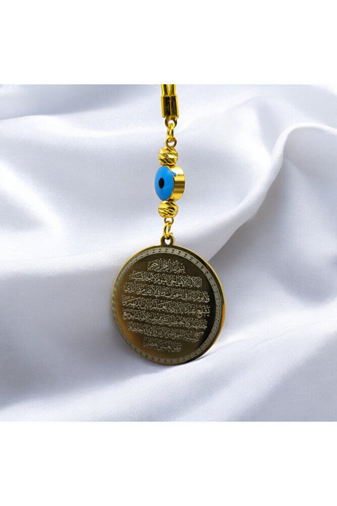 The product is handmade.; ; The gold colored rope is flexible.; ; Because it is handmade, slight differences and irregularities are possible.; ; It can also be used as a bag ornament.; ; The plate is silver colored metal.; It has the Evil Eye Verse on one side and Ayetel Kürsi on the other.; ; In Turkish culture, this powerful symbol, traditionally known as the "evil eye bead", is believed to ward off evil and bring good luck.; ; Each glass bead is meticulously crafted by skilled artisans, which makes each piece unique.; ; We offer the evil eye bead to our customers in different formats such as wall hangings, keychains, car accessories, door ornaments, and magnets.; Hang it in your home, car or office to bring positive energy and protect against the evil eye.; ; The evil eye talisman has different names in various cultures around the world.; ; It is known as "aynal-hasud" or "eye of envy" in Arabic and "mati" in Greek.; ; Whatever its name, belief in the power of the evil eye bead is universal.