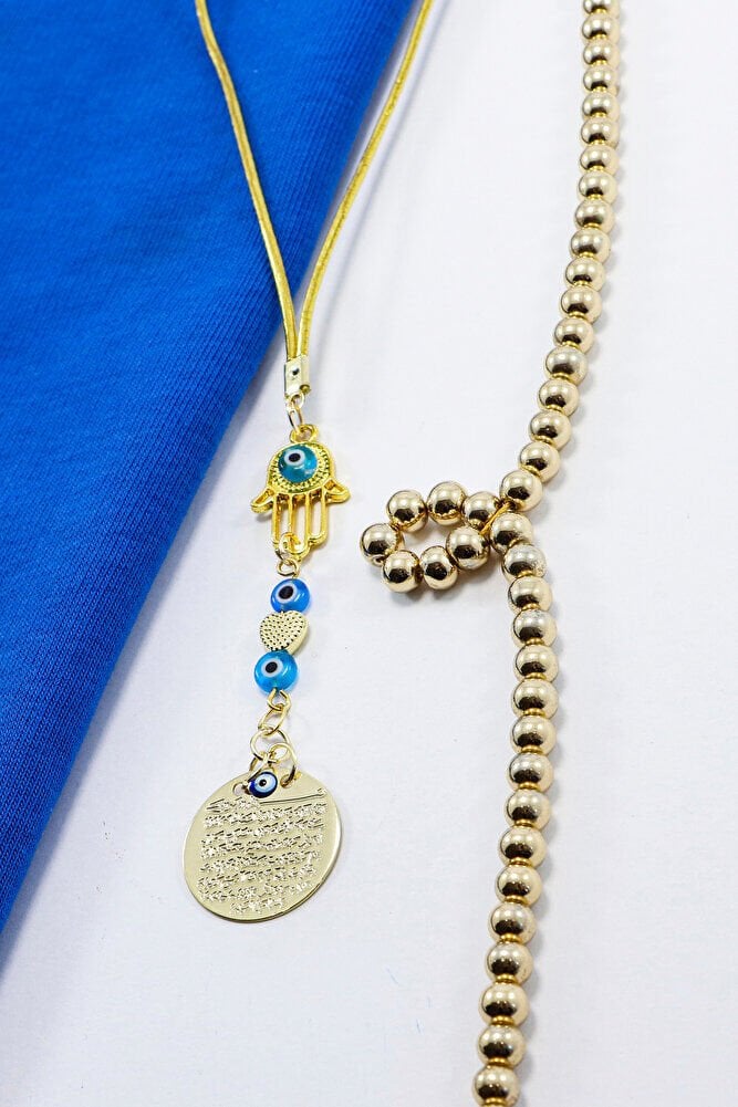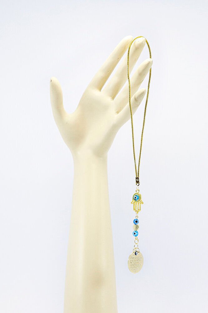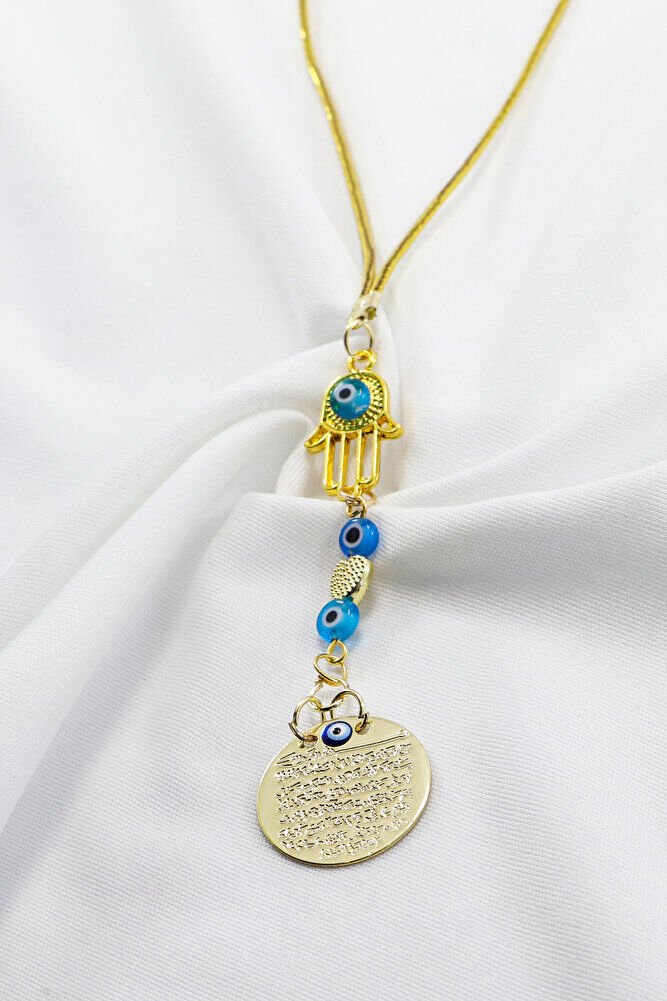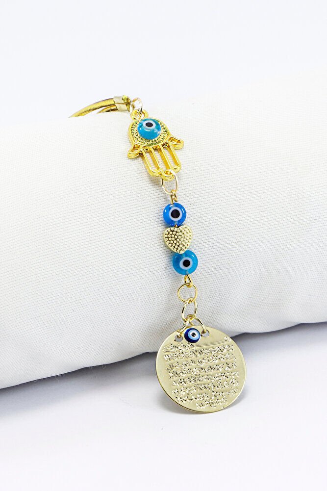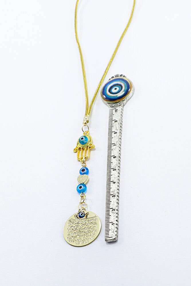 Turkuaz Minik Nazar Boncuklu Metal Ayet'el Kürsi Araba Dikiz Ayna Süsü, Hamse Fatma Ana Eli