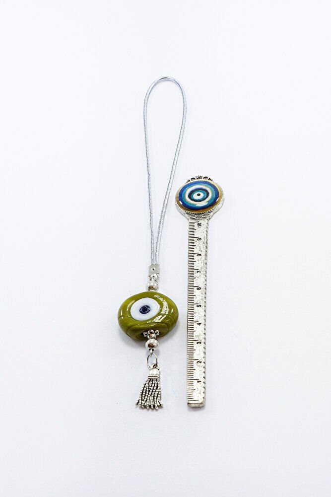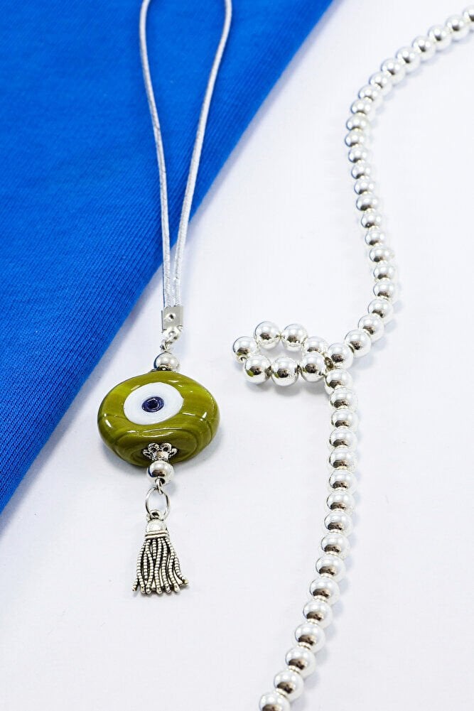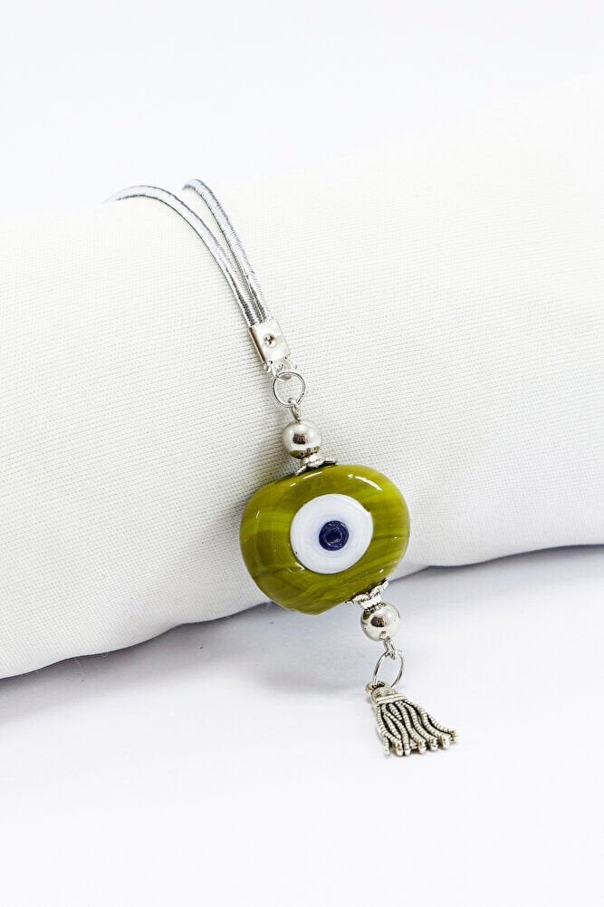 Ürün el yapımıdır.; ; Büyük cam boncuk 2-2,5 cm boyutundadır.; ; Gümüş renkli ip esnektir.; ; El yapımı olduğu için ufak farklılık ve düzensizlikler olasıdır.; Püskül metaldir.; Türk kültüründe geleneksel olarak"nazar boncuğu" olarak bilinen bu güçlü sembolün kötülükleri savuşturduğuna ve iyi şans getirdiğine inanılır.; ; Her cam boncuk yetenekli zanaatkarlar tarafından titizlikle işlenir ve bu her parçayı benzersiz kılar.; ; Nazar boncuğunu, müşterilerimize duvar süsü, anahtarlık, araba aksesuarı, kapı süsü, magnet gibi farklı formatlarda sunuyoruz.; Pozitif enerji getirmek ve nazardan korumak için evinize, arabanıza veya ofisinize asın.; ; Nazar tılsımının dünyadaki çeşitli kültürlerde farklı isimleri vardır.; ; Arapça'da "aynal-hasud" veya "haset gözü", Yunanca'da "mati" olarak bilinir.; ; Adı ne olursa olsun, nazar boncuğunun gücüne olan inanç evrenseldir.; TÜM ÜRÜN FOTOGRAFLARI BİUTİ MARKASINA AİTTİR VE ÖZGÜN ÇALIŞMALARDIR.; İZİNSİZ KULLANIM, KOPYALAMA VEYA DAĞITIM KESİNLİKLE YASAKTIR.; GEREKLİ DURUMLARDA YASAL İŞLEM BAŞLATILACAKTIR.