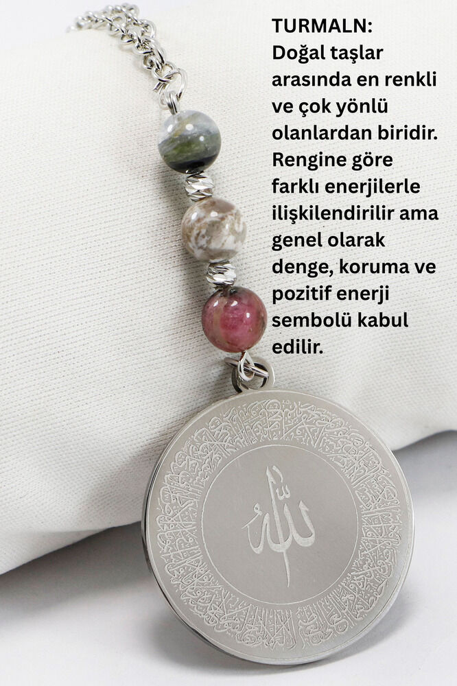 Gri çelik detaylara sahip bu zarif araba dikiz ayna süsü, çift taraflı metal plakasıyla ön yüzünde Ayetel Kürsi, arka yüzünde ise Felak, Nas ve İhlas surelerini taşır.; Dualar, koruma ve huzur niyetiyle seçilmiş olup manevi bir kalkan görevi görür.; Üründe kullanılan Turmalin doğal taşı, negatif enerjiyi uzaklaştırma, elektromanyetik alanlara karşı koruma sağlama ve zihinsel netlik kazandırma özellikleriyle bilinir.; Hem şık bir aksesuar hem de spiritüel bir koruyucu olan bu ürün, yeni araba hediyesi, manevi anlamlı armağanlar veya sadece sevdiklerinizi düşündüğünüzü göstermek için anlamlı bir tercihtir.; Taşlar doğal olduğu için her birinin rengi ve dokusu farklılık gösterebilir; bu da her ürünü özel ve benzersiz kılar.; Görsel temsili olup, taşlar arasında ton ve desen farklılıkları olabilir.