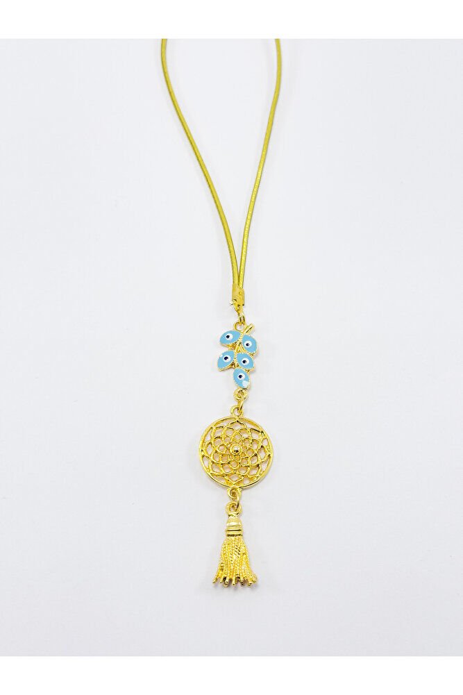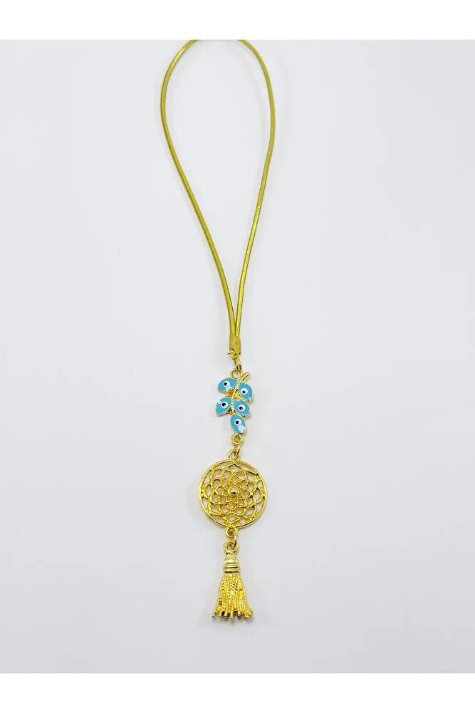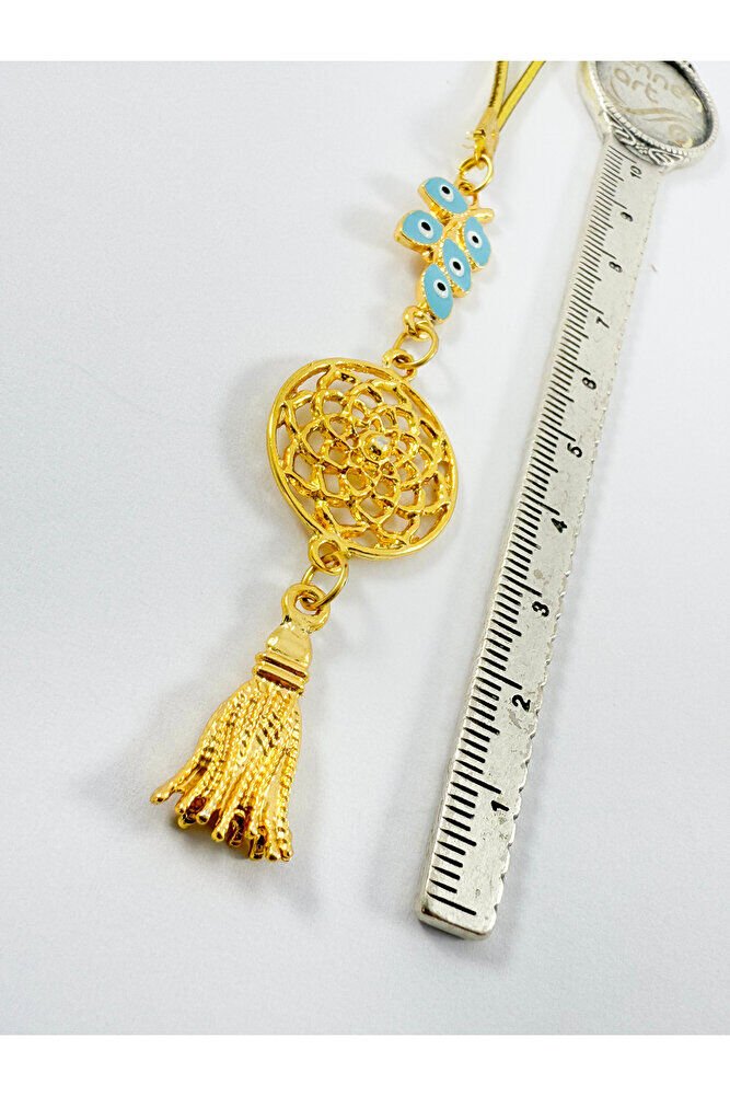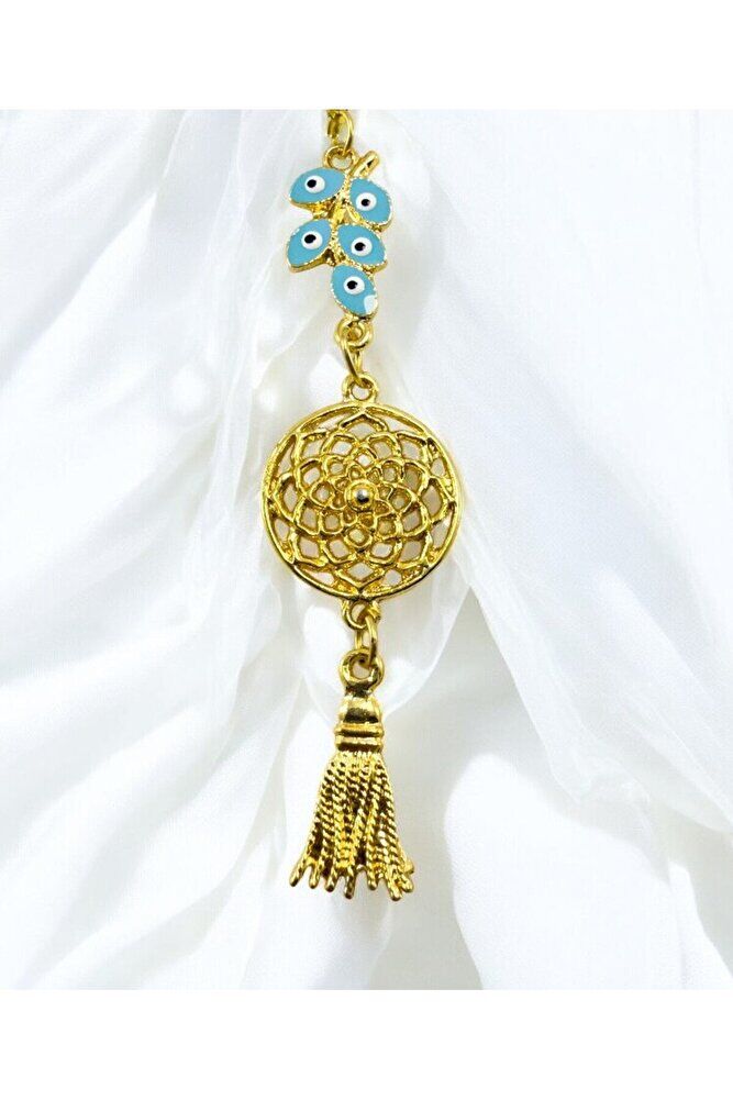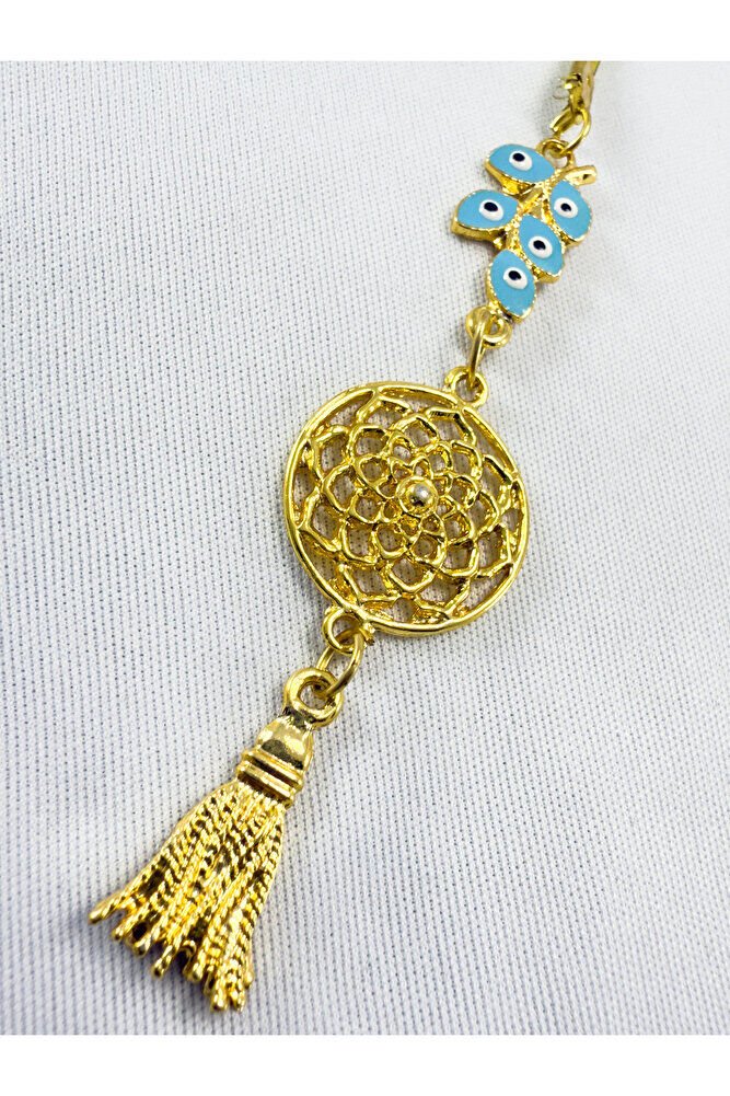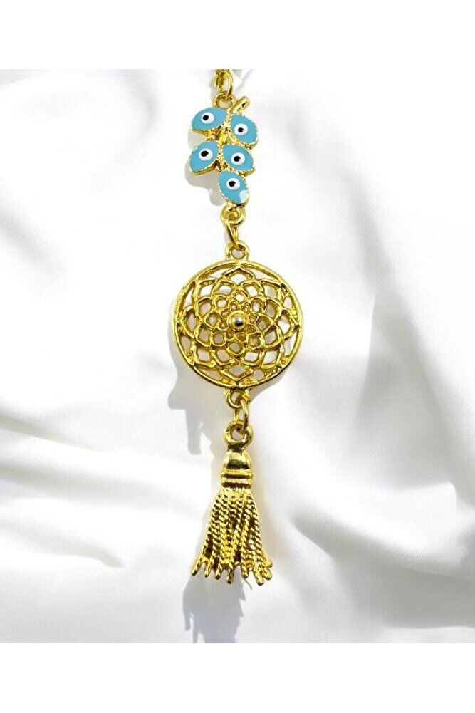 Turquoise Cluster Evil Eye Bead Metal Lotus Flower Car Rearview Mirror Ornament / Gold Color Metal Tassel