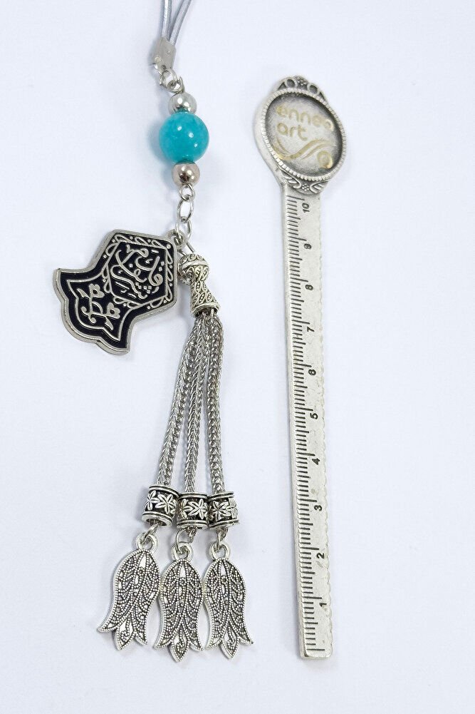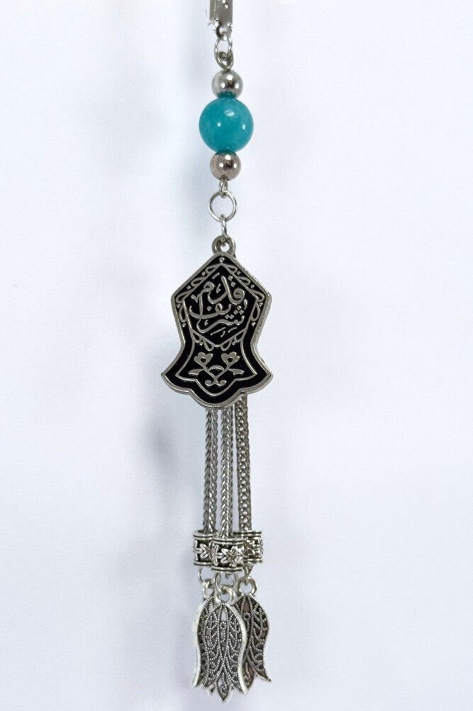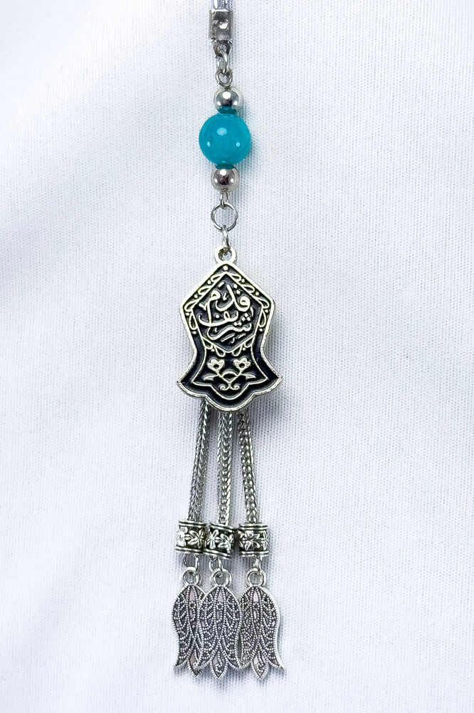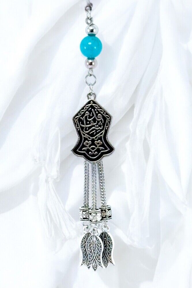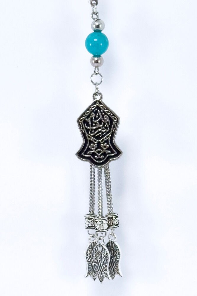 The product is handmade.; Because it is handmade, slight differences and modifications are possible.; The rope is elastic.; Since it is elastic, it can be easily installed on any model of vehicle.; The turquoise stone is a natural stone.; There is the Nal-i Şerif prayer on the metal plate.; Nal-i Şerif is a sacred motif symbolizing the trace of the blessed horseshoe (shoe) of our Prophet Hz.; Muhammad (pbuh); It is widely known and accepted in Islamic culture.; According to belief, this symbol, carrying the horseshoe or hung wherever it is, brings abundance, peace and spiritual protection.; It is believed to be especially protective against the evil eye and keeps bad energies away.; This symbol, which has high spiritual value, is used in homes, vehicles or on various objects with harmal beads and is considered a reminder of following in the footsteps of our Prophet and a talisman in the form of a prayer.; Tulips are metal.;