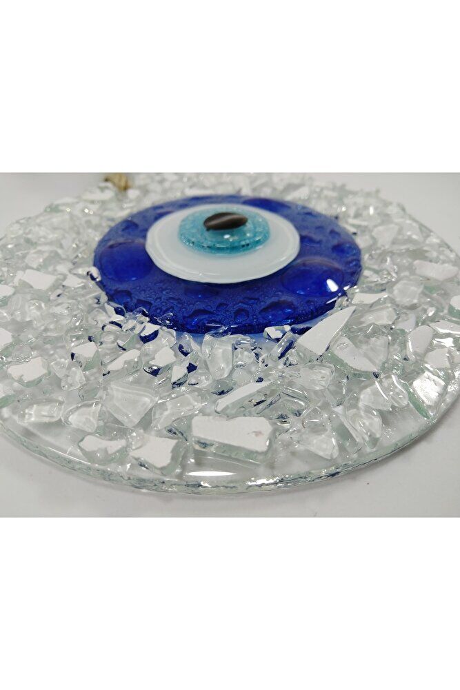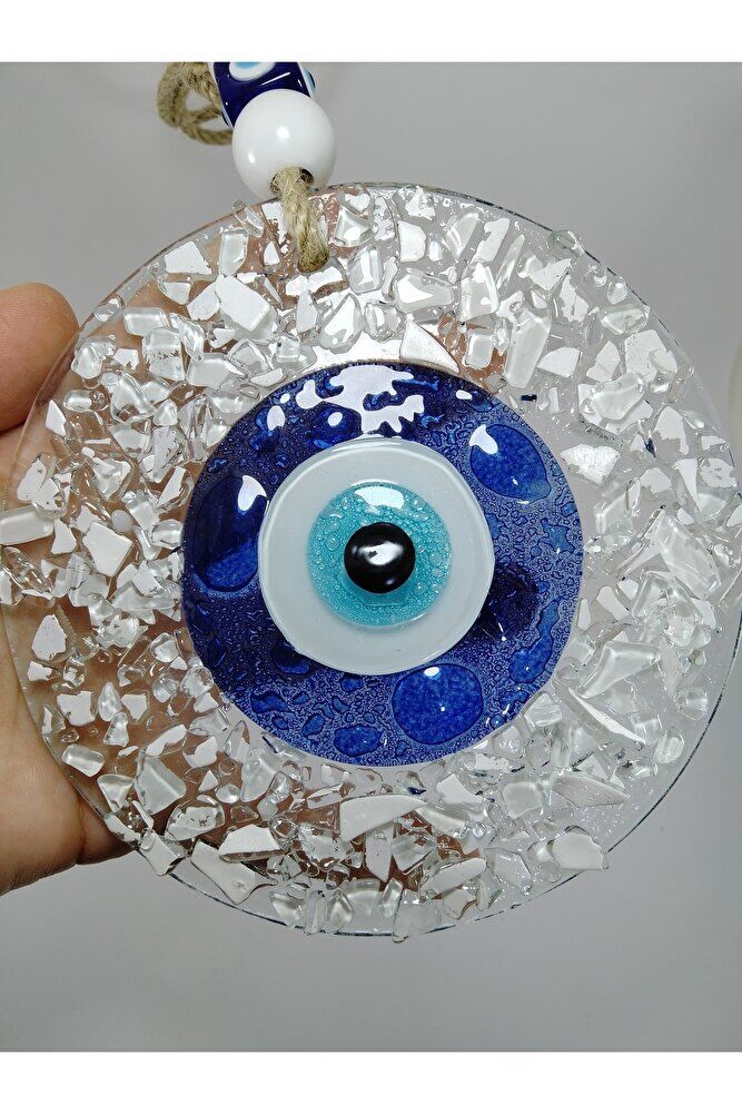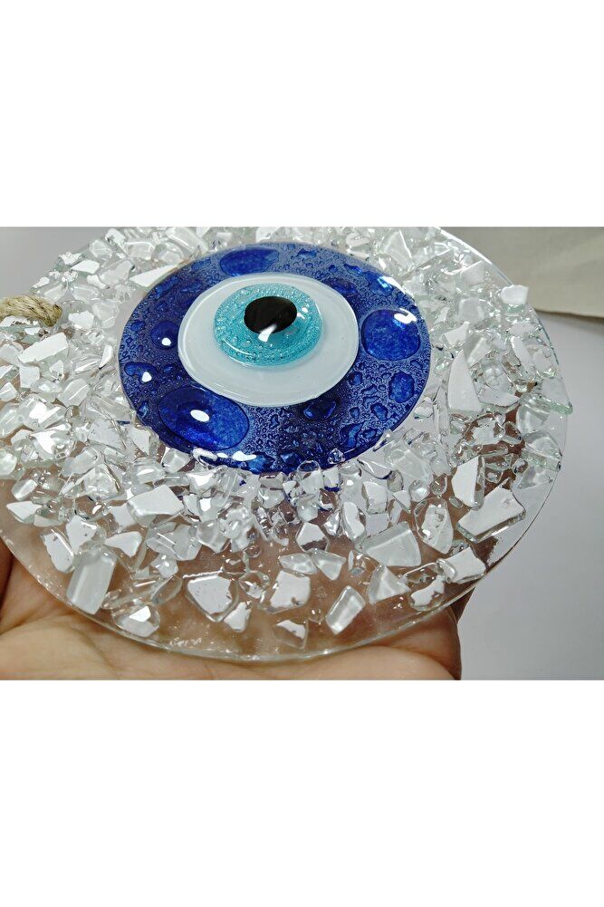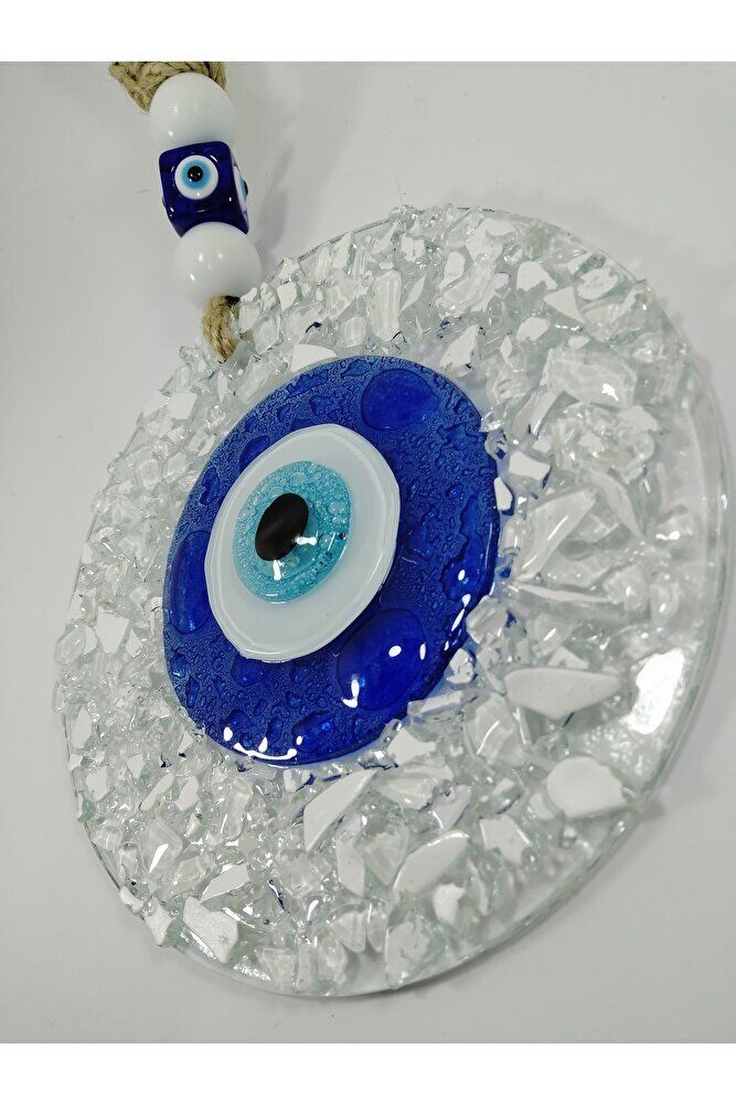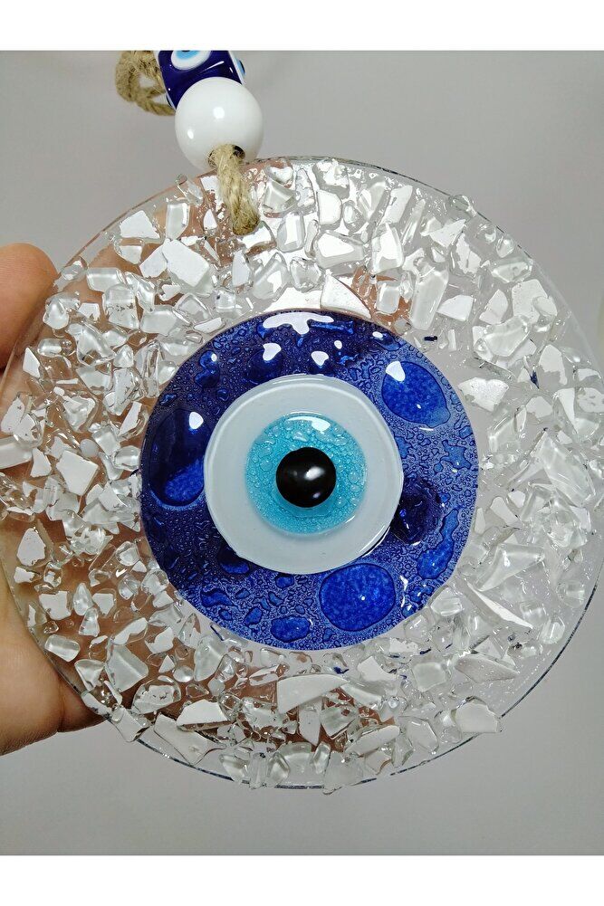 Handmade glass evil eye bead, each detail is carefully processed and has a unique design; With its 13 cm size, it fits easily on the walls of your home or office in ideal dimensions; It offers both a stylish and mystical look with its crushed glass material; It adds a modern and authentic touch to your wall decoration;