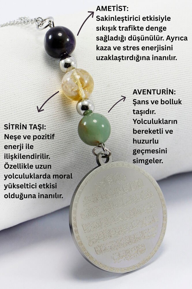 Bu zarif tasarım, ön yüzünde Âyet-el Kürsîarka yüzünde Felak, Nas, İhlas sureleri bulunan çelik plakanın sitrin, aventurinve ametistgibi doğal taşlarla kombinlenmesiyle hazırlanmıştır. Duaların manevi derinliği, doğal taşların enerjisiyle buluşarak yalnızca şık bir aksesuar değil, aynı zamanda anlam yüklü bir obje ortaya çıkarmaktadır. Geleneksel olarak sitrintaşının pozitif enerji, neşe ve huzurlu bir atmosfer; aventurintaşının yolculuklarda şans, içsel dinginlik ve koruyuculuk; ametisttaşının ise sakinlik, ruhsal denge ve negatif enerjiden arınmayla ilişkilendirildiğine inanılır. Bu yönüyle ürün, araç içerisinde hem estetik bir dokunuş hem de manevi bir atmosfer yaratmak isteyenler için ideal bir seçimdir.