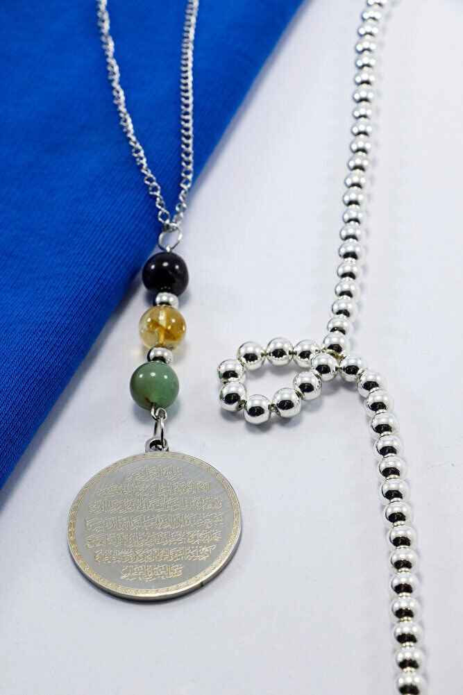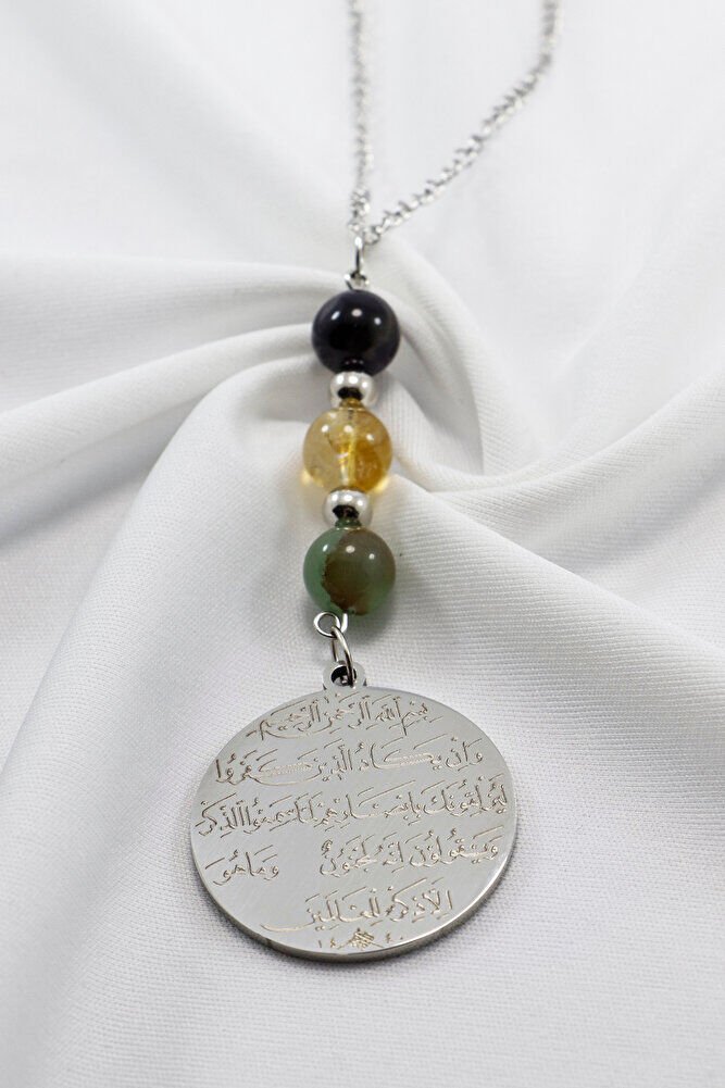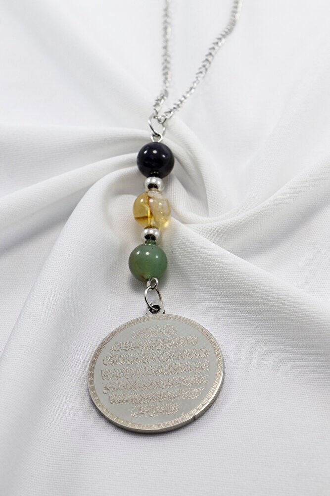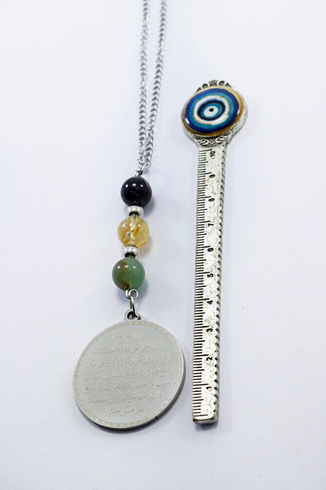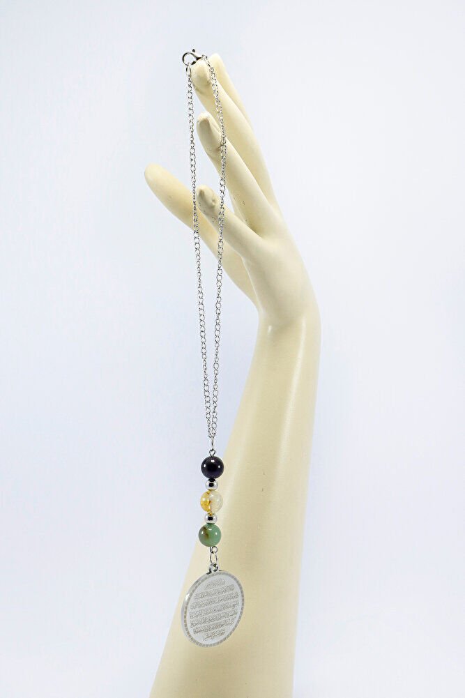 Zincirli Çelik Ayetel Kürsi Nazar Ayeti Araba Dikiz Ayna Süsü, Doğal Taşlı Araba Dekoru EN06718