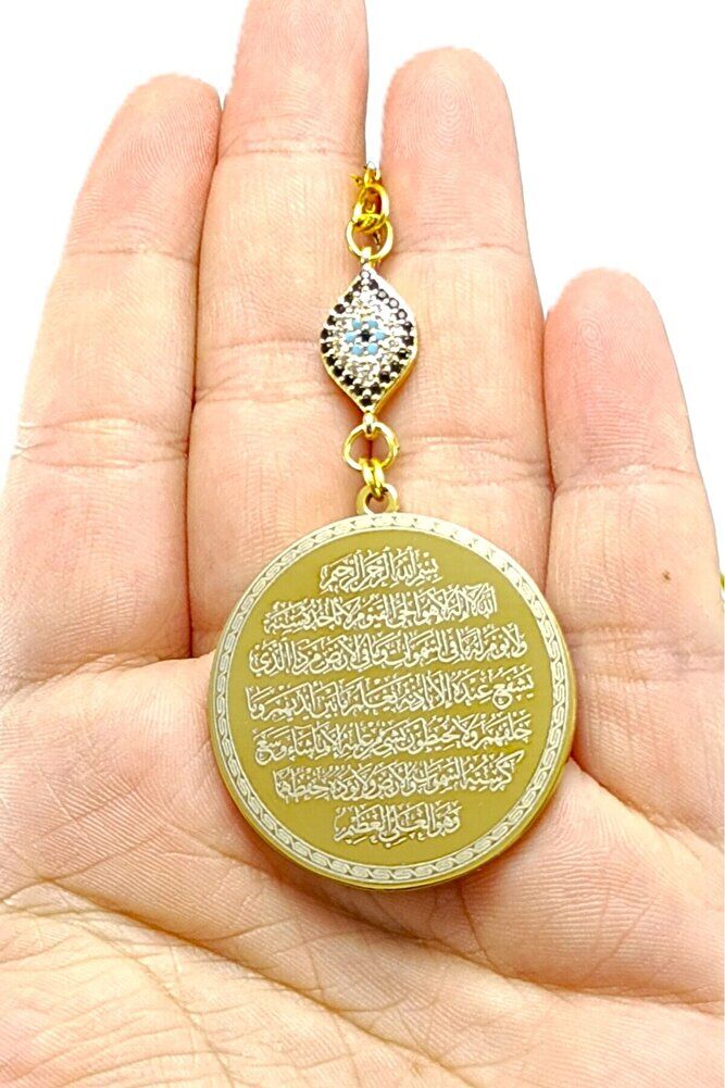 Zircon Stone Evil Eye Detailed Gold Steel Double Sided Ayetel Kursi / Evil Eye Verse Car Rearview Mirror Ornament