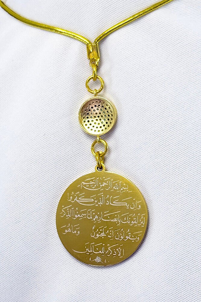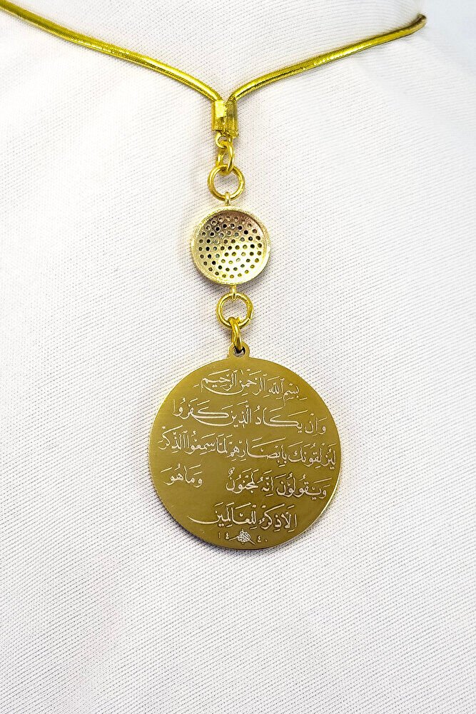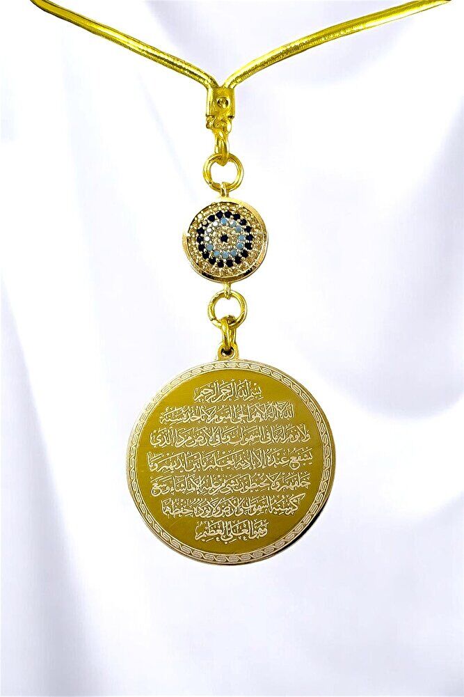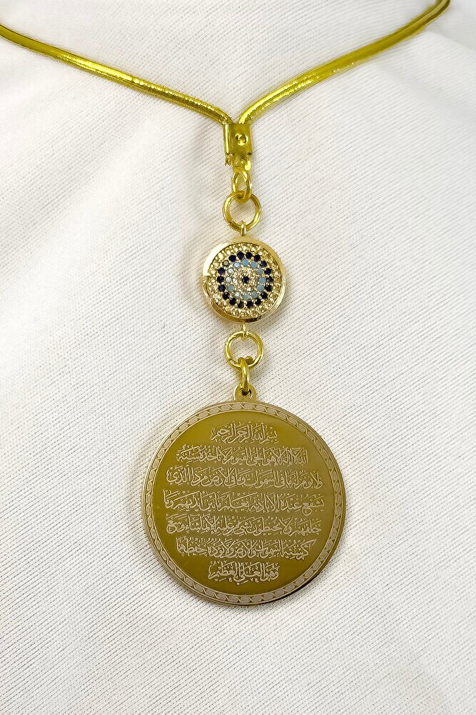 Prayers are permanently engraved with laser engraving technique.; The evil eye with zircon stone is single-sided.; It has Ayetel Kürsi written on the face.; It is double-sided.; The product is handmade and slight differences and irregularities are possible because it is handmade.; The rope is elastic.; Because it is elastic, it can be easily attached to any model.; The plate is gold-colored stainless steel.; The connection mechanisms are durable gold-plated.; The steel plate measures 3.5 cm.; The plate is double-sided.; It has Ayetel Kürsi on one side and the Evil Eye Verse on the other.; The Evil Eye Verse is a special prayer recited in the Islamic faith for protection from evil eyes and negative energies.; It is believed that the evil eye can bring negative effects and misfortune to a person's life as a result of looking at them with evil intentions.; The Evil Eye Verse protects one from such negative effects by taking refuge in Allah's protection.; It also strengthens belief in Allah's power and divine power to prevent the evil eye from harming a person.; This prayer is believed to provide mental peace and spiritual strength, so it is frequently recited in homes, workplaces, or on personal belongings.; Ayetel Kursi is considered one of the most powerful and protective prayers in Islam.; Ayetel Kursi is a verse that expresses the greatness and sovereignty of Allah and is frequently recited for protection and spiritual strength.; This verse emphasizes that everything in the heavens and the earth belongs to Allah and provides protection from evil influences.; It is believed that reciting it, especially before going to bed at night, is greatly beneficial in terms of safety, protection from harmful energies, and spiritual peace.; At the same time, it gives a person spiritual comfort and strength through the belief that Allah knows everything and that everything depends on Him.;