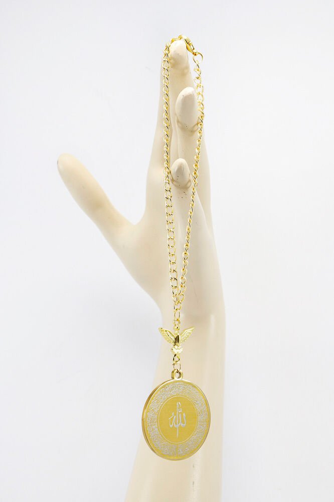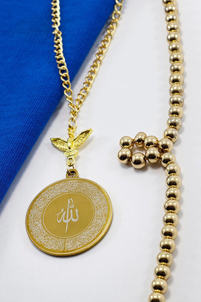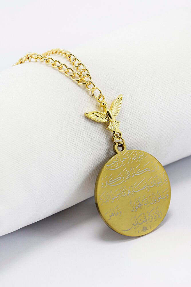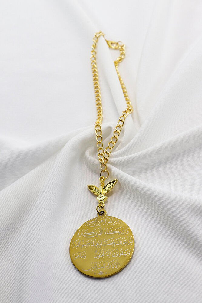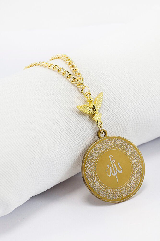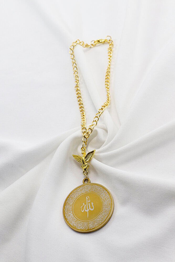 Dualar lazer kazıma tekniği ile kalıcı bir şekilde kazınmaktadır.; Anka kuşu tek taraflı metaldir; Lak kaplamadır.; Zincir ayarlanabilir metaldir.; ; Plaka gold renkli 316l paslanmaz çeliktir.; Çelik plaka 3,5 cm ölçülerindedir.; Plaka çift taraflıdır.; Bir yüzünde Ayetel Kürsi diğer yüzünde ise Felak Nas İhlas bulunmaktadır.; Ayetel Kürsi, Bakara Suresi'nin 255. ayetidir ve İslam inancında çok önemli bir yere sahiptir.; Bu ayet, Allah’ın kudretini, egemenliğini ve her şeyi bilen, her şeyin sahibi olan Yüce Varlık olduğunu vurgular.; Ayet, Allah'ın her şeyin üzerinde olduğunu, hiçbir gücün O’nun izni olmadan hareket edemeyeceğini belirtir.; İnanılır kabul edilen bir başka önemli husus da, bu ayetin kişiyi kötülüklerden koruyacağına, huzur ve güven vereceğine inanılmasıdır.; Müslümanlar, Ayetel Kürsi'yi sıkça okur ve çeşitli durumlarda korunma, dua ve huzur arayışı için kullanırlar.; Bu nedenle, hem manevi hem de koruyucu bir anlam taşır.; Nazar ayetleri de sıkça güven ve huzur arayışında olanlar için okunur ve ruhsal dengeyi sağlamak isteyenlere büyük fayda sağladığına inanılır.;