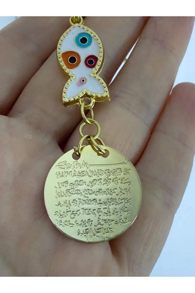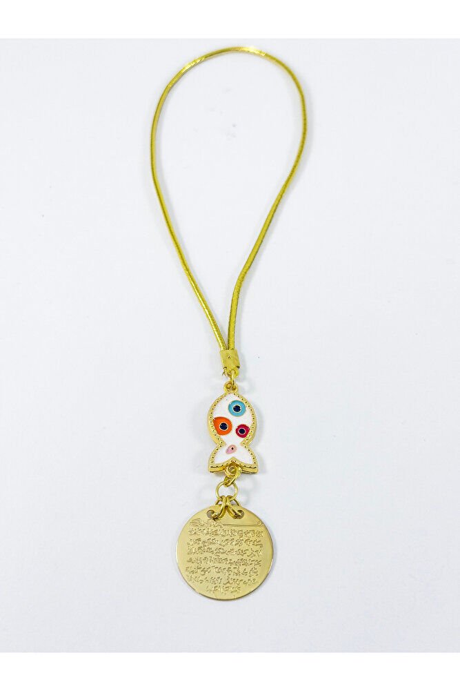 Ürün el yapımıdır.; El yapımı olduğu için ufak farklılık ve düzensizlikler olasıdır.; Ip elastiktir, lastikli yapısı sayesinde her model araca kolaylıkla takılabilmektedir.; Ürün altın renkli metaldir.; Balık tek taraflıdır.; Ayetel Kürsi tek taraflıdır ve 2 cm ölçülerindedir.; Ayetel Kürsi, Bakara Suresi'nin 255. ayetidir ve İslam inancında çok önemli bir yere sahiptir.; Bu ayet, Allah ın kudretini, egemenliğini ve her şeyi bilen, her şeyin sahibi olan Yüce Varlık olduğunu vurgular.; Ayet, Allah'ın her şeyin üzerinde olduğunu, hiçbir gücün O nun izni olmadan hareket edemeyeceğini belirtir.; İnanılır kabul edilen bir başka önemli husus da, bu ayetin kişiyi kötülüklerden koruyacağına, huzur ve güven vereceğine inanılmasıdır.; Müslümanlar, Ayetel Kürsi'yi sıkça okur ve çeşitli durumlarda korunma, dua ve huzur arayışı için kullanırlar.; Bu nedenle, hem manevi hem de koruyucu bir anlam taşı