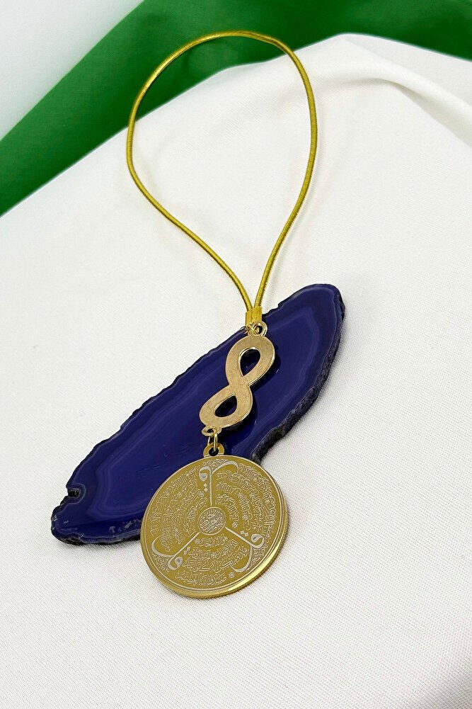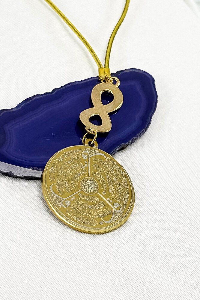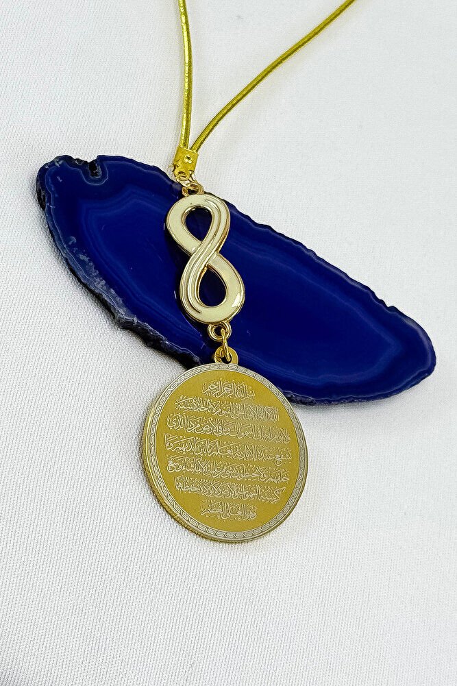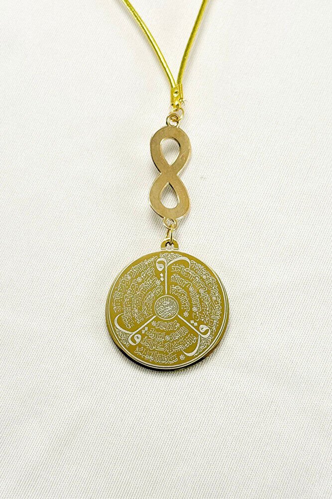 Dualar lazer kazıma tekniği ile kalıcı bir şekilde kazınmaktadır.; Mineli sonsuzluk metaldir ve tek taraflıdır.; Ürün el yapımıdır el yapımı olduğu için ufak farklılık ve düzensizlikler olasıdır.; İp elastiktir.; Elastik olduğu için her modele rahatlıkla takılabilmektedir.; Plaka altın renkli paslanmaz çeliktir.; Çelik plaka 3,5 cm ölçülerindedir.; Plaka çift taraflıdır.; Bir yüzünde Ayetel Kürsi diğer yüzünde ise Felak Nas İhlas bulunmaktadır.; Felak, Nas ve İhlas sureleri, İslam inancında korunma ve manevi güç sağlamak için okunan önemli dualardır.; İnanılır kabul edilir ki, Felak ve Nas sureleri, özellikle kötü gözlerden, nazardan ve şeytani etkilerden korunmak için okunur.; Felak suresi, karanlık güçlere karşı koruma sağlarken, Nas suresi de olumsuz düşünceler ve zararlı enerjilerden korunmayı sağlar.; İhlas suresi ise, Allah ın birliğini ve sınırsız gücünü ifade eder, bu sureye inanılır ki, kişi manevi huzur ve Allah ın koruması altında olur.; Bu sureler, sıkça güven ve huzur arayışında olanlar için okunur ve ruhsal dengeyi sağlamak isteyenlere büyük fayda sağladığına inanılır.; Ayetel Kürsi, İslam inancında en güçlü ve koruyucu dualardan biri olarak kabul edilir.; Ayetel Kürsi, Allah ın büyüklüğünü ve egemenliğini ifade eden bir ayet olup, koruma ve manevi güç sağlamak amacıyla sıkça okunur.; Bu ayet, göklerde ve yerin her şeyinin Allah a ait olduğunu vurgular ve şeytani etkilerden korunma sağlar.; Özellikle gece yatmadan önce okunmasının, güvende olma, zararlı enerjilerden korunma ve ruhsal huzur sağlama açısından büyük fayda verdiğine inanılır.; Aynı zamanda, Allah ın her şeyi bildiği ve her şeyin O na bağlı olduğu inancı ile kişiye manevi rahatlık ve güç verir.;