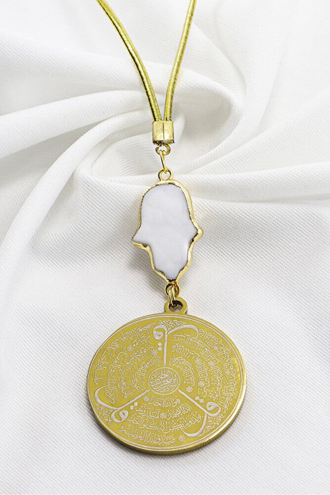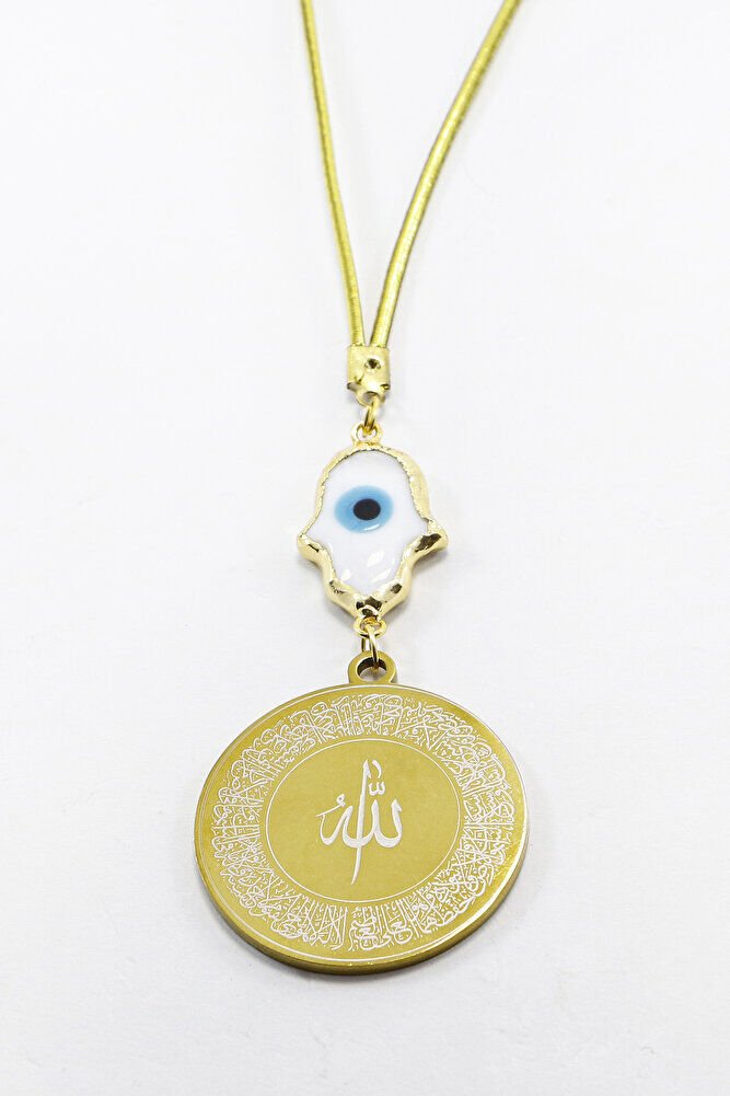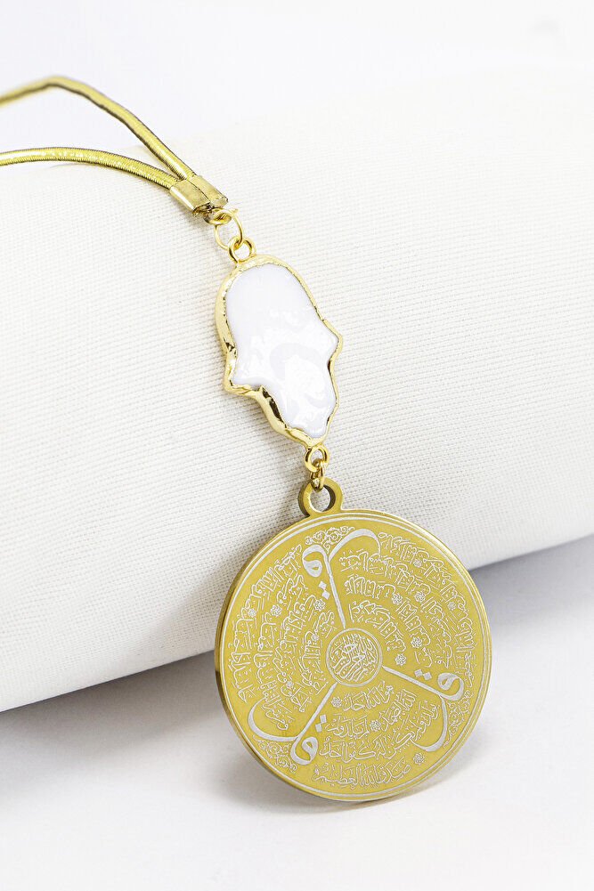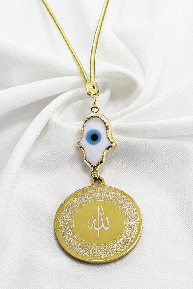 Beyaz Nazarlı Hamse Eli Gold Çelik Hat Ayetel Kürsi Felak Nas İhlas Dikiz Ayna Süsü (3,5)