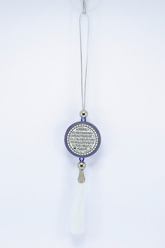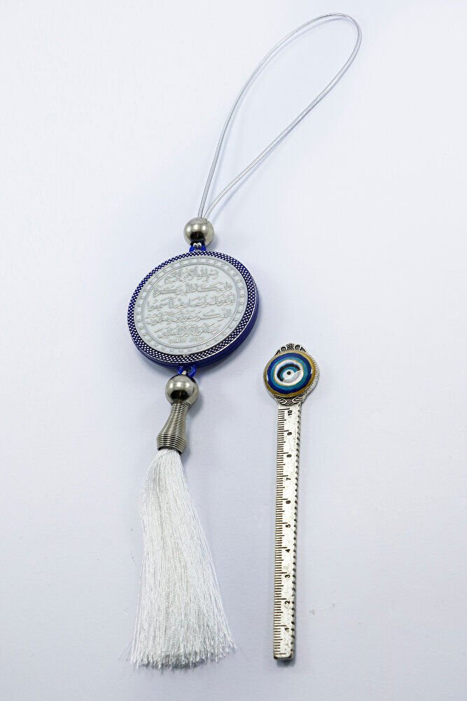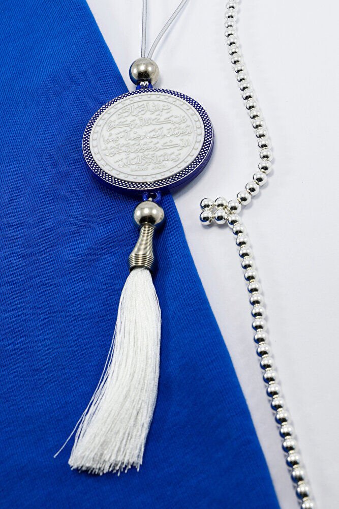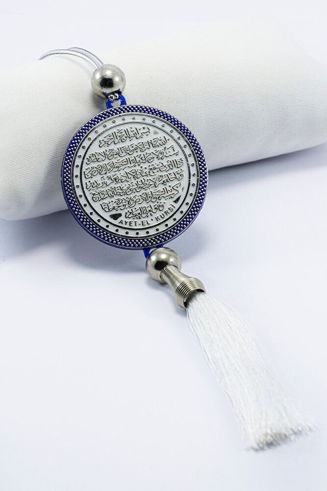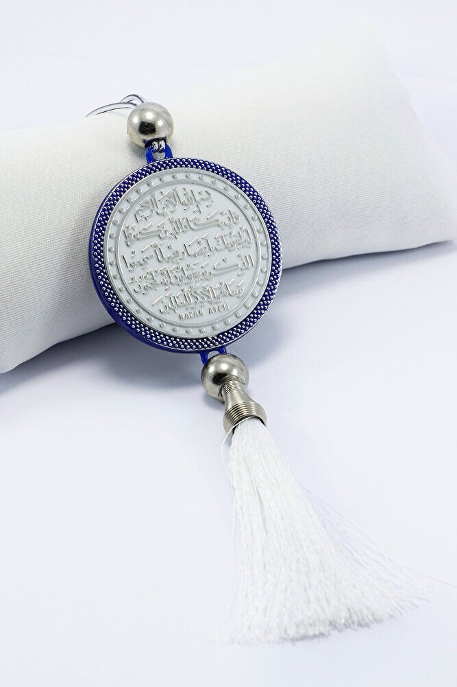Beyaz Püsküllü Lacivert Ayet'el Kürsi Arka Nazar Ayeti Araba Dikiz Ayna Süsü Elastik İpli