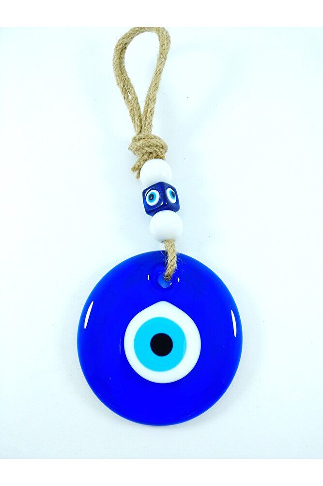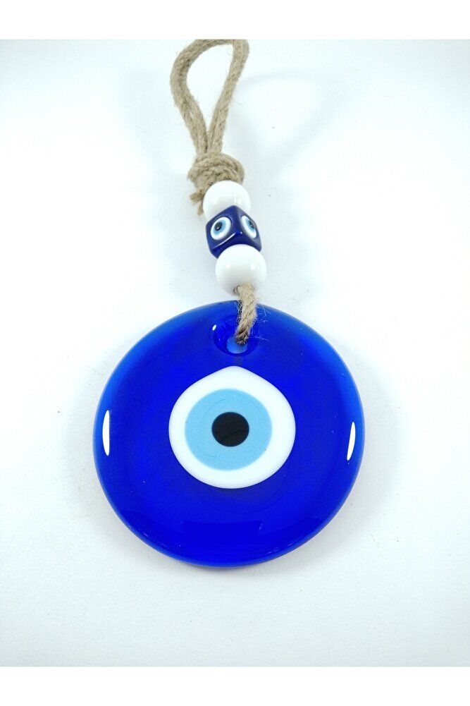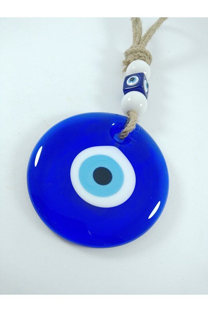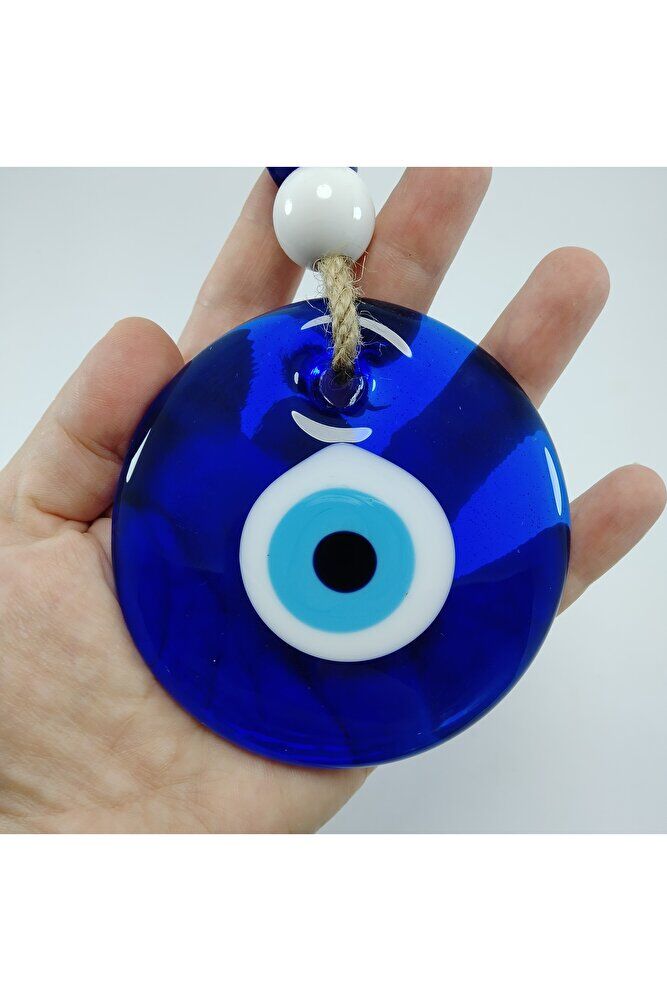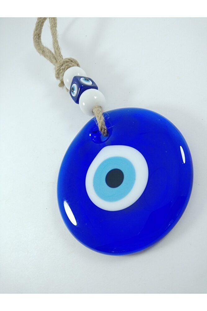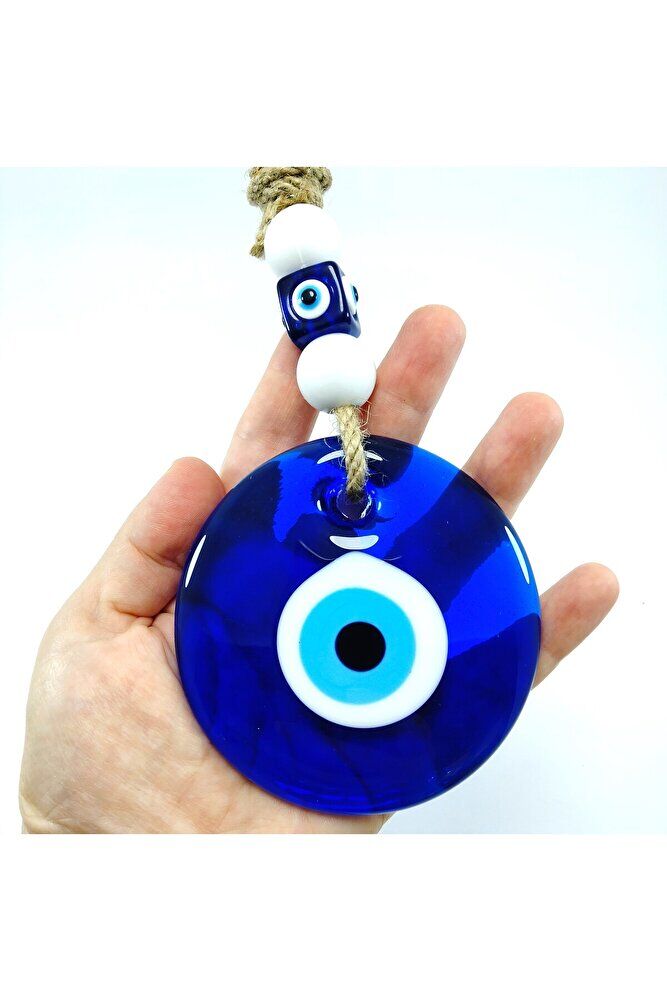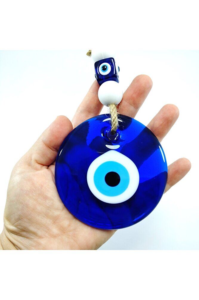 Büyük cam boncuk 9 cm boyutundadır. ; El yapımı olduğu için ufak farklılık ve düzensizlikler olasıdır. ; Kalıpla yapılmadığı için boyutu ±1cm değişebilir. ; Üst kısımdaki boncuklar plastikten imal edilmiştir. ; Nazar boncuğu, Türk kültüründe ve diğer bazı Orta Doğu ülkelerinde kullanılan bir tür koruyucu nesnedir. ; Genellikle mavi ve beyaz renklerde tasarlanan küçük bir boncuktur ve içinde siyah bir nokta veya göz şekli bulunur.Nazar boncuğunun amacı, kişinin üzerindeki kötü şansı, kıskançlığı veya nazarı (bakışları) uzaklaştırmak ve korumak için kullanılır. ; Bu nedenle, evlerde, arabalarda, iş yerlerinde, takılarda ve hatta bebeklerin kıyafetlerinde kullanılabilir.;