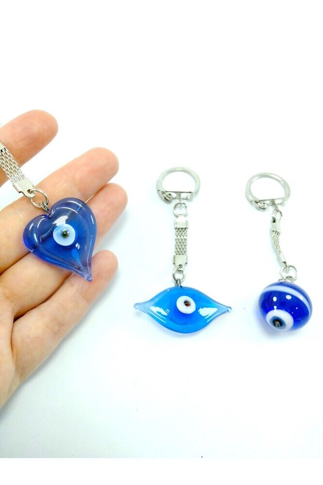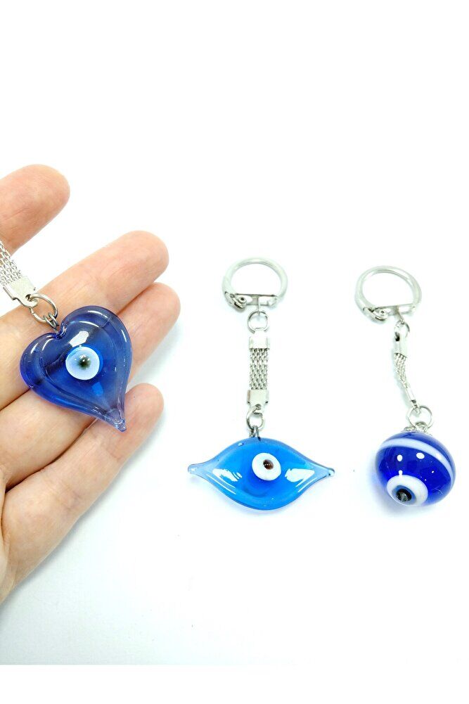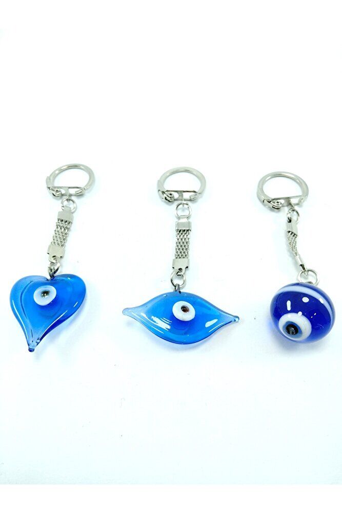 Cam Nazar Boncuğu Anahtarlık Üçlü Set El Yapımı Göz+kalp+küre Çizgili Anahtarlık Hediyelik Aksesuar