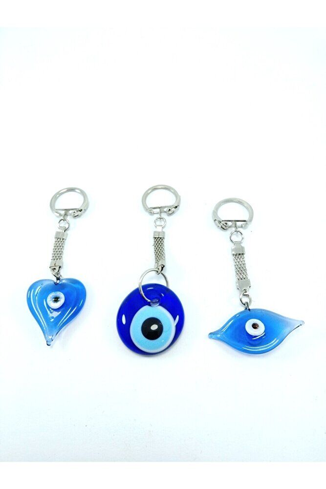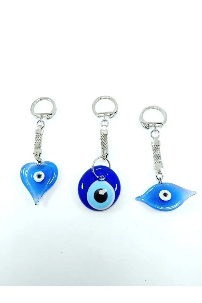 Cam Nazar Boncuğu Anahtarlık Üçlü Set El Yapımı Göz+kalp+sade Anahtarlık Hediyelik Aksesuar