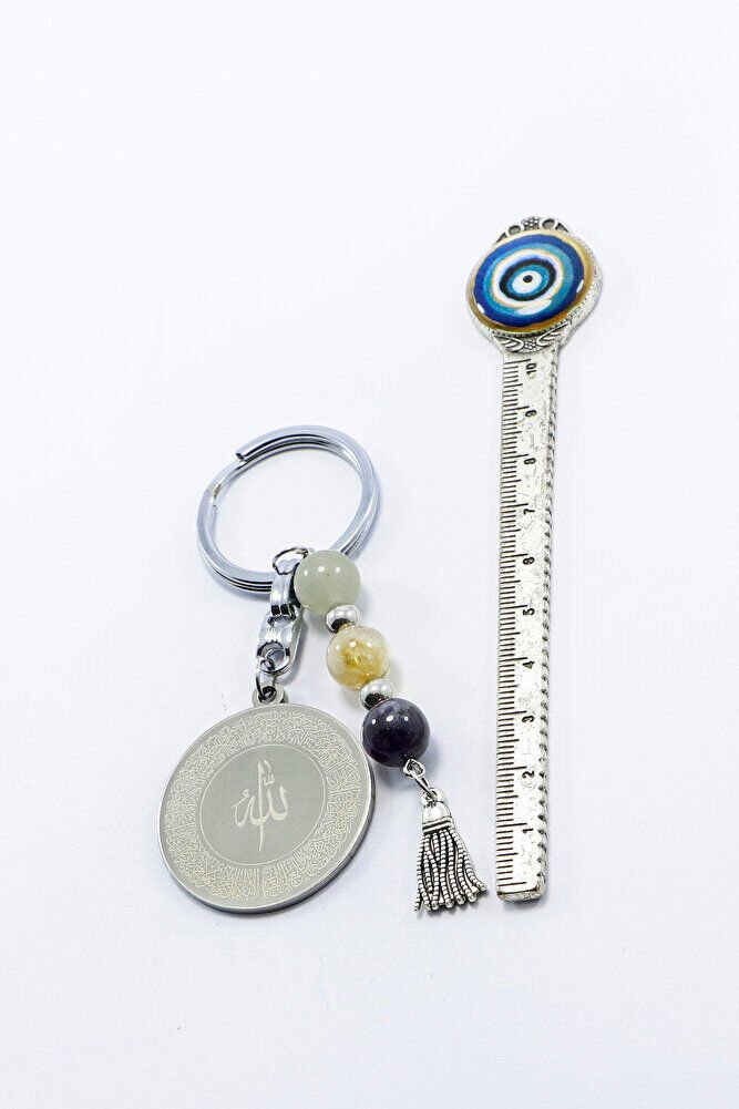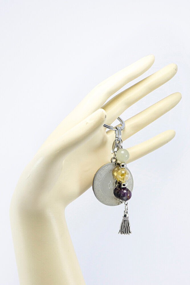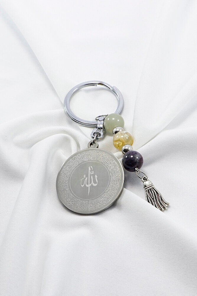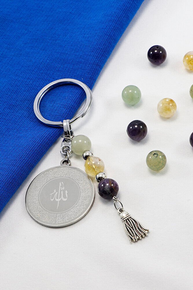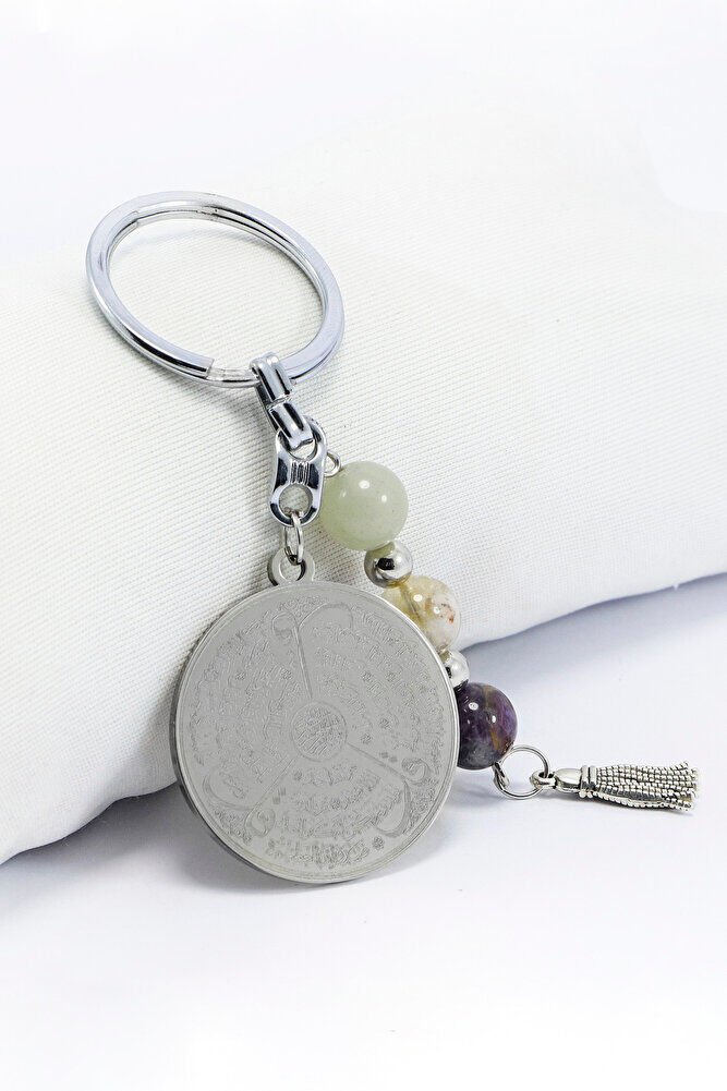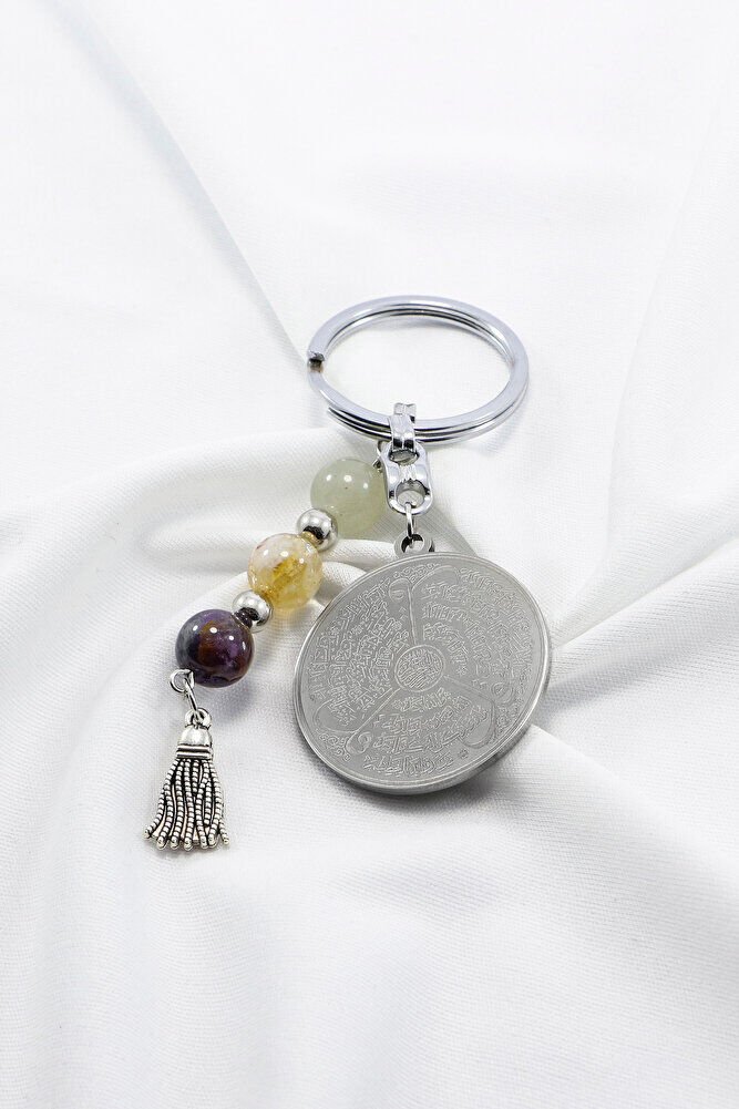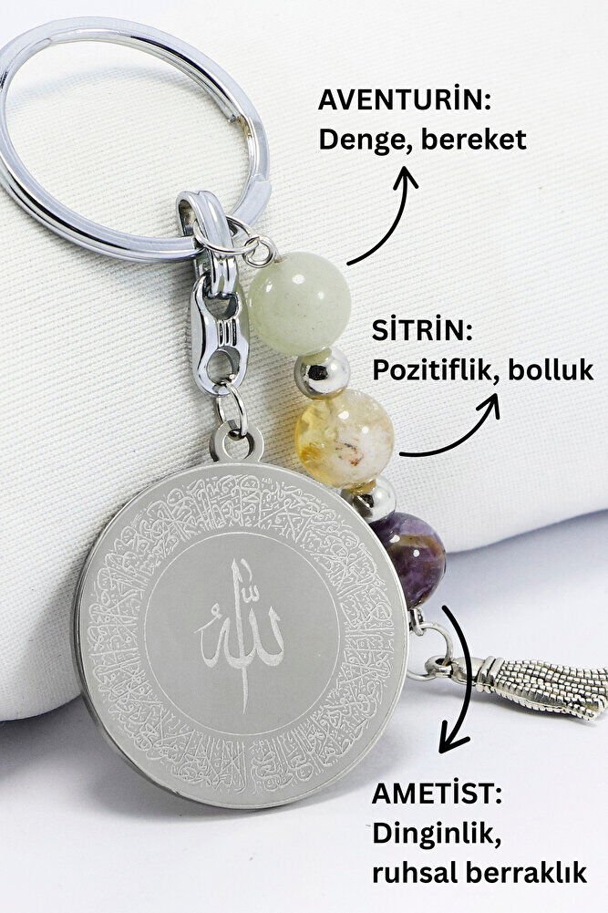Çelik Çift Taraflı Ayetel Kürsi Felak Nas İhlas Anahtarlık, Doğal Taş Aventurin, Sitrin, Ametist
