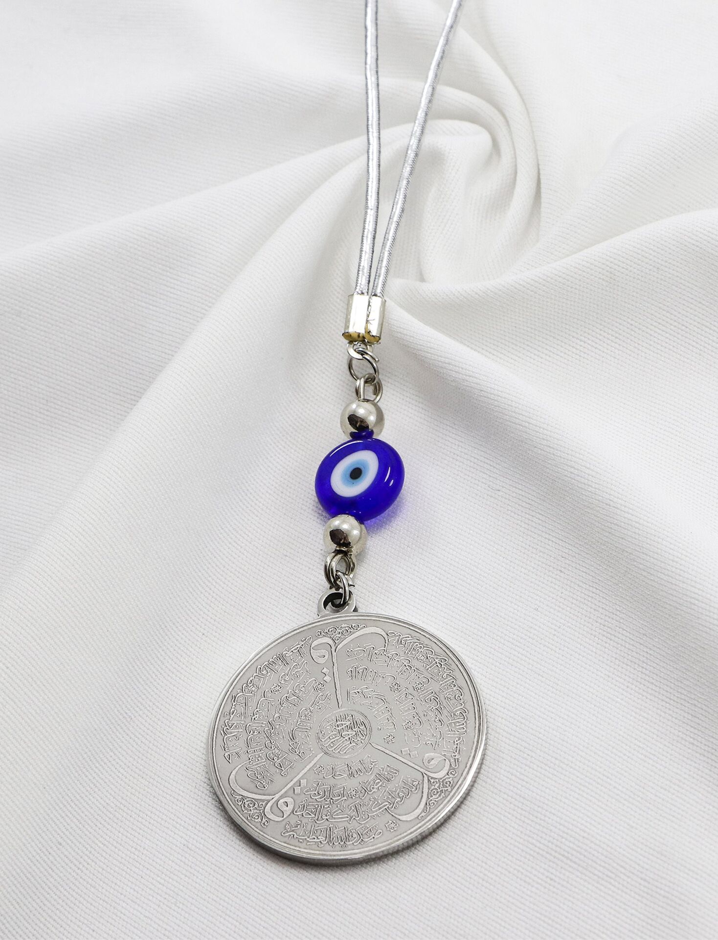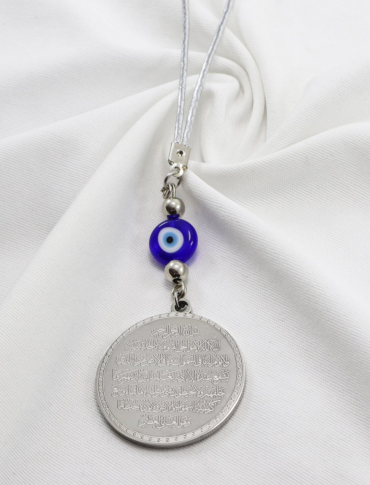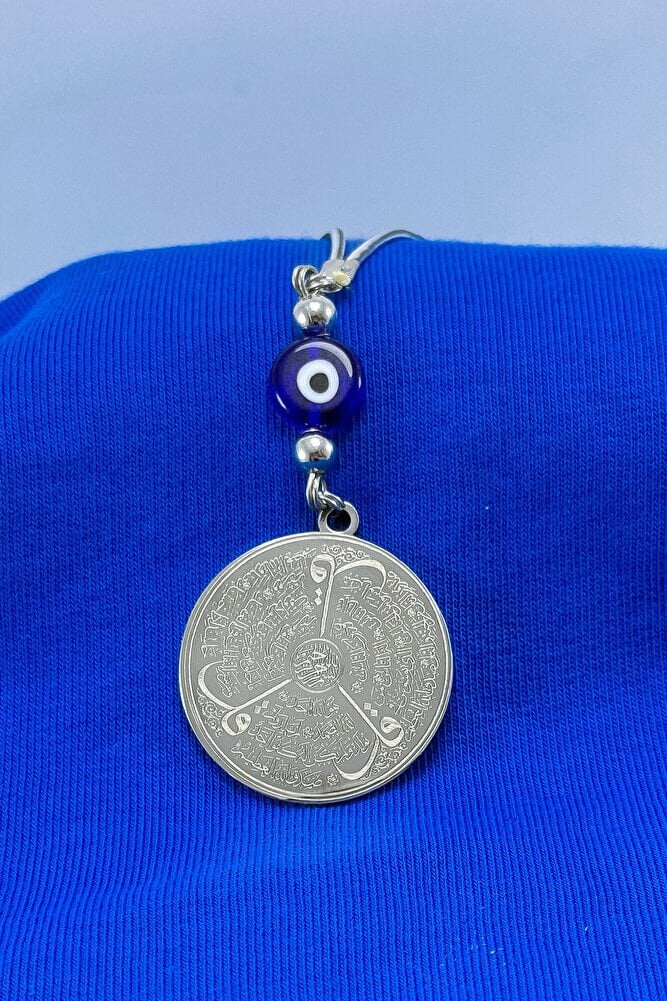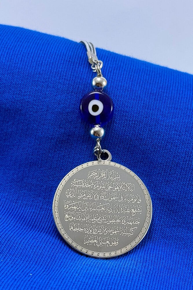 Dualar lazer kazıma tekniği ile kalıcı bir şekilde kazınmaktadır.; Yassı nazar boncuğu camdır.; Ürün el yapımıdır el yapımı olduğu için ufak farklılık ve düzensizlikler olasıdır.; Metalik ip elastiktir.; Elastik olduğu için her modele rahatlıkla takılabilmektedir.; Plaka gümüş renkli paslanmaz çeliktir.; Duaların tam görünmesi için siyah yansımadan faydalanılmıştır görselde gümüş ürünün siyah görülmesinin nedeni budur .; Çelik plaka 3,5 cm ölçülerindedir.; Ayetel Kürsi, İslam inancında en güçlü ve koruyucu dualardan biri olarak kabul edilir.; Ayetel Kürsi, Allah’ın büyüklüğünü ve egemenliğini ifade eden bir ayet olup, koruma ve manevi güç sağlamak amacıyla sıkça okunur.; Bu ayet, göklerde ve yerin her şeyinin Allah’a ait olduğunu vurgular ve şeytani etkilerden korunma sağlar.; Özellikle gece yatmadan önce okunmasının, güvende olma, zararlı enerjilerden korunma ve ruhsal huzur sağlama açısından büyük fayda verdiğine inanılır.; Aynı zamanda, Allah’ın her şeyi bildiği ve her şeyin O’na bağlı olduğu inancı ile kişiye manevi rahatlık ve güç verir.; Felak, Nas ve İhlas sureleri, İslam inancında korunma ve manevi güç sağlamak için okunan önemli dualardır.; Felak ve Nas sureleri, özellikle kötü gözlerden, nazardan ve şeytani etkilerden korunmak için okunur.; Felak suresi, karanlık güçlere karşı koruma sağlarken, Nas suresi de olumsuz düşünceler ve zararlı enerjilerden korunmayı sağladığına inanılır.; İhlas suresi ise, Allah’ın birliğini ve sınırsız gücünü ifade eder, bu sureye inanılır ki, kişi manevi huzur ve Allah’ın koruması altında olur.; Bu sureler, sıkça güven ve huzur arayışında olanlar için okunur ve ruhsal dengeyi sağlamak isteyenlere büyük fayda sağladığına inanılır.