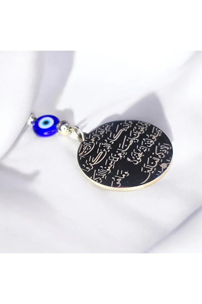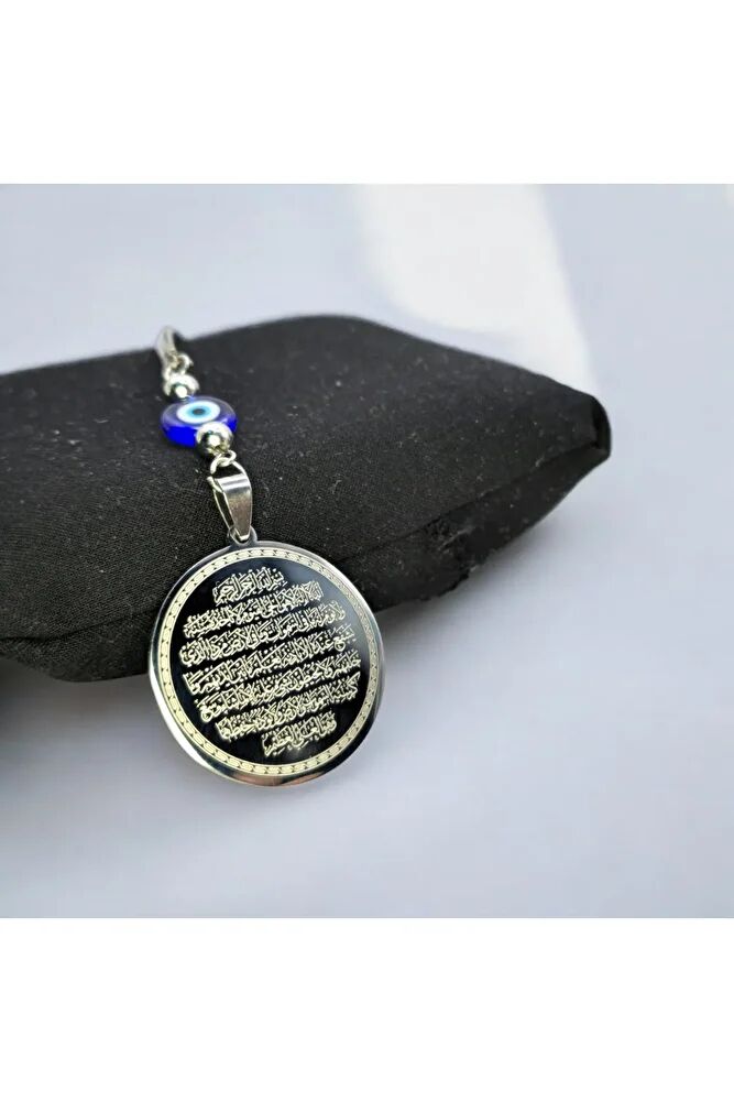 Dualar lazer kazıma tekniği ile kalıcı bir şekilde kazınmaktadır.; Yassı nazar boncuğu camdır.; Ürün el yapımıdır el yapımı olduğu için ufak farklılık ve düzensizlikler olasıdır.; Metalik ip elastiktir.; Elastik olduğu için her modele rahatlıkla takılabilmektedir.; Plaka gümüş renkli paslanmaz çeliktir.; Duaların tam görünmesi için siyah yansımadan faydalanılmıştır görselde gümüş ürünün siyah görülmesinin nedeni budur .; Çelik plaka 3,5 cm ölçülerindedir.; Ayetel Kürsi, Bakara Suresi'nin 255. ayetidir ve İslam inancında çok önemli bir yere sahiptir.; Bu ayet, Allah’ın kudretini, egemenliğini ve her şeyi bilen, her şeyin sahibi olan Yüce Varlık olduğunu vurgular.; Ayet, Allah'ın her şeyin üzerinde olduğunu, hiçbir gücün O’nun izni olmadan hareket edemeyeceğini belirtir.; İnanılır kabul edilen bir başka önemli husus da, bu ayetin kişiyi kötülüklerden koruyacağına, huzur ve güven vereceğine inanılmasıdır.; Müslümanlar, Ayetel Kürsi'yi sıkça okur ve çeşitli durumlarda korunma, dua ve huzur arayışı için kullanırlar.; Bu nedenle, hem manevi hem de koruyucu bir anlam taşır.; Nazar ayeti, İslam inancında kötü gözlerden ve olumsuz enerjilerden korunmak amacıyla okunan özel bir duadır.; İnanılır kabul edilir ki, nazar, bir kişinin üzerinde kötü niyetle bakılması sonucu, o kişinin hayatına olumsuz etkiler ve şanssızlık getirebilir.; Nazar ayeti, Allah’ın korumasına sığınarak, kişinin bu tür olumsuz etkilerden korunmasını sağlar.; Ayrıca, nazarın kişiye zarar vermemesi için Allah’ın kudretine ve ilahi gücüne olan inancı güçlendirir.; Bu dua, zihinsel huzur ve manevi güç sağladığına inanılır, bu nedenle sıkça evlerde, iş yerlerinde veya kişisel eşyalar üzerinde okunur.