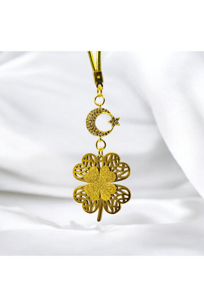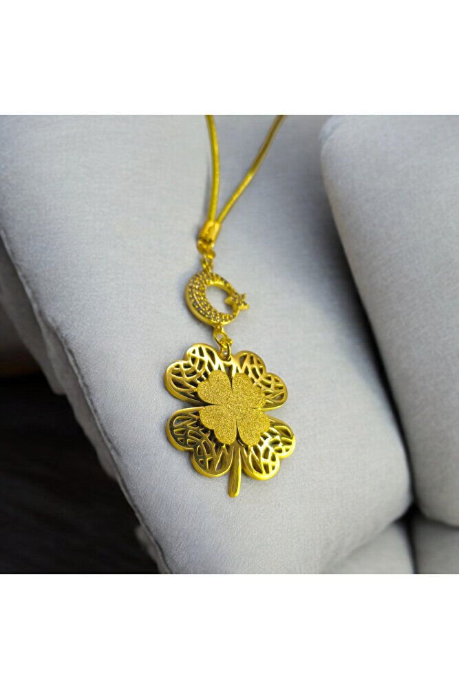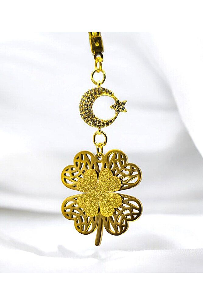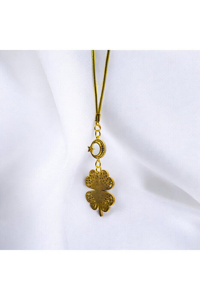 Çelik Dörtlü Yonca Dikiz Araba Süsü, Altın Kaplama Beyaz Nazar Boncuklu Araba Hediyesi