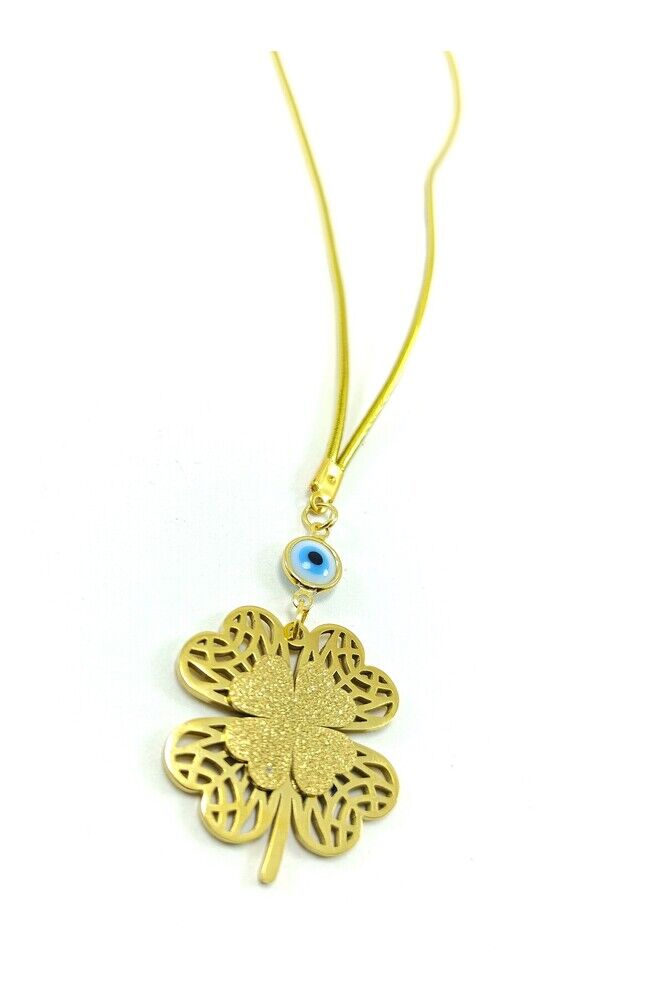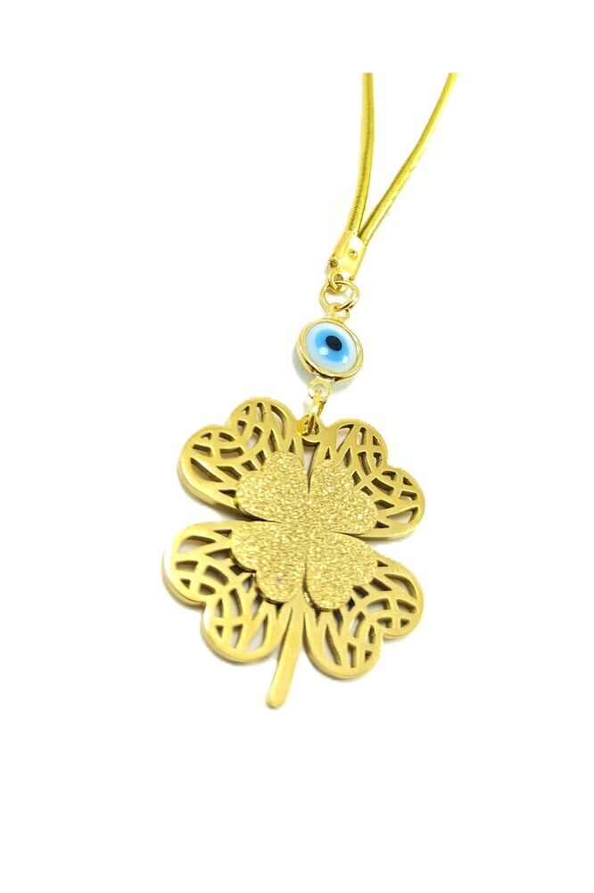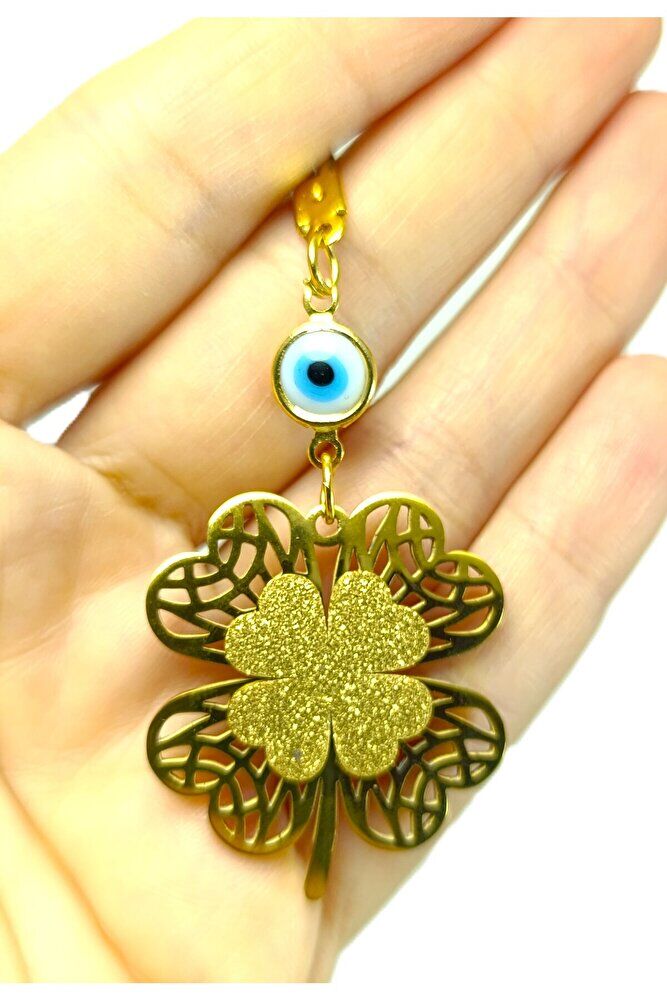 Metal yonca çeliktir.; ; Cam nazar boncuğu el yapımıdır.; Boncuğun çerçevesi ve diğer metal parçalar altın kaplamadır.; ; Metalik ip elastiktir.; ; Türk kültüründe geleneksel olarak"nazar boncuğu" olarak bilinen bu güçlü sembolün kötülükleri savuşturduğuna ve iyi şans getirdiğine inanılır.; ; Her cam boncuk yetenekli zanaatkarlar tarafından titizlikle işlenir ve bu her parçayı benzersiz kılar.; ; Nazar boncuğunu, müşterilerimize duvar süsü, anahtarlık, araba aksesuarı, kapı süsü, magnet gibi farklı formatlarda sunuyoruz.; ; Nazar tılsımının dünyadaki çeşitli kültürlerde farklı isimleri vardır.; ; Arapça'da "aynal-hasud" veya "haset gözü", Yunanca'da "mati" olarak bilinir.; ; Adı ne olursa olsun, nazar boncuğunun gücüne olan inanç evrenseldir.;