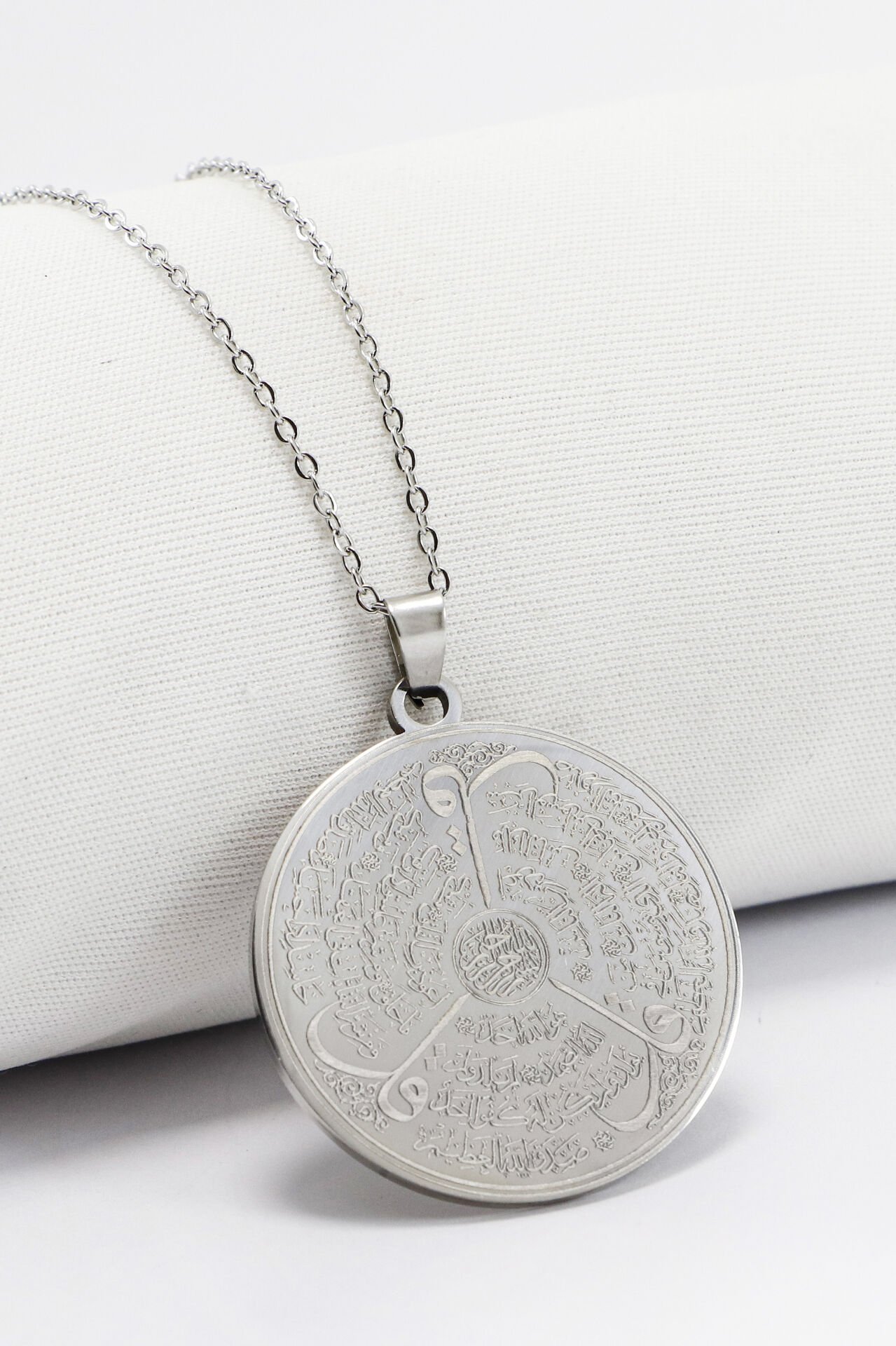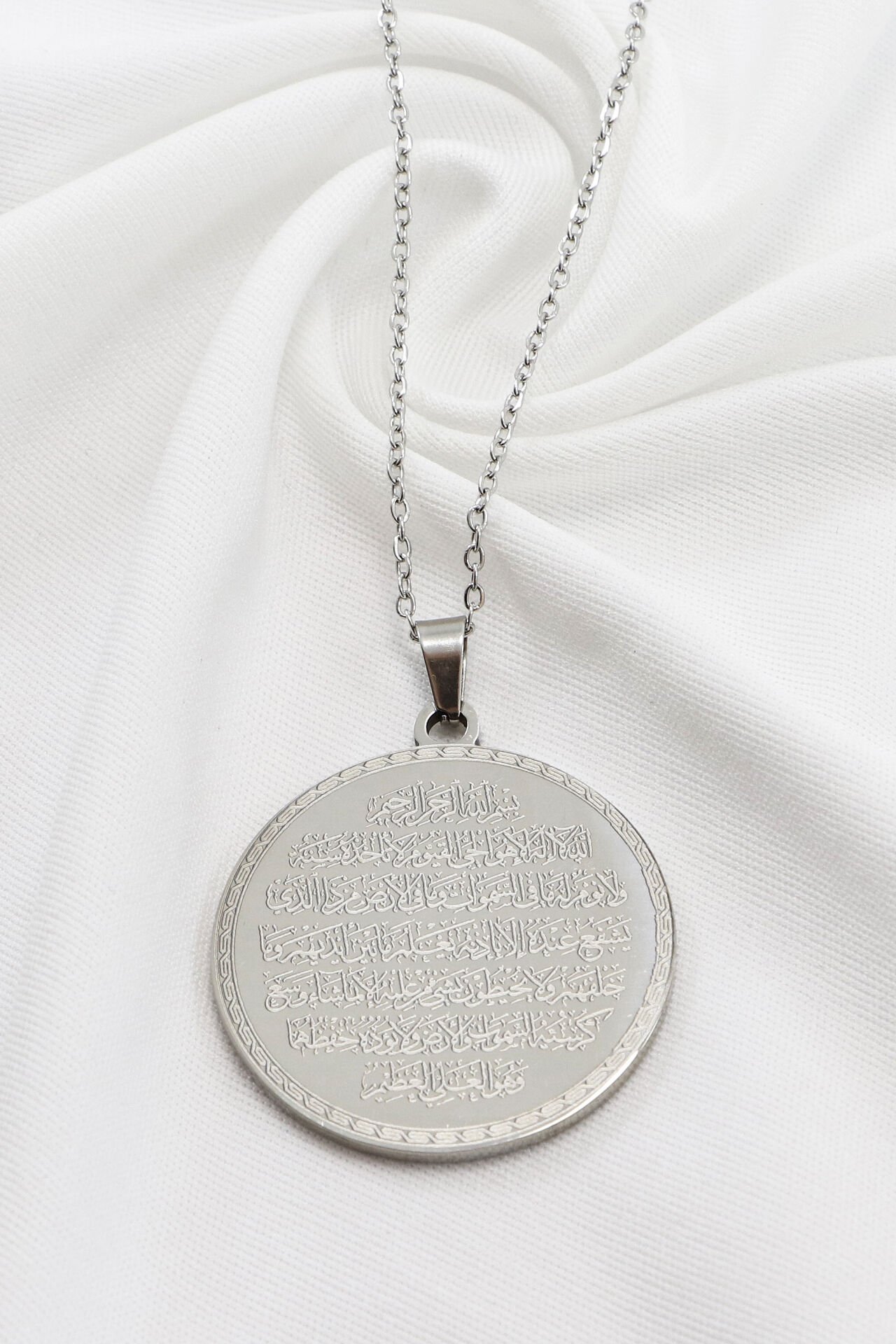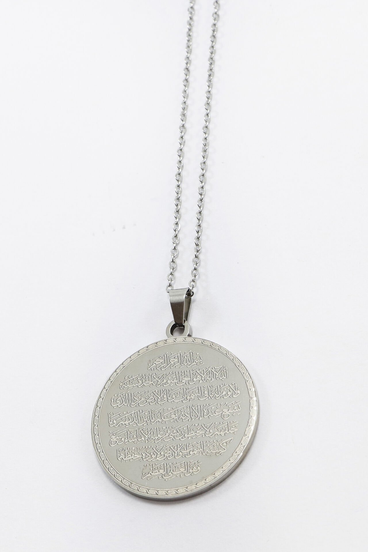 Çift Taraflı Çelik Kolye, Ayetel Kürsi Arka Yüzünde Felak Nas İhlas Yazılı Kolye Plaka 3,5cm