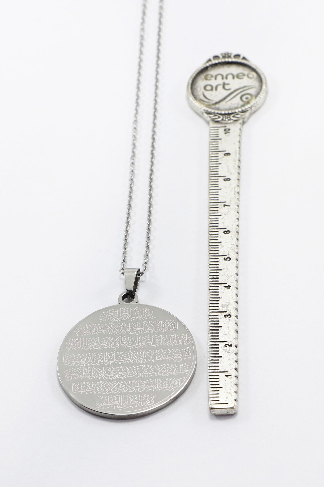 Çift Taraflı Çelik Kolye, Ön Yüzünde Allah Lafzı Ayetel Kürsi Arka Yüzünde Klasik Nazar Ayeti EN05947