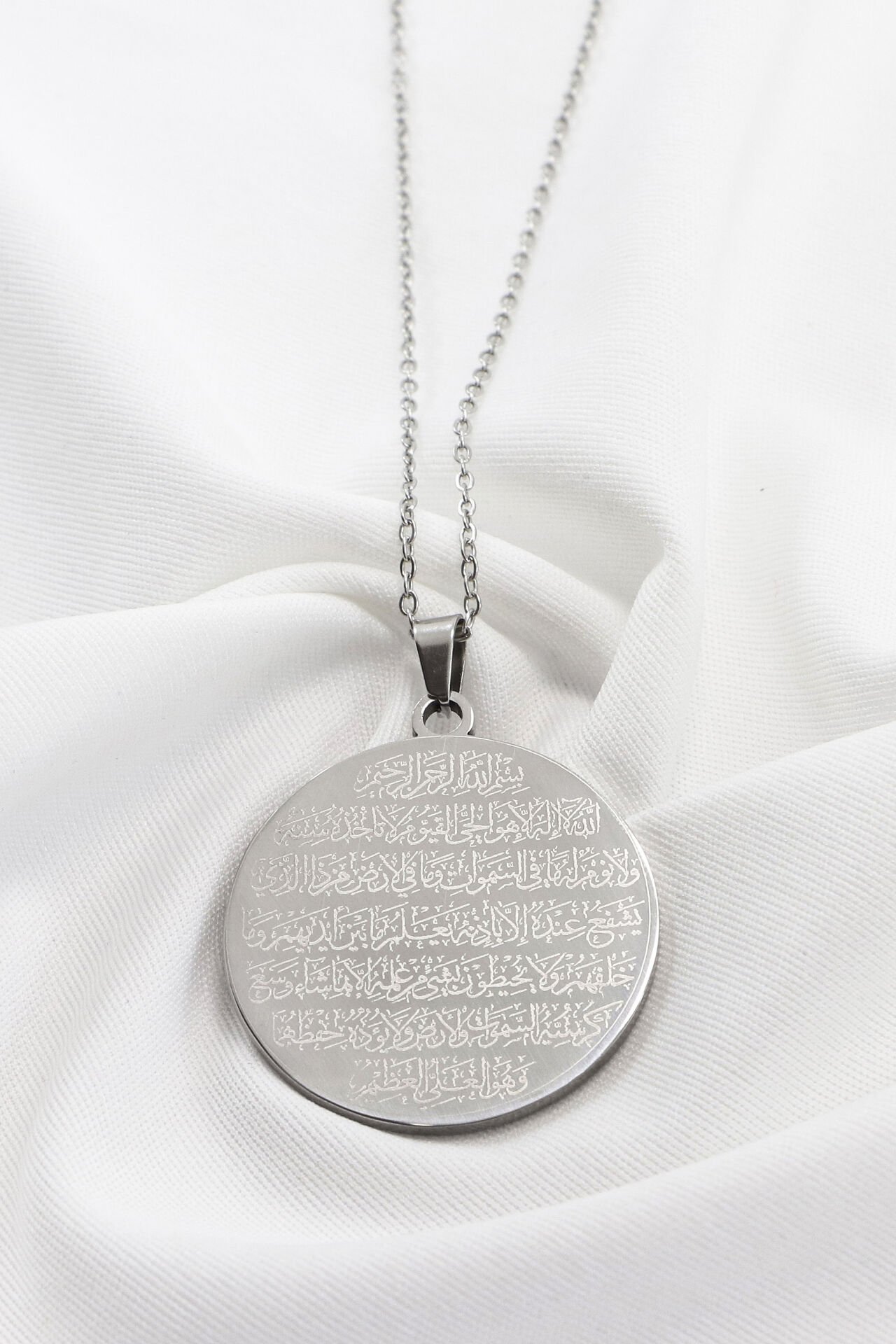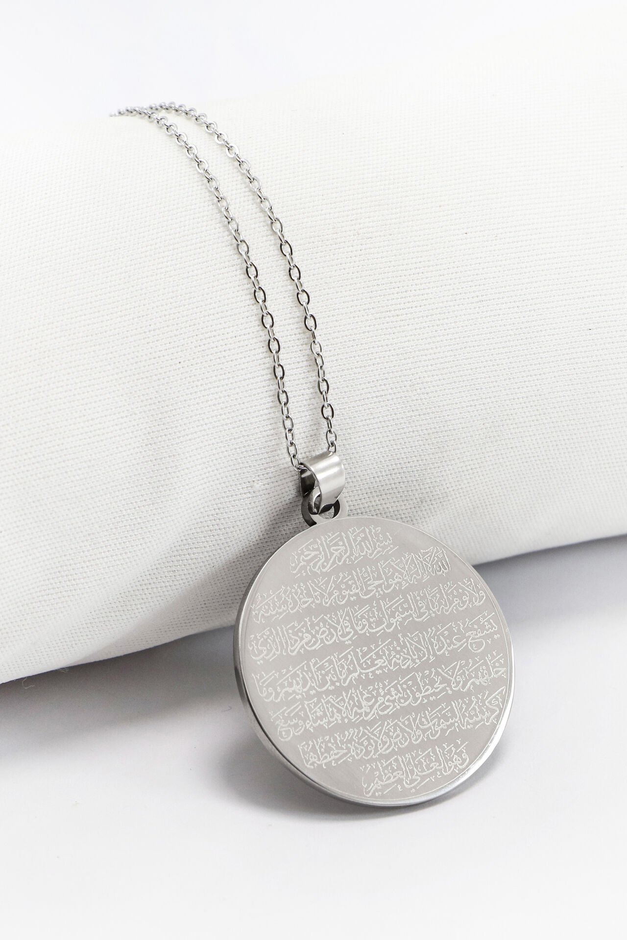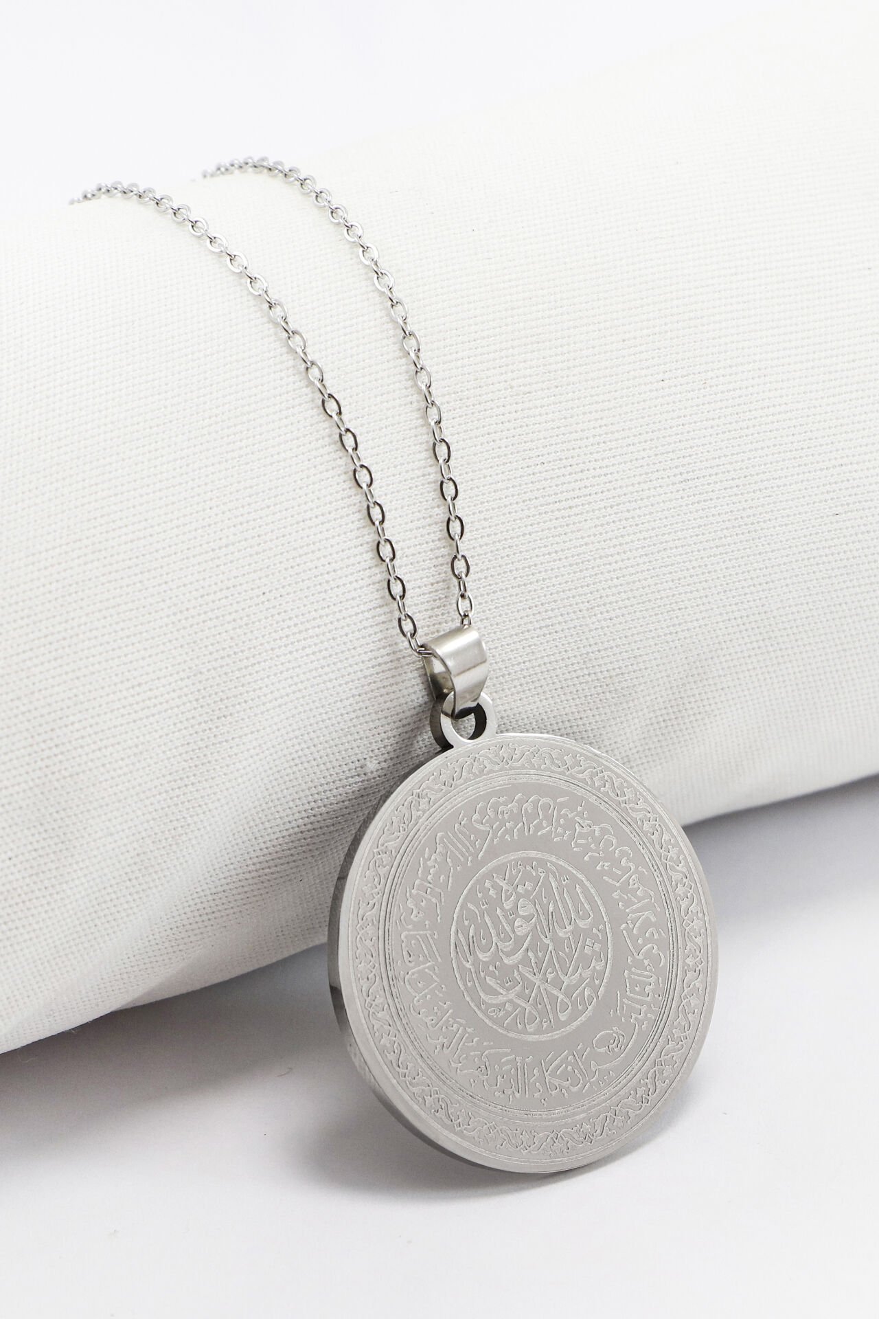 Çift Taraflı Çelik Kolye, Ön Yüzünde Allah Lafzı Ayetel Kürsi Arka Yüzünde Klasik Nazar Ayeti
