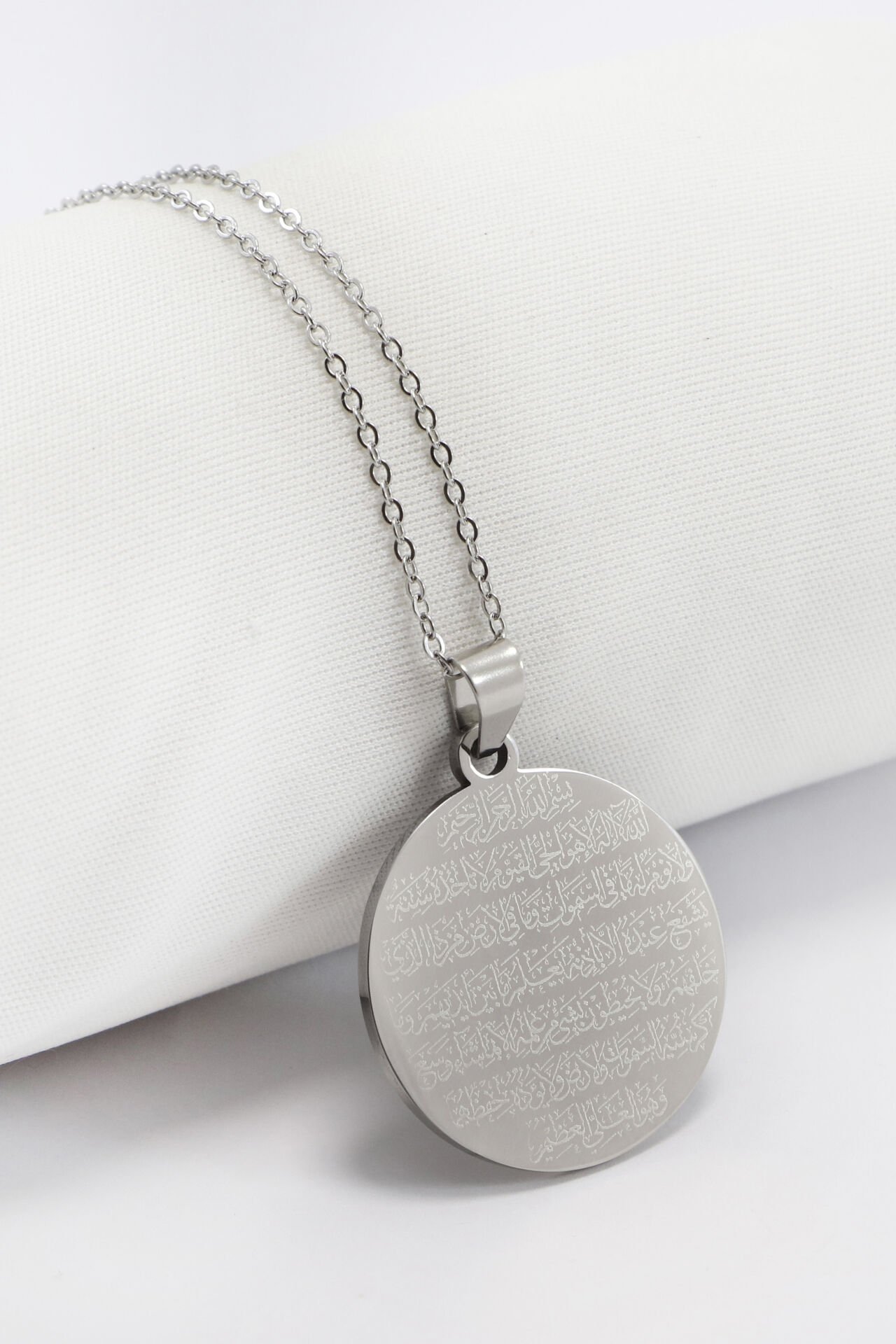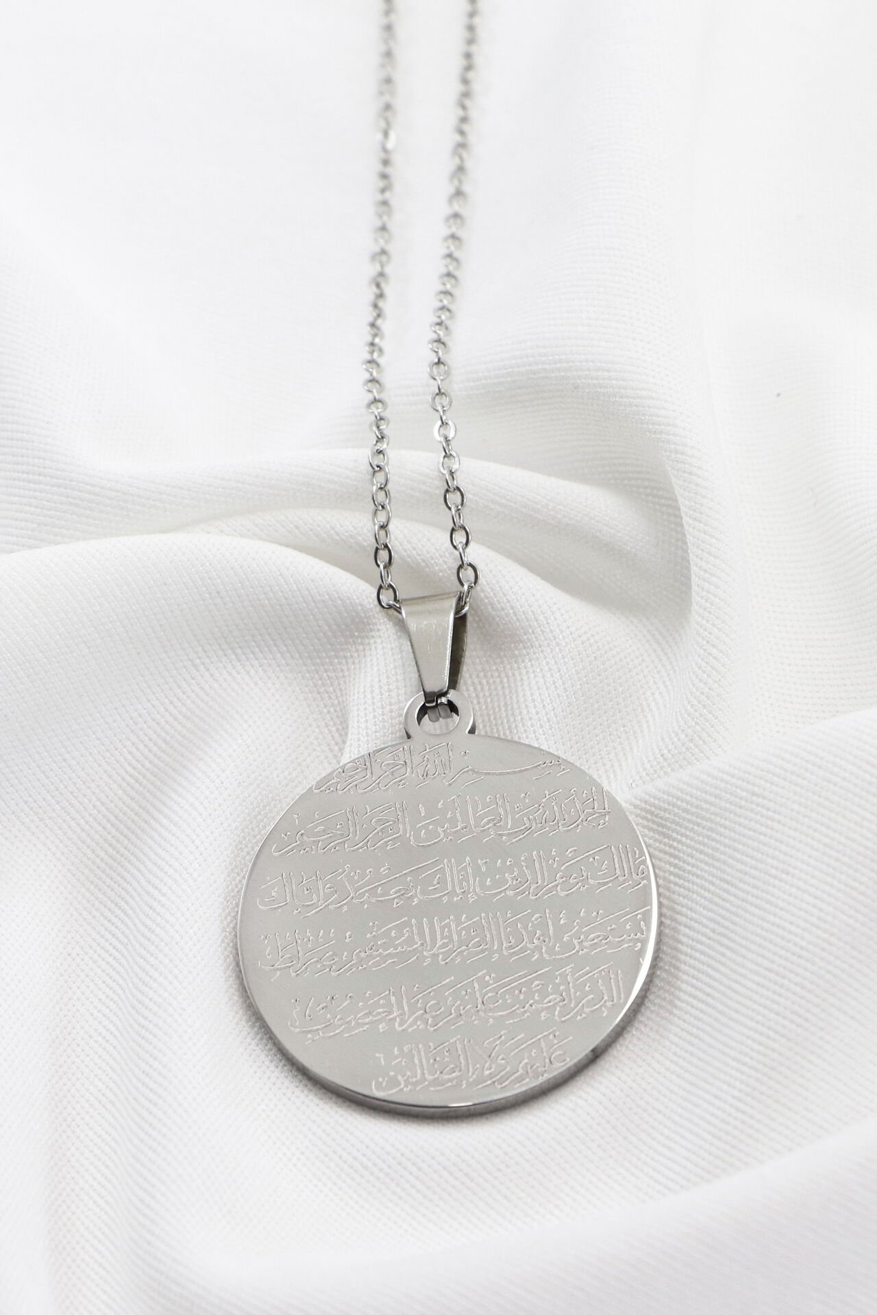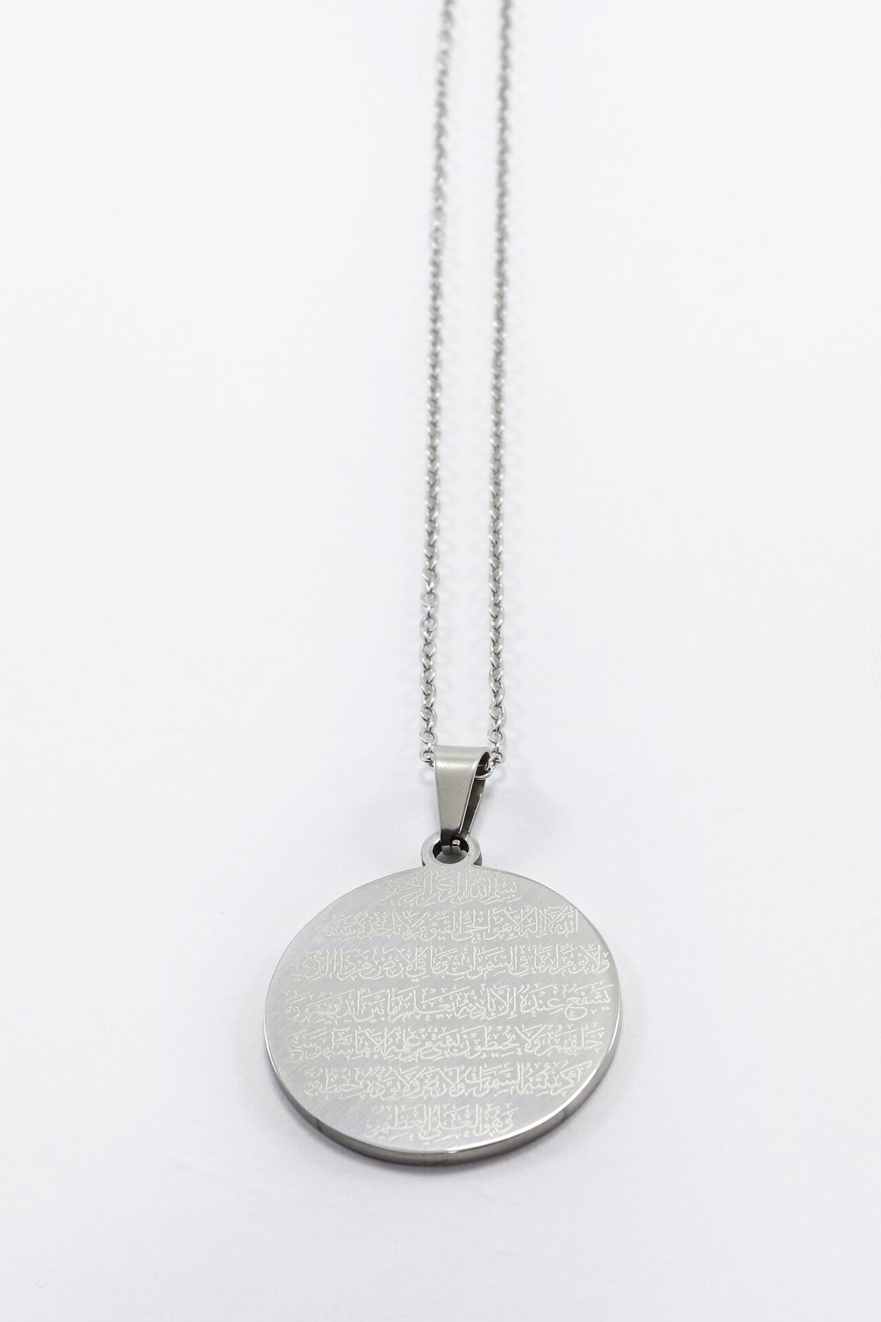 Çift Taraflı Çelik Kolye, Ön Yüzünde Fatiha Duası Arka Yüzünde Ayetel Kürsi Kolye (3 cm plaka) EN005950