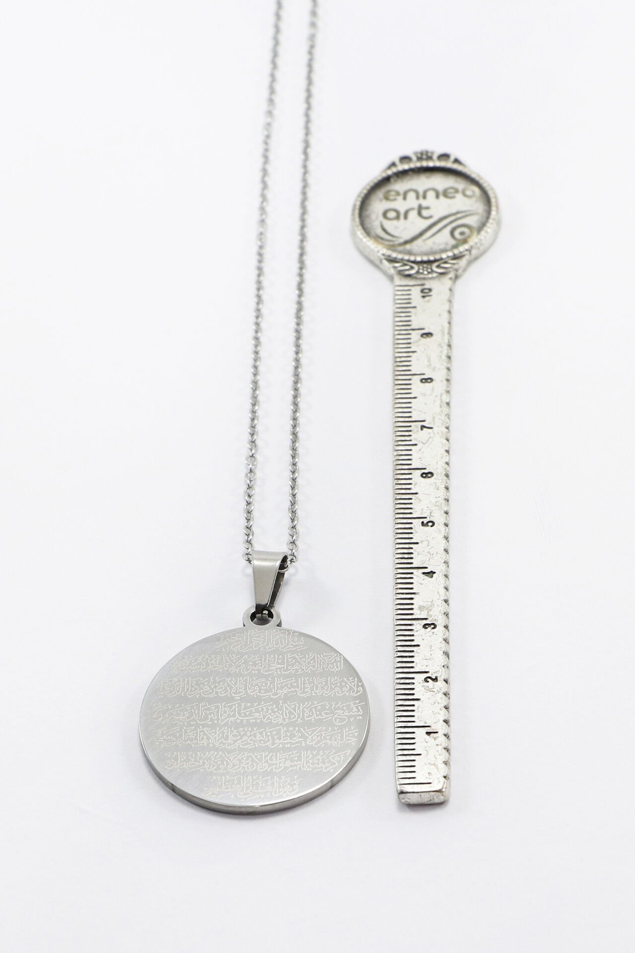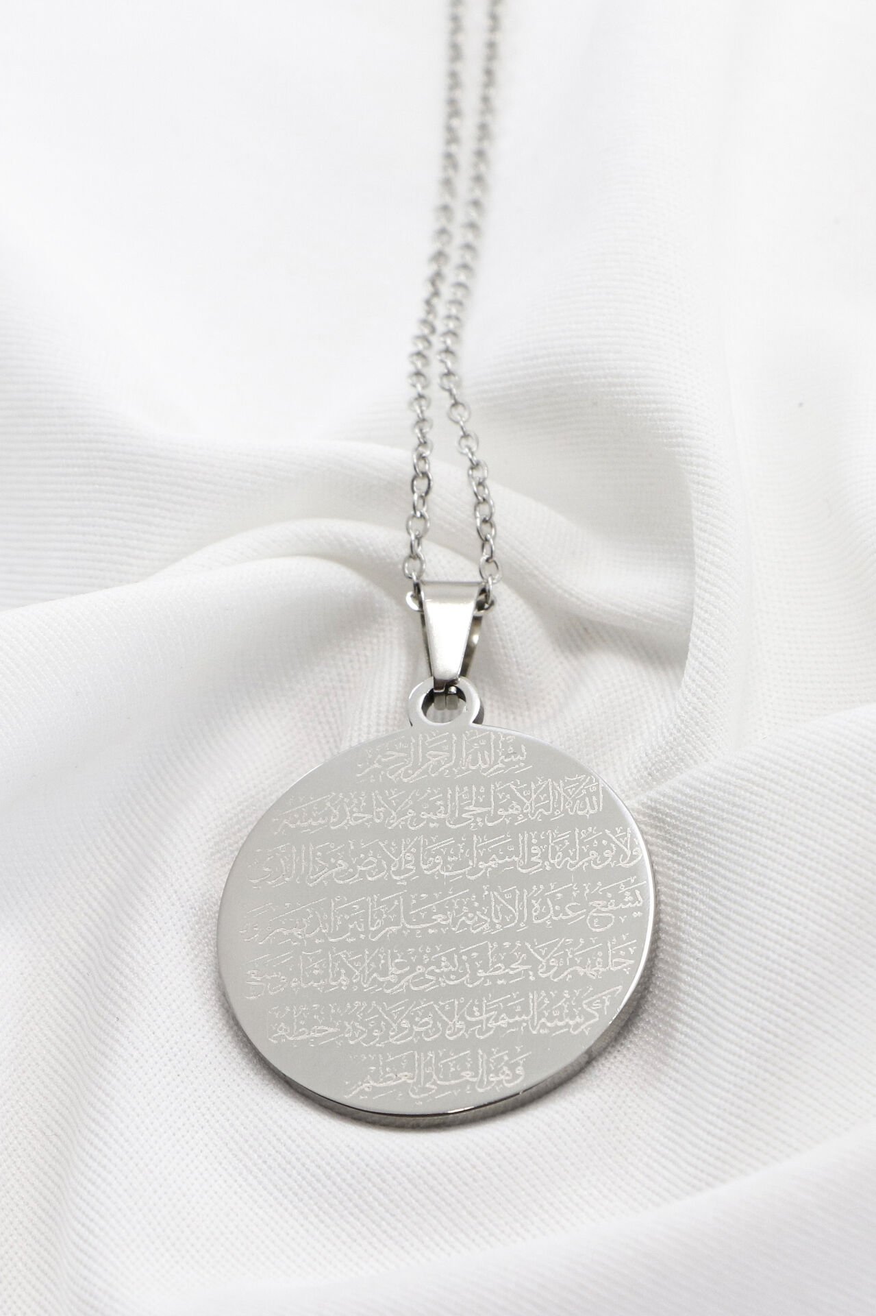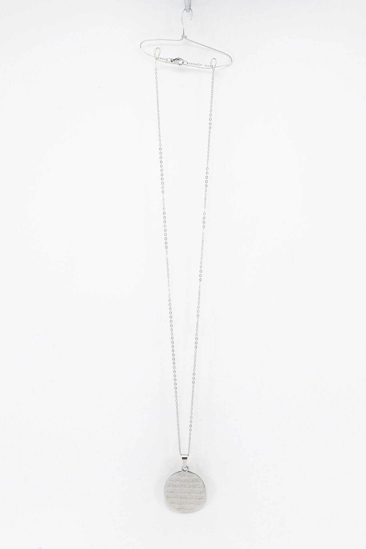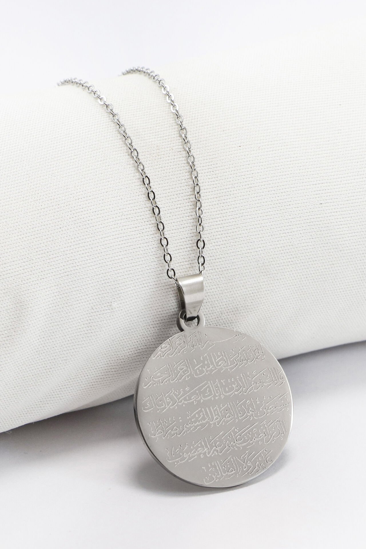 Çift Taraflı Çelik Kolye, Ön Yüzünde Fatiha Duası Arka Yüzünde Ayetel Kürsi Kolye (3 cm plaka) EN005950