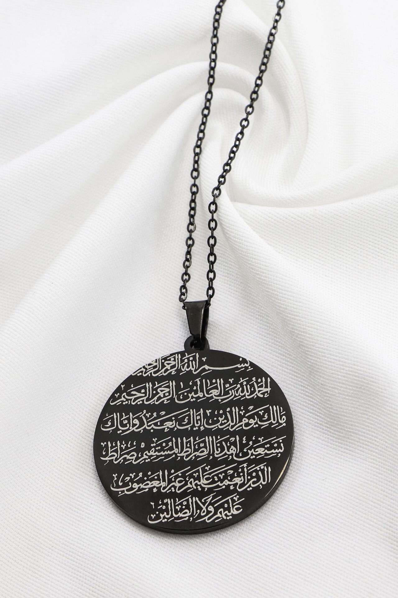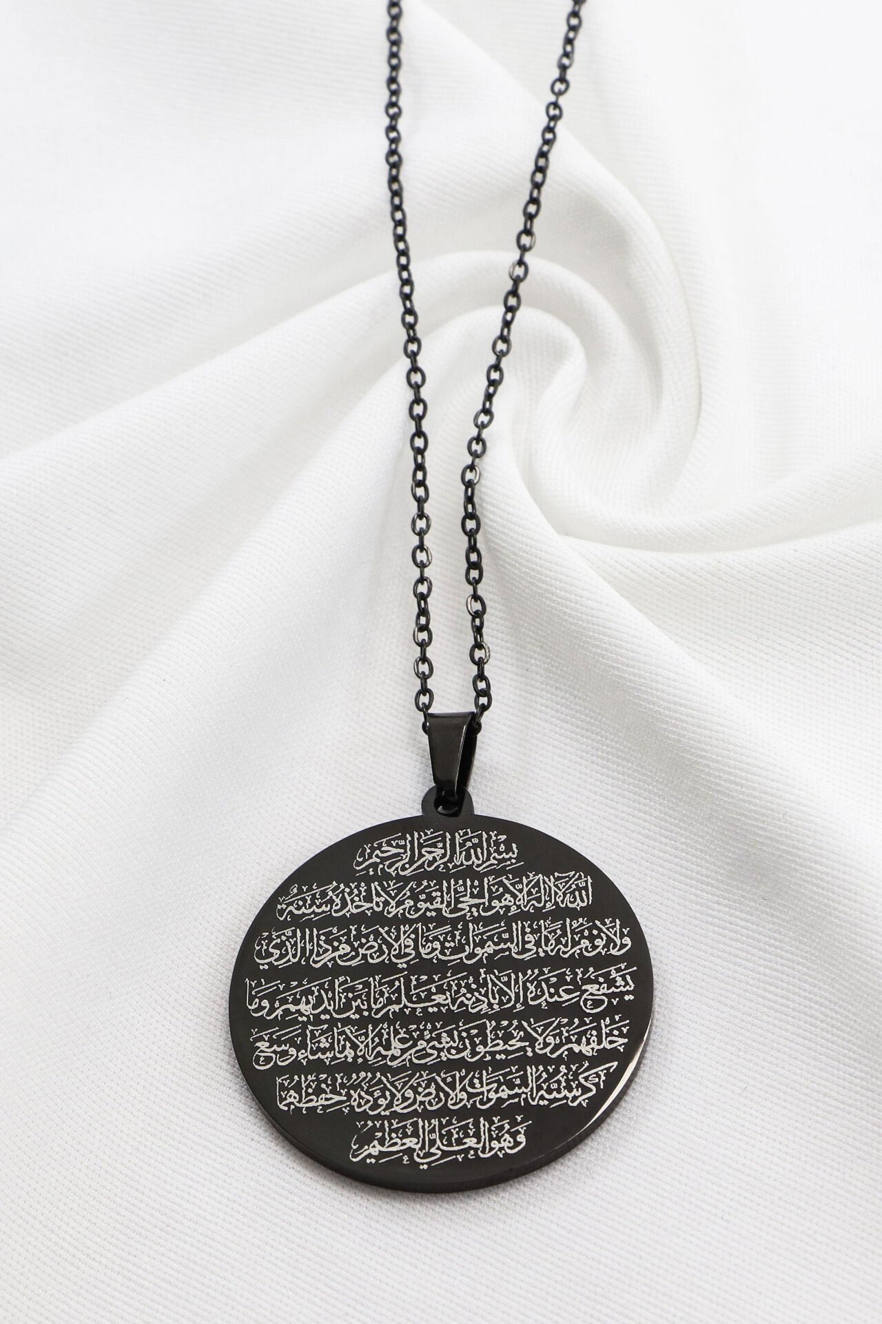 Siyah renkli çift taraflı çelik kolye, ön yüzünde Ayetel Kürsi, arka yüzünde Fatiha Suresi bulunmaktadır.