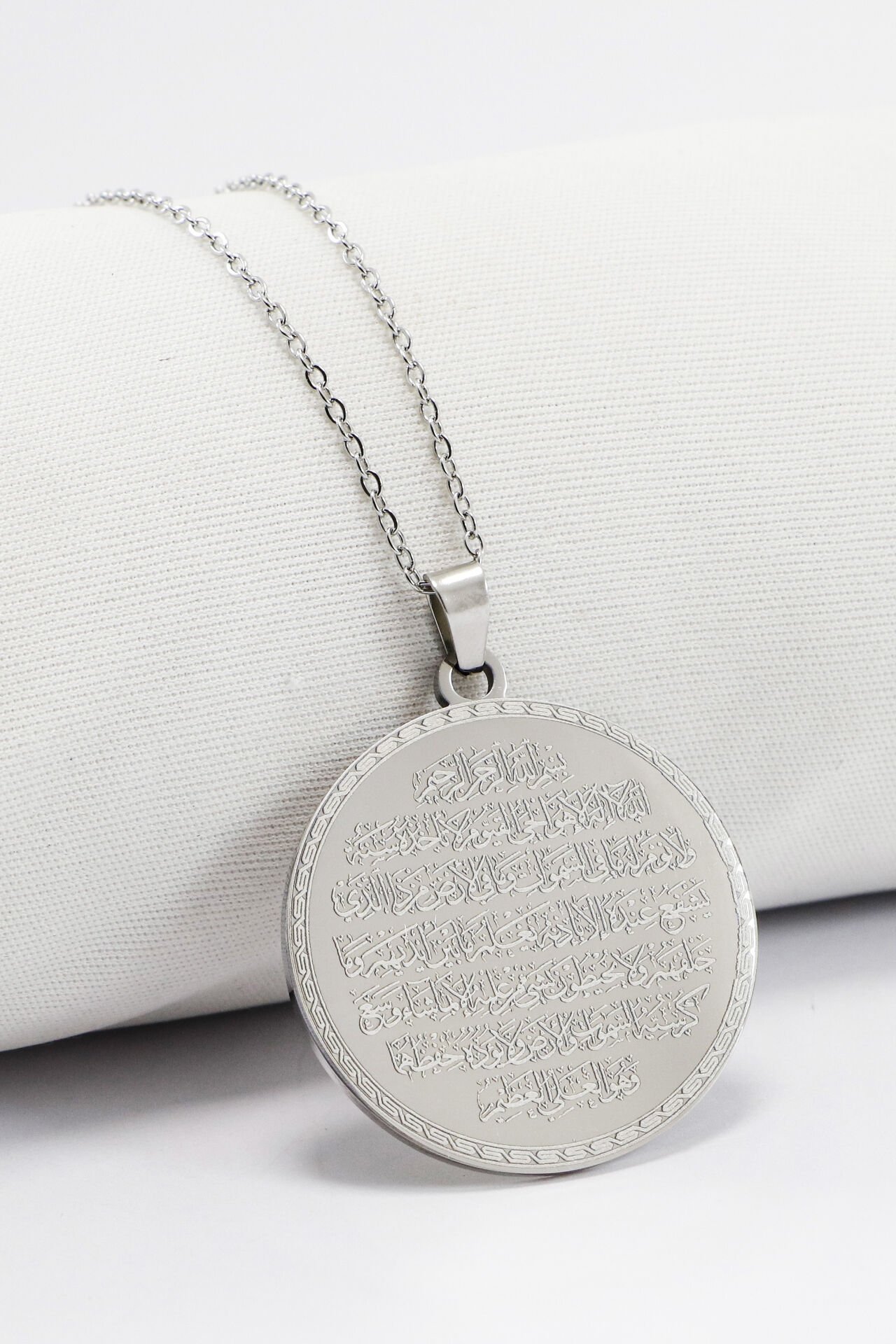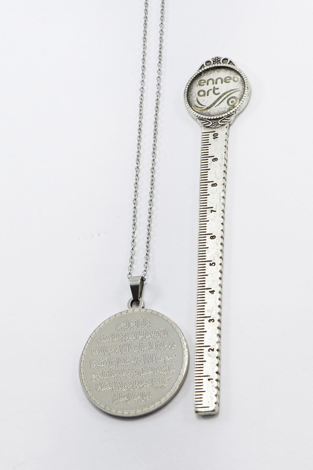 Çift Taraflı Çelik Kolye, Ön Yüzünde Ayetel Kürsi Arka Yüzünde Nazar Ayeti Yazılı Kolye Plaka 3,5cm