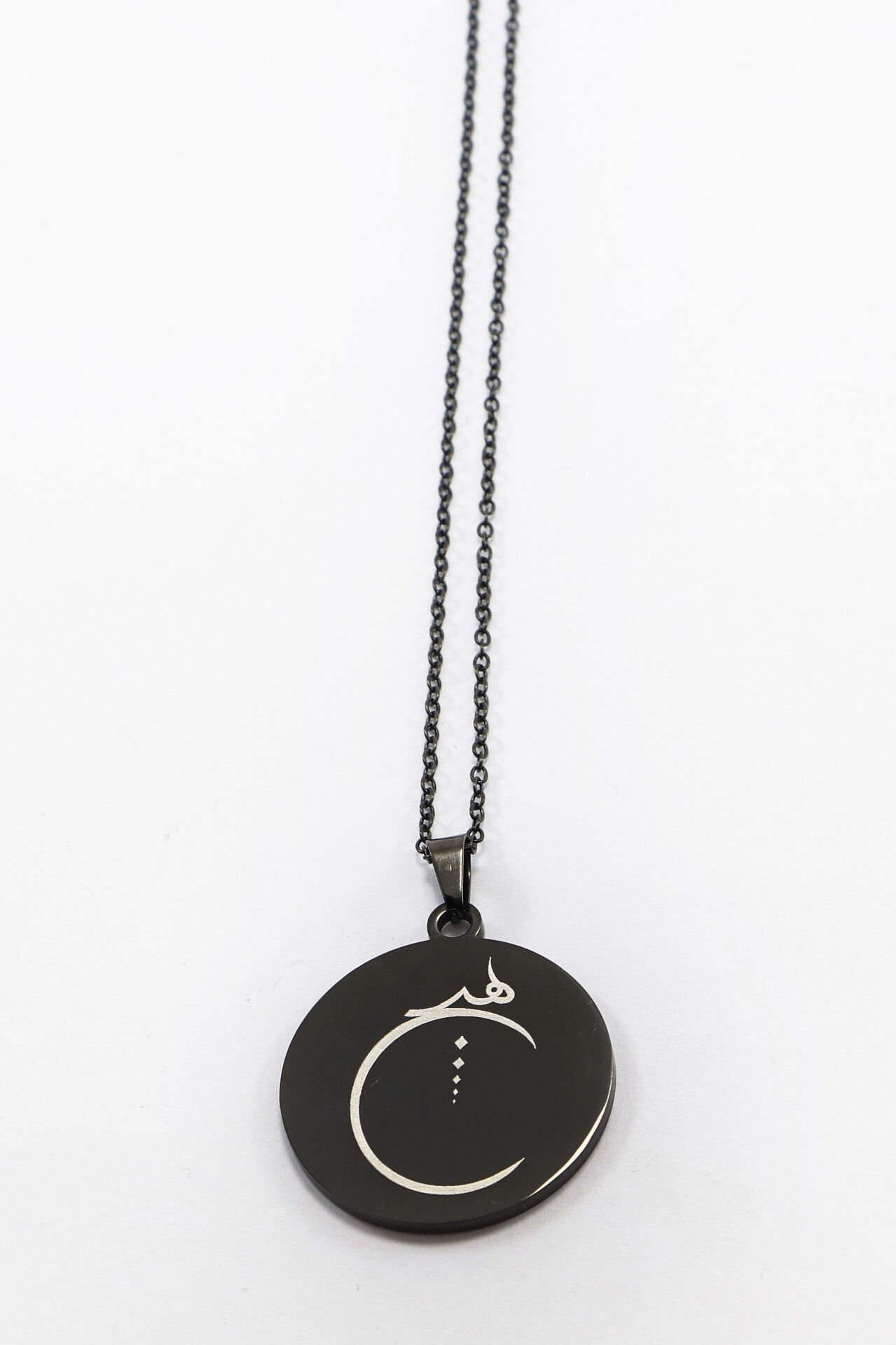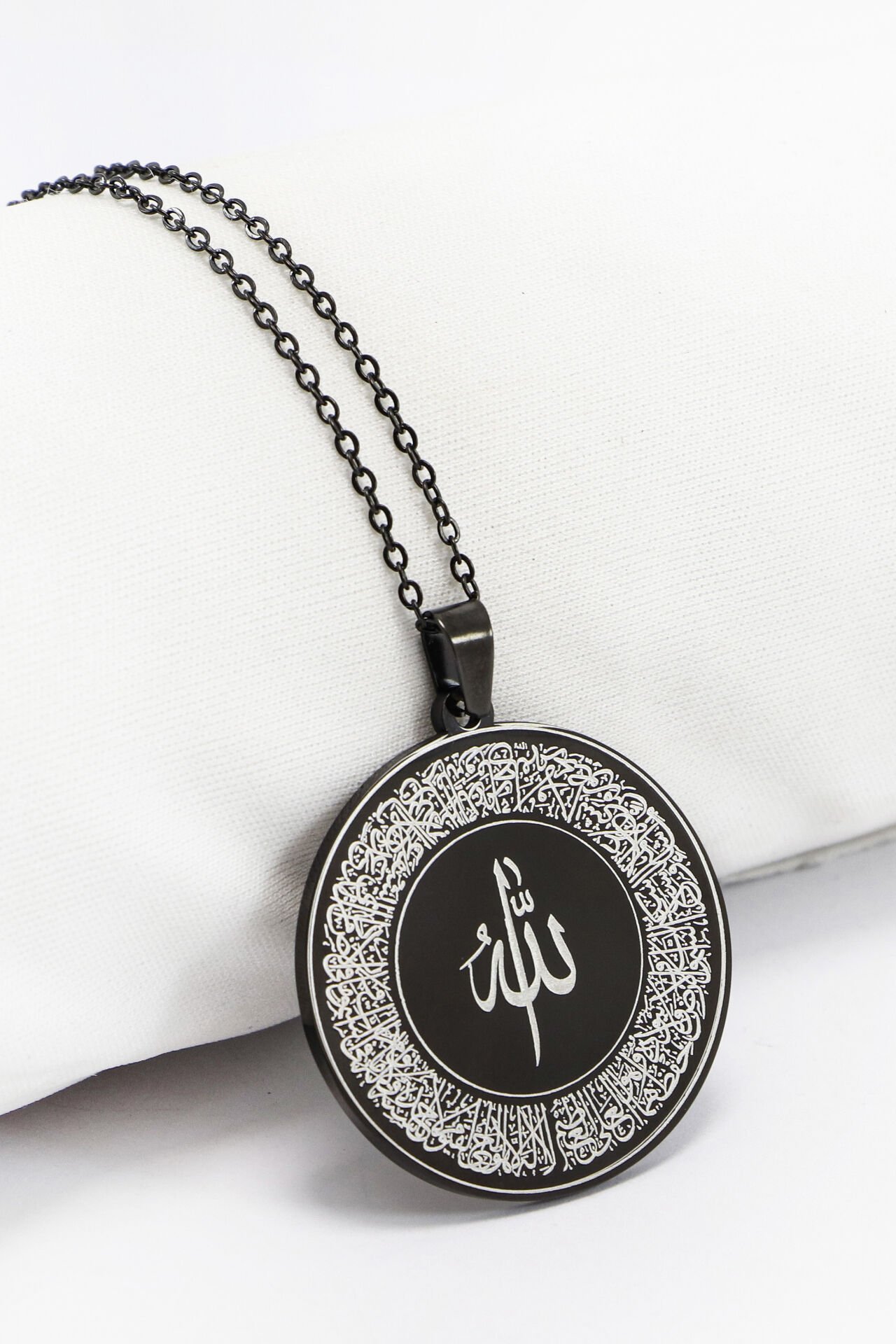 Siyah renkte tasarlanmış çift taraflı çelik kolyenin ön yüzünde hat sanatıyla işlenmiş Ayetel Kürsi yer alırken, arka yüzünde ise anlam derinliği taşıyan “Hiç” kelimesi yine hat formunda yer almaktadır.