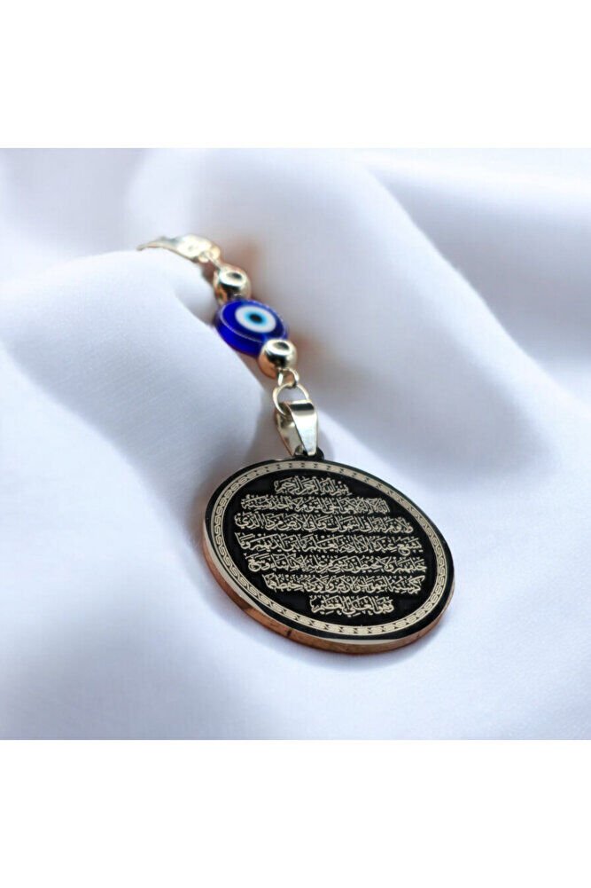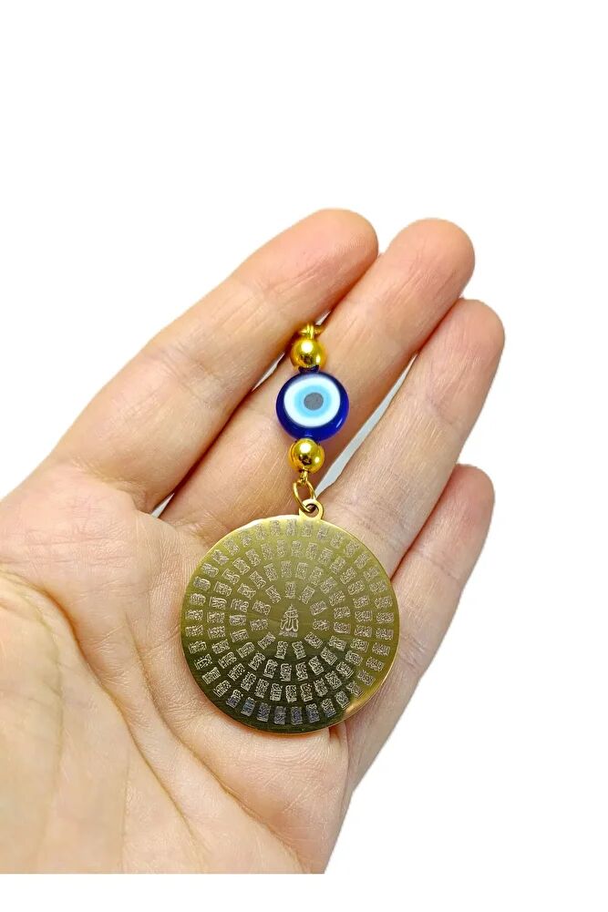 Ürün el yapımıdır.; ; Gold renkli ip esnektir.; ; El yapımı olduğu için ufak farklılık ve düzensizlikler olasıdır.; ; Bir tarafında Nazar Ayeti diğer tarafında Ayetel Kürsi bulunmaktadır.; ; Türk kültüründe geleneksel olarak"nazar boncuğu" olarak bilinen bu güçlü sembolün kötülükleri savuşturduğuna ve iyi şans getirdiğine inanılır.; ; Her cam boncuk yetenekli zanaatkarlar tarafından titizlikle işlenir ve bu her parçayı benzersiz kılar.; ; Nazar boncuğunu, müşterilerimize duvar süsü, anahtarlık, araba aksesuarı, kapı süsü, magnet gibi farklı formatlarda sunuyoruz.; Pozitif enerji getirmek ve nazardan korumak için evinize, arabanıza veya ofisinize asın.; ; Nazar tılsımının dünyadaki çeşitli kültürlerde farklı isimleri vardır.; ; Arapça'da "aynal-hasud" veya "haset gözü", Yunanca'da "mati" olarak bilinir.; ; Adı ne olursa olsun, nazar boncuğunun gücüne olan inanç evrenseldir.;