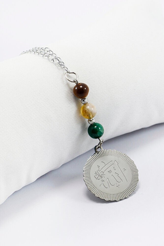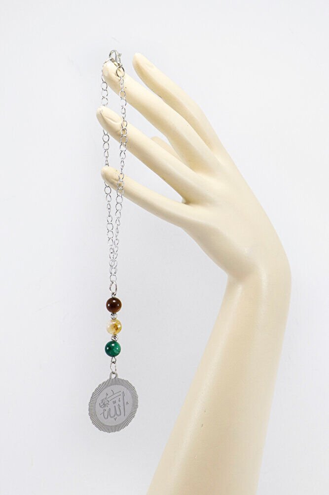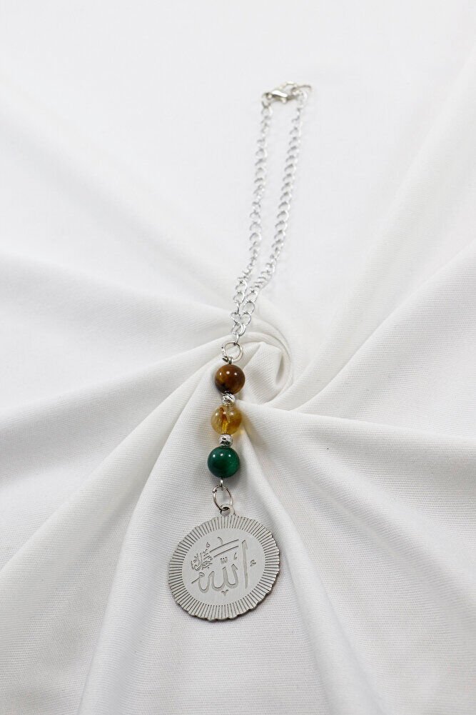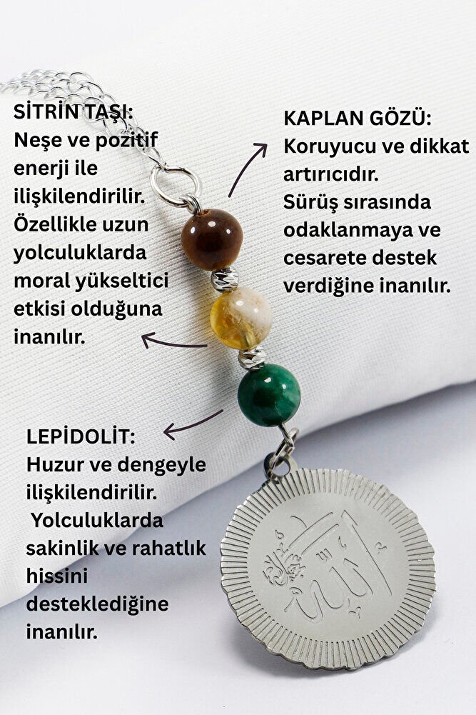 Doğal Taşlı Çelik Allah Lafzı Araba Dikiz Ayna Süsü, Kaplan Gözü, Sitrin Taşı, Lepidolit 8mm