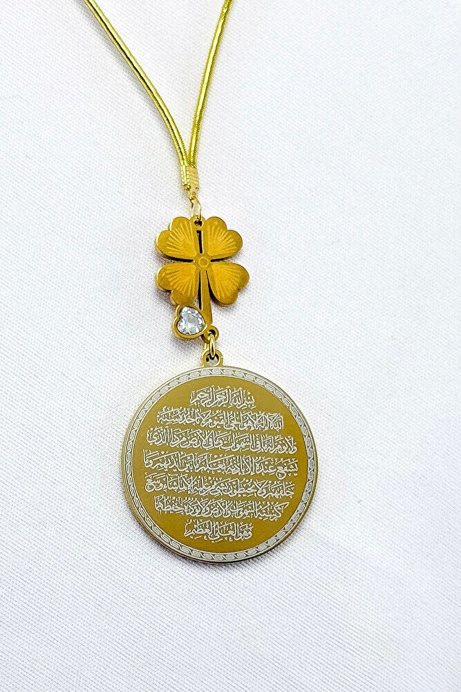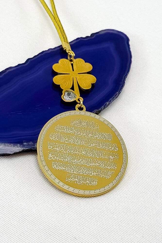 Dualar lazer kazıma tekniği ile kalıcı bir şekilde kazınmaktadır.; Dört yapraklı şans yoncası paslanmaz çeliktir ve tek taraflıdır.; Ürün el yapımıdır el yapımı olduğu için ufak farklılık ve düzensizlikler olasıdır.; İp elastiktir.; Elastik olduğu için her modele rahatlıkla takılabilmektedir.; Plaka altın renkli paslanmaz çeliktir.; Ürün üzerinde bulunan metaller komple paslanmaz çeliktir.; Çelik plaka 3,5 cm ölçülerindedir.; Plaka çift taraflıdır.; Bir yüzünde Ayetel Kürsi diğer yüzünde ise Felak Nas İhlas bulunmaktadır.; Felak, Nas ve İhlas sureleri, İslam inancında korunma ve manevi güç sağlamak için okunan önemli dualardır.; İnanılır kabul edilir ki, Felak ve Nas sureleri, özellikle kötü gözlerden, nazardan ve şeytani etkilerden korunmak için okunur.; Felak suresi, karanlık güçlere karşı koruma sağlarken, Nas suresi de olumsuz düşünceler ve zararlı enerjilerden korunmayı sağlar.; İhlas suresi ise, Allah ın birliğini ve sınırsız gücünü ifade eder, bu sureye inanılır ki, kişi manevi huzur ve Allah ın koruması altında olur.; Bu sureler, sıkça güven ve huzur arayışında olanlar için okunur ve ruhsal dengeyi sağlamak isteyenlere büyük fayda sağladığına inanılır.; Ayetel Kürsi, İslam inancında en güçlü ve koruyucu dualardan biri olarak kabul edilir.; Ayetel Kürsi, Allah ın büyüklüğünü ve egemenliğini ifade eden bir ayet olup, koruma ve manevi güç sağlamak amacıyla sıkça okunur.; Bu ayet, göklerde ve yerin her şeyinin Allah a ait olduğunu vurgular ve şeytani etkilerden korunma sağlar.; Özellikle gece yatmadan önce okunmasının, güvende olma, zararlı enerjilerden korunma ve ruhsal huzur sağlama açısından büyük fayda verdiğine inanılır.; Aynı zamanda, Allah ın her şeyi bildiği ve her şeyin O na bağlı olduğu inancı ile kişiye manevi rahatlık ve güç verir.;