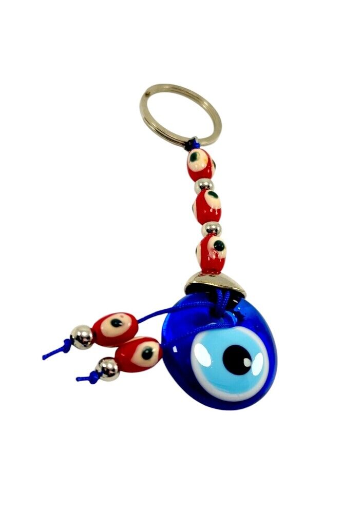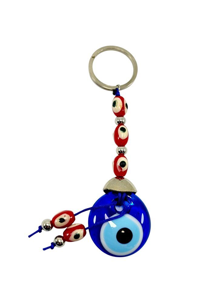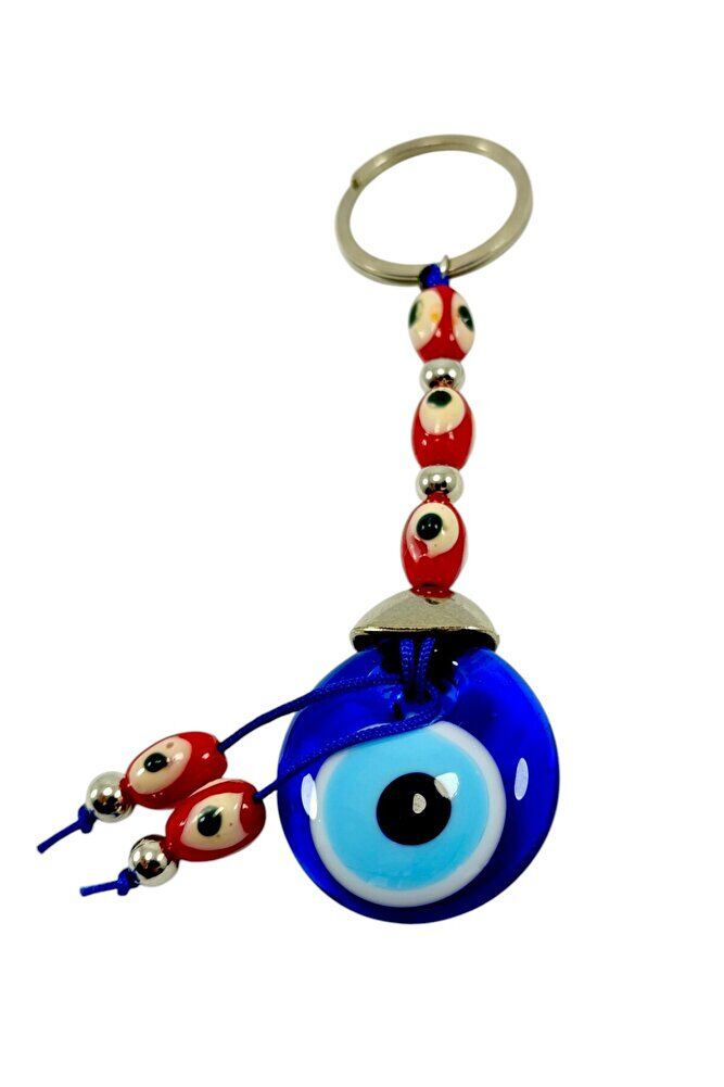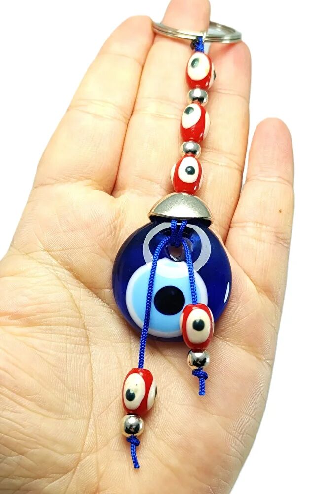 Ürün el yapımıdır, El yapımı olduğu için ufak farklılık ve düzensizlikler olasıdır.; ; Ortadaki büyük nazar boncuğu el yapımı camdır.; Diğer küçük kırmızı olanlar ise plastiktir.; ; Cam nazar boncuğu 3-3,5 cm arasında.; Anahtarlık boyutu 10 cm ölçülerindedir.; ; Nazar boncuğu, halk arasında kötü gözlerden korunma amacıyla kullanılan geleneksel bir semboldür ve çeşitli kültürlerde inanç ve güç taşır.; İnanılır kabul edilir ki, nazar boncuğu, olumsuz enerjilerden ve şeytani bakışlardan kişiyi korur.; Özellikle güzel, başarılı ya da dikkat çeken kişilerin üzerinde kötü gözlerin etkili olabileceğine inanılır ve nazar boncuğu bu enerjiyi geri yansıtarak sahibini korur.; Çoğu kültürde, nazar boncuğu şans ve mutluluk getirdiğine, negatif etkilerden uzak tutarak kişiye huzur ve denge sağladığına inanılır.; Bu sebeple, evlerde, iş yerlerinde ya da kişisel eşyalar üzerinde sıkça kullanılır.