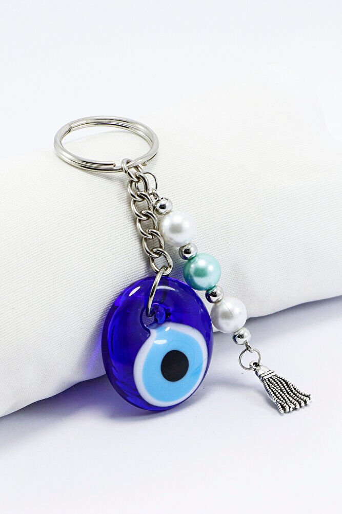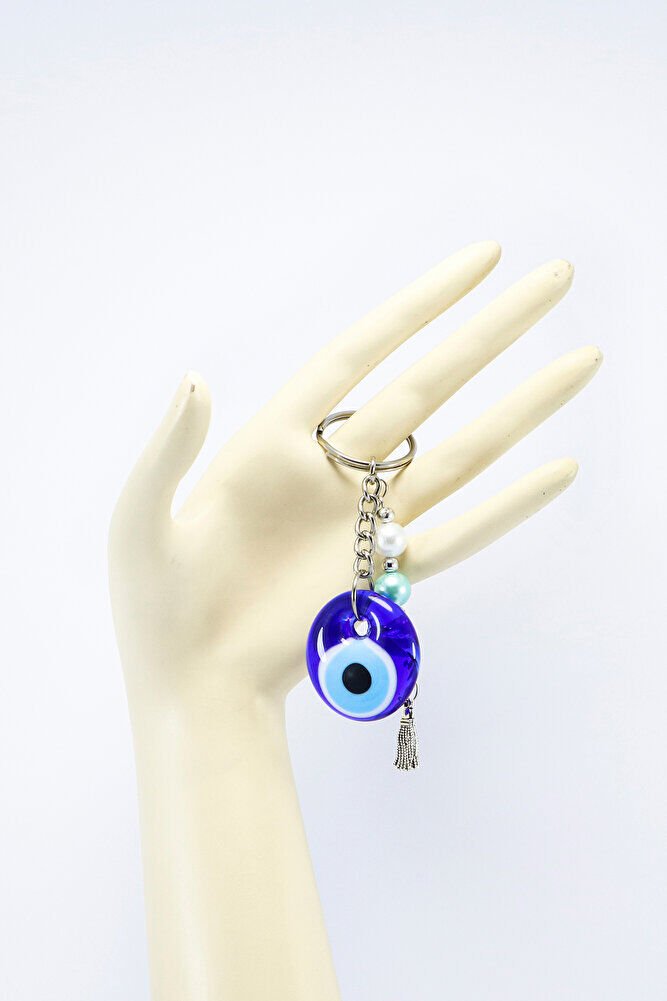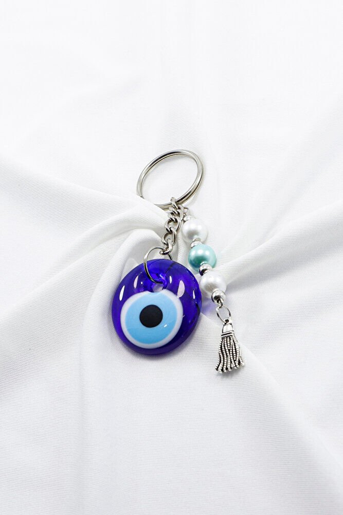 El Yapımı Cam Nazar Boncuklu Anahtarlık, Cam Göbeği Beyaz İncili Püsküllü Hediyelik Aksesuar