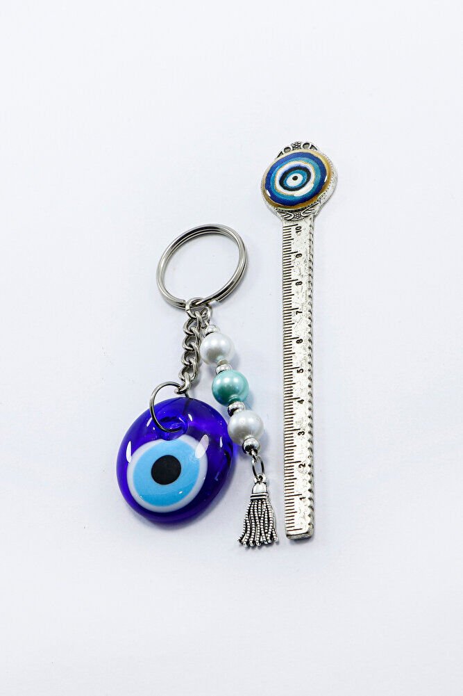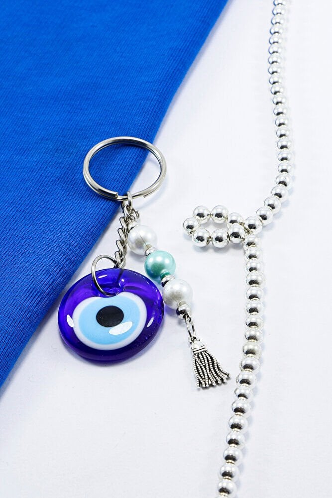 Ürün el yapımıdır. El yapımı olduğu için ufak farklılık ve düzensizlikler olasıdır. Mavi büyük nazar boncuğu camdır. Günlük kullanım için dayanıklı ve hafif yapıya sahip olan bu anahtarlık, anahtarlarınızı düzenli tutarken aynı zamanda estetik bir aksesuar olarak da öne çıkar. Nazar boncuğu, kültürel olarak korunma ve iyi dileklerle ilişkilendirilen bir sembol olup, tasarıma zarif bir anlam katmaktadır.