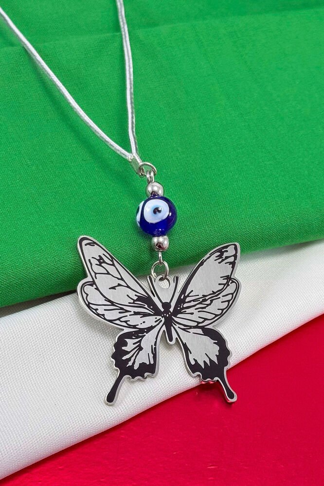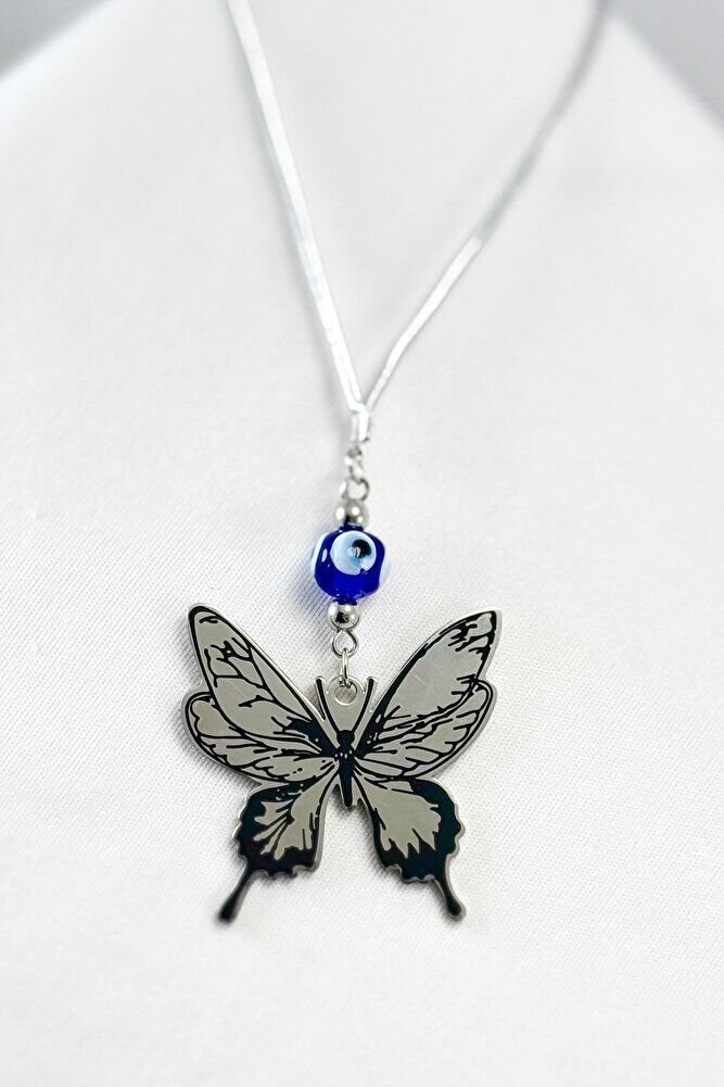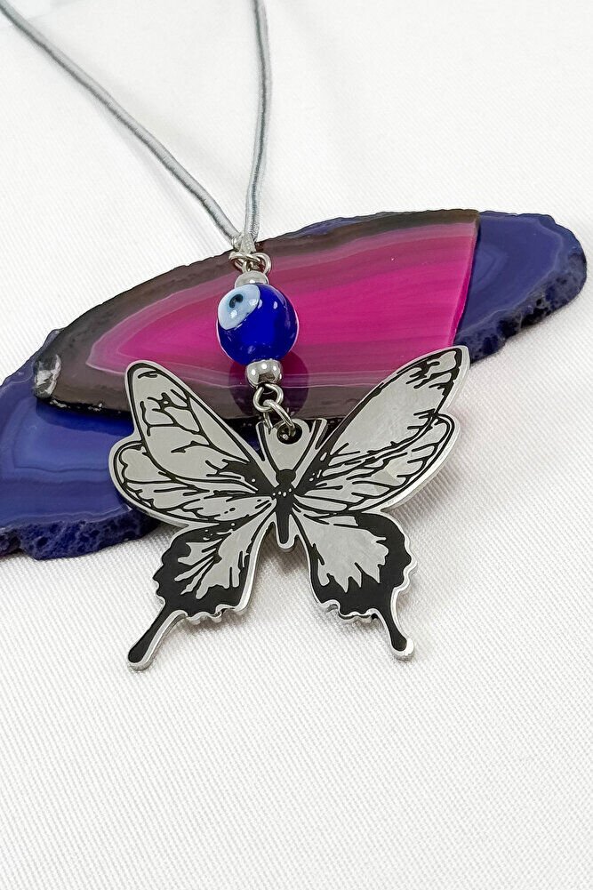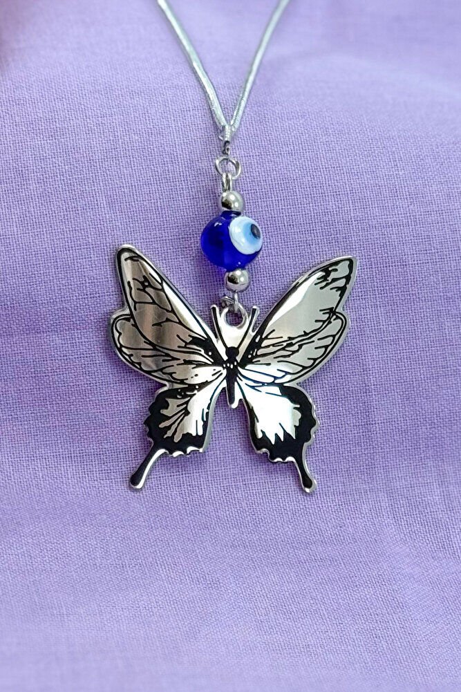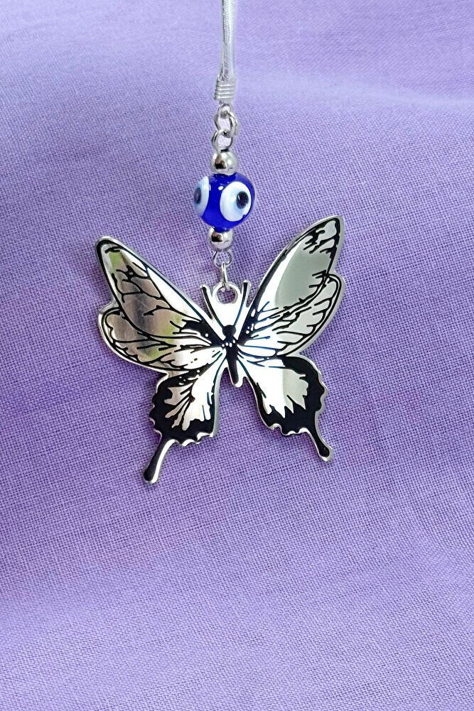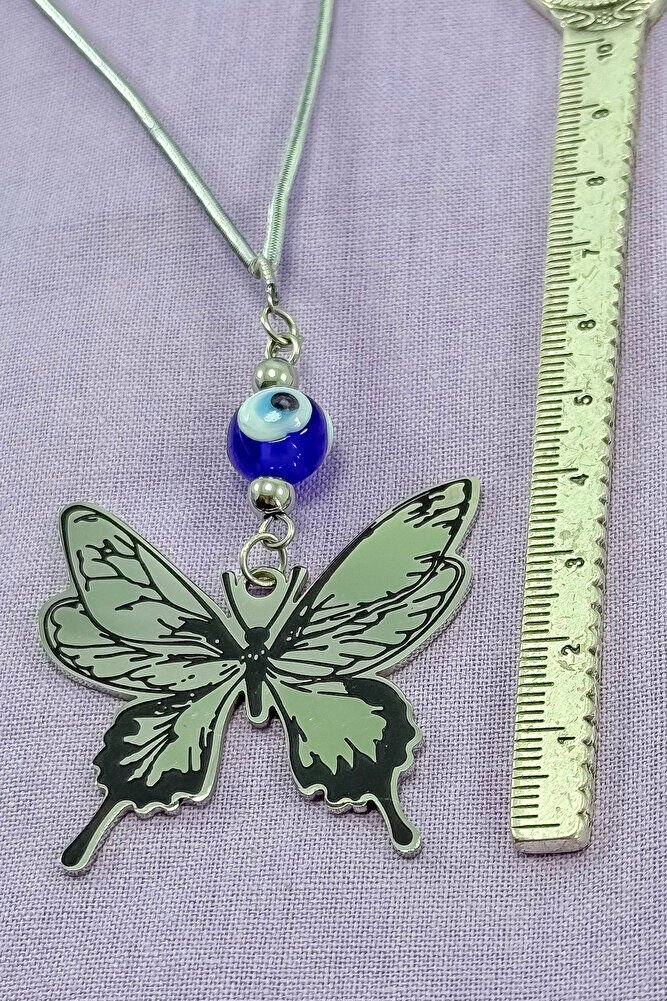 El Yapımı Cam Nazar Boncuklu Çelik Kelebek Figürlü Araba Dikiz Ayna Süsü
