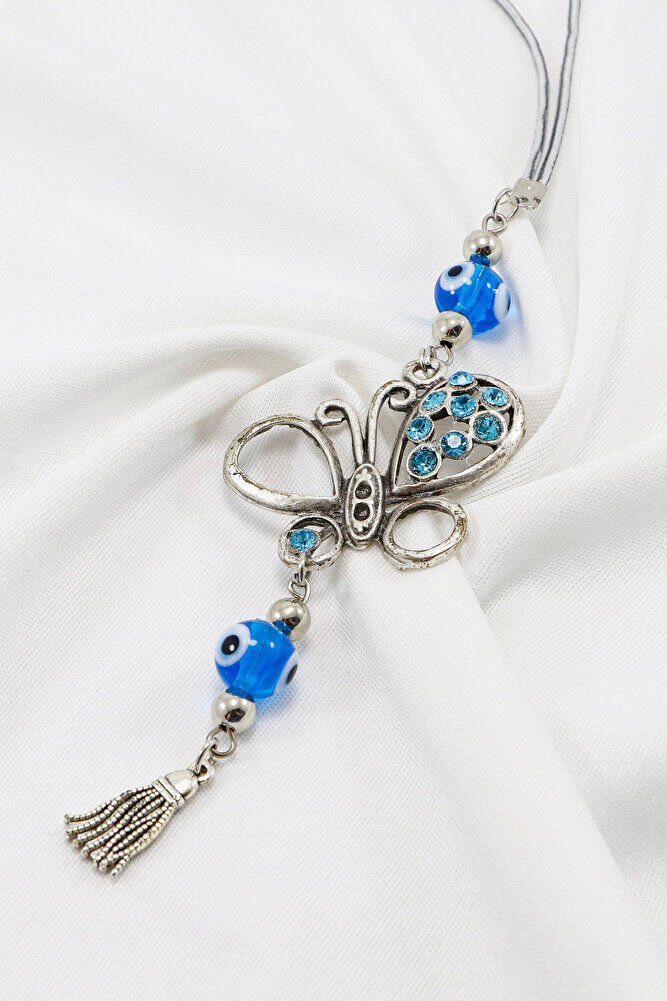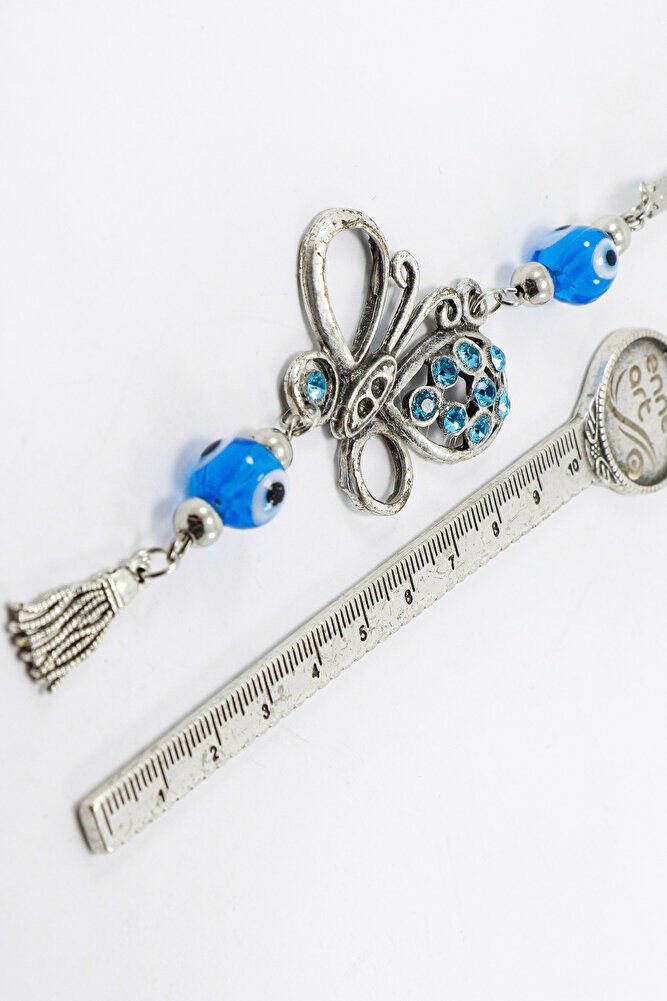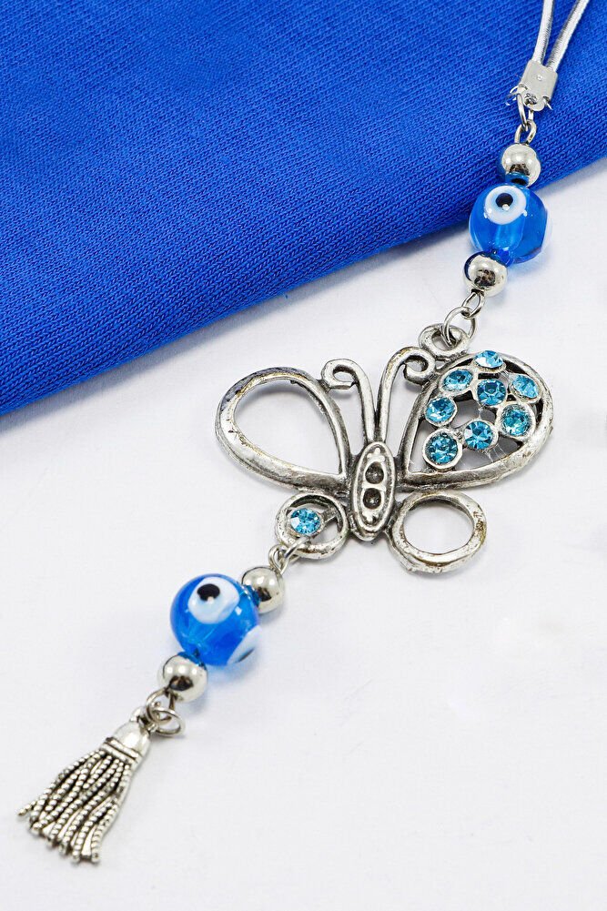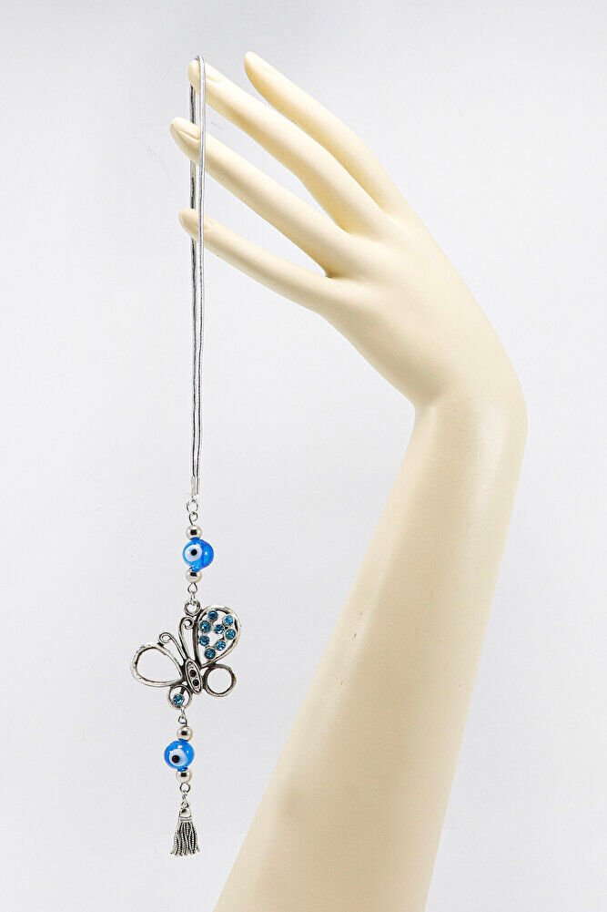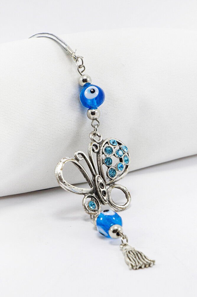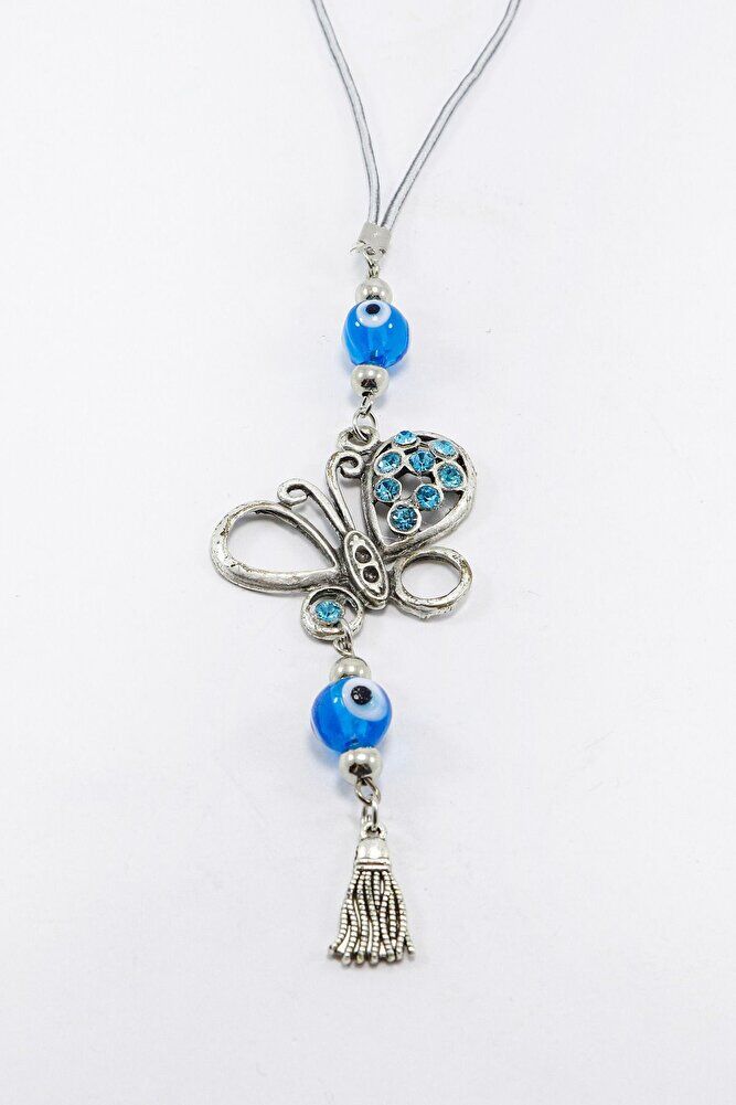 El Yapımı Cam Nazar Boncuklu Kelebekli Araba Dikiz Ayna Süsü, Metal Turkuaz Parlak Taşlı Kelebek