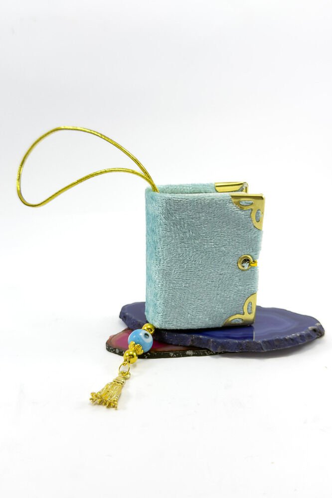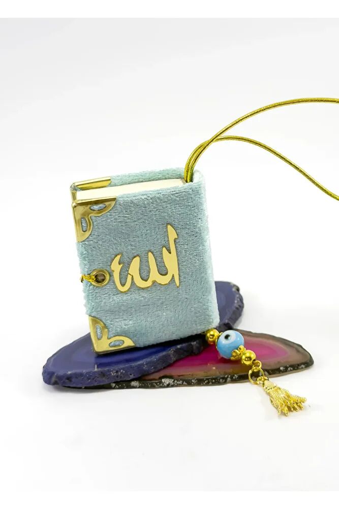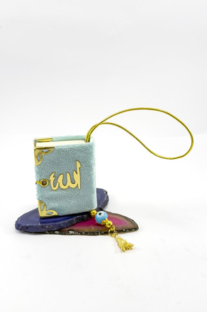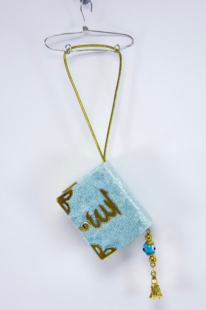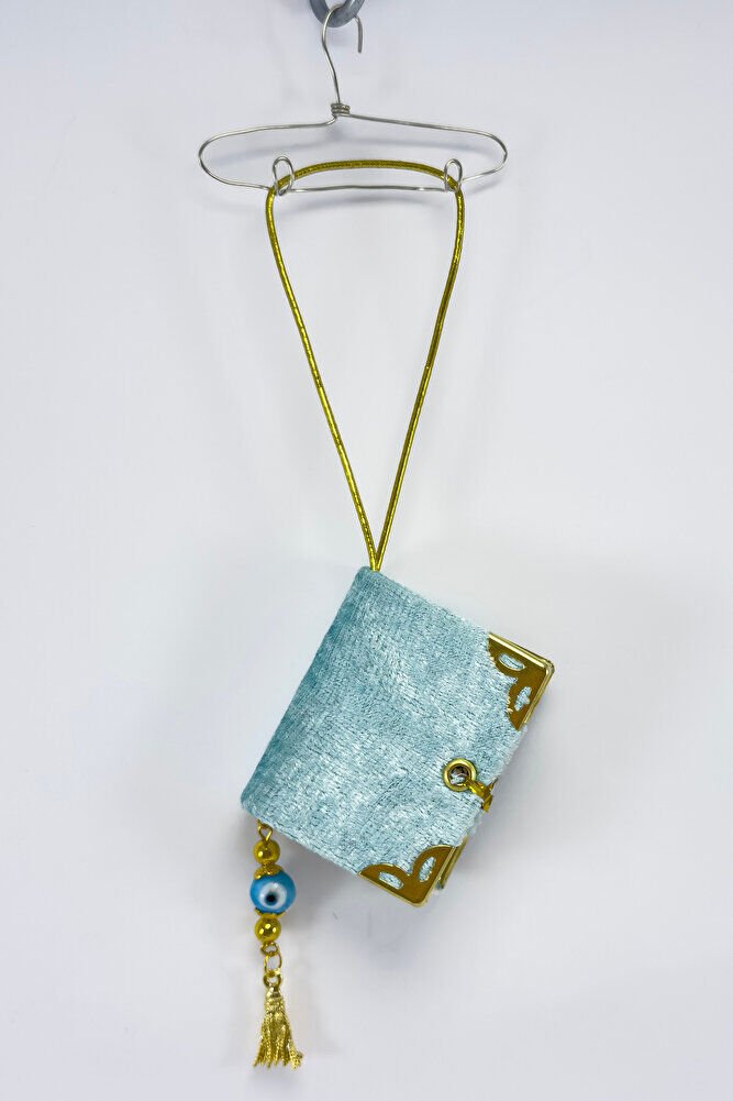 El Yapımı Cam Nazar Boncuklu Mavi Kadife Mini Kur' an-ı Kerim Araba Dikiz Ayna Süsü