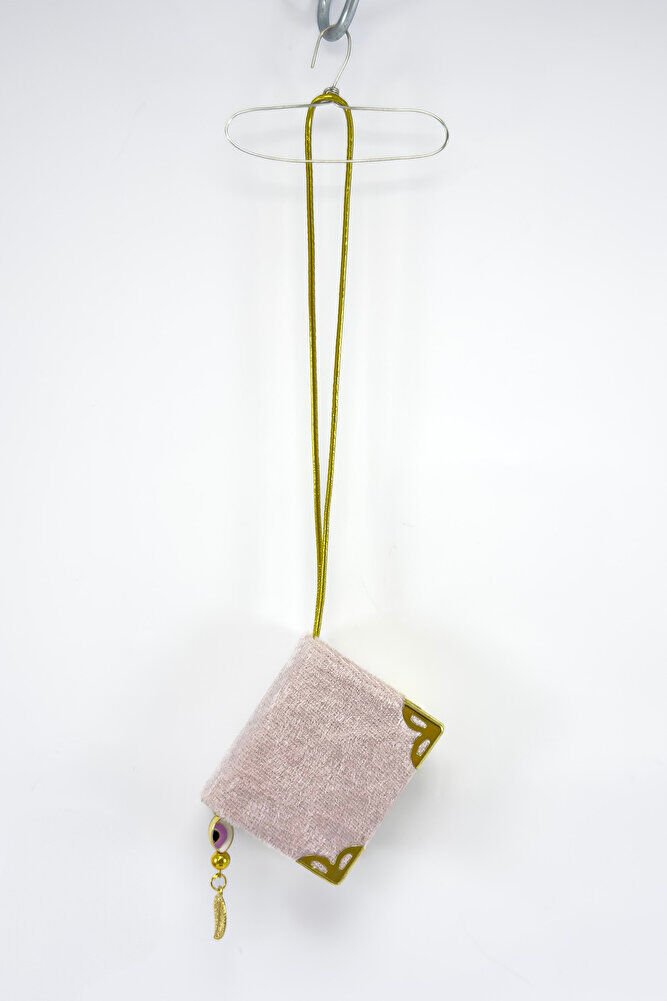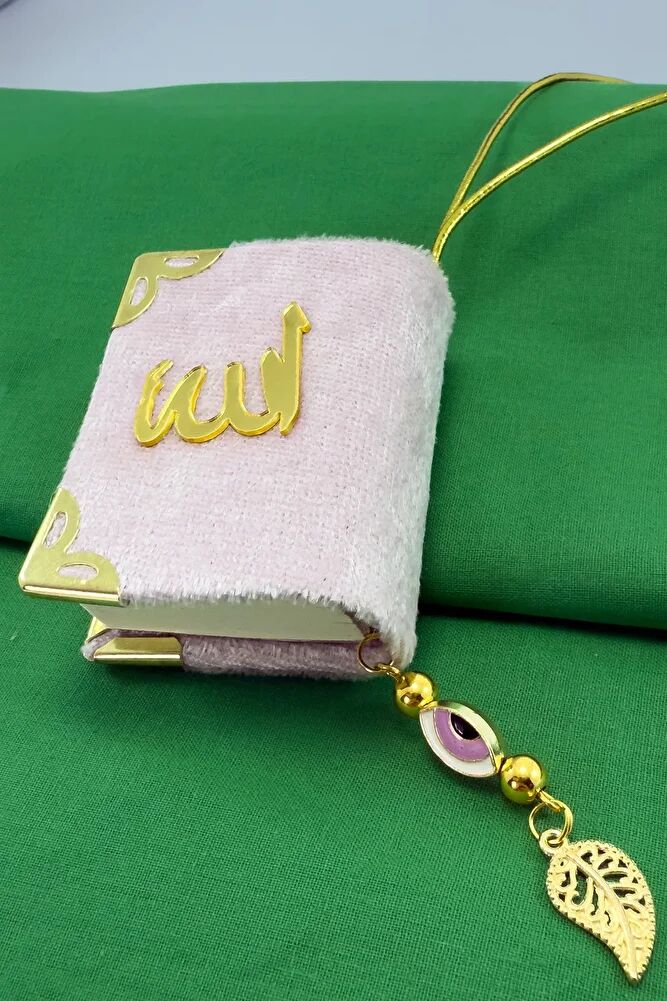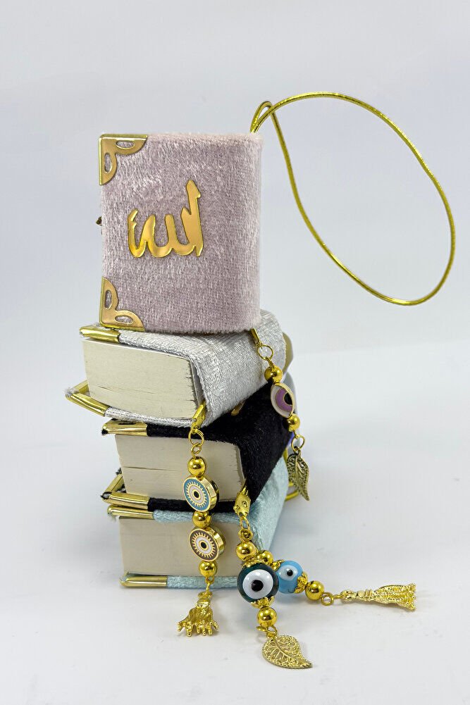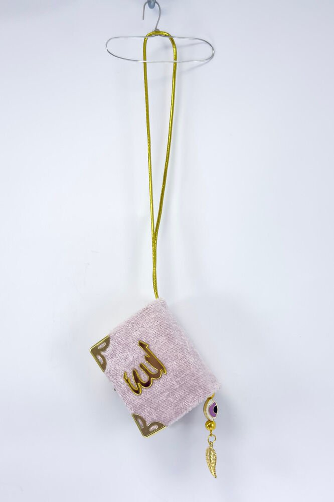 El Yapımı Cam Nazar Boncuklu Toz Pembe Kadife Mini Kur' an-ı Kerim Araba Dikiz Ayna Süsü