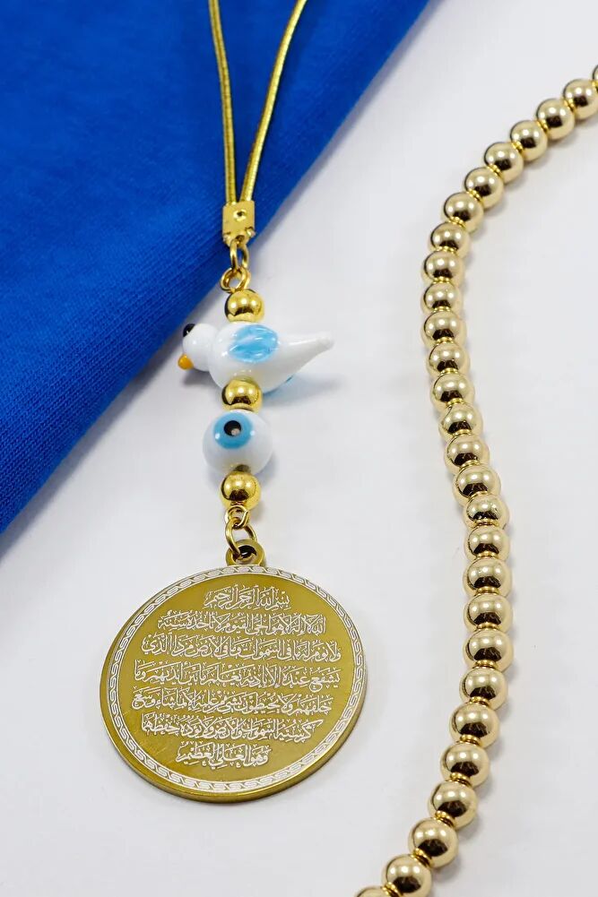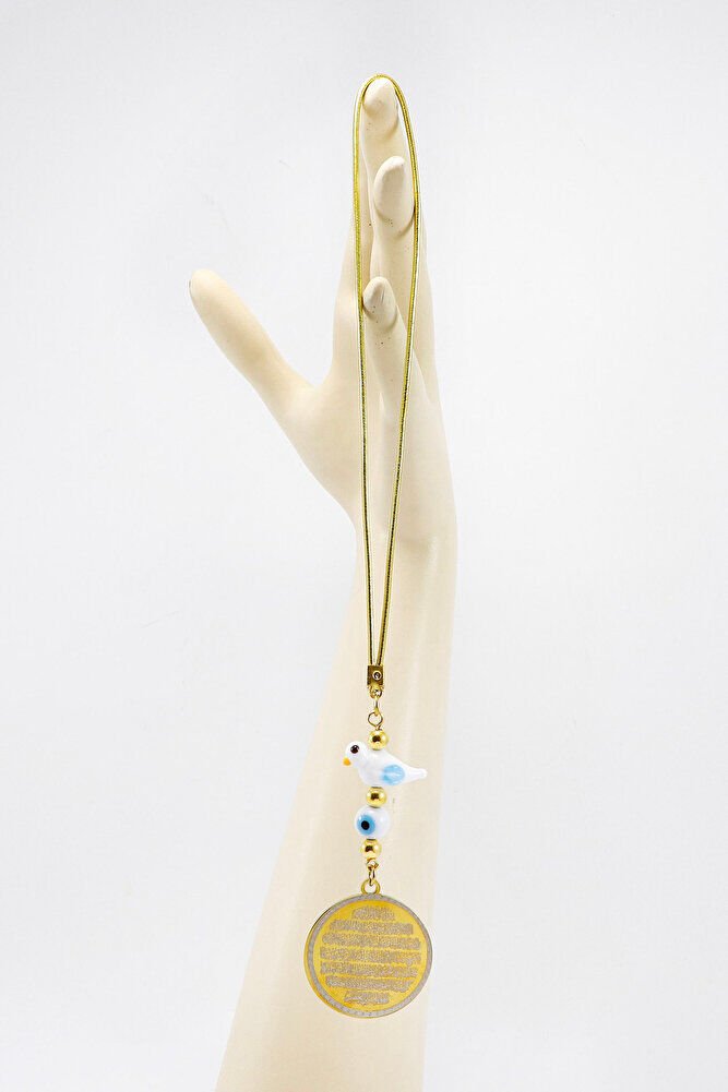 TÜM ÜRÜN FOTOGRAFLARI ENNEA ART FİRMASINA AİTTİR VE ÖZGÜN ÇALIŞMALARDIR.; İZİNSİZ KULLANIM, KOPYALAMA VEYA DAĞITIM KESİNLİKLE YASAKTIR.; GEREKLİ DURUMLARDA YASAL İŞLEM BAŞLATILACAKTIR.; Dualar lazer kazıma tekniği ile kalıcı bir şekilde kazınmaktadır.; Beyaz kuş el yapımı camdır ve çift taraflıdır.; Ürün el yapımıdır el yapımı olduğu için ufak farklılık ve düzensizlikler olasıdır.; İp elastiktir.; Elastik olduğu için her modele rahatlıkla takılabilmektedir.; Plaka altın renkli paslanmaz çeliktir.; Çelik plaka 3,5 cm ölçülerindedir.; Plaka çift taraflıdır.; Bir yüzünde Ayetel Kürsi diğer yüzünde ise Nazar Ayeti bulunmaktadır.; Nazar ayeti, İslam inancında kötü gözlerden ve olumsuz enerjilerden korunmak amacıyla okunan özel bir duadır.; İnanılır kabul edilir ki, nazar, bir kişinin üzerinde kötü niyetle bakılması sonucu, o kişinin hayatına olumsuz etkiler ve şanssızlık getirebilir.; Nazar ayeti, Allah ın korumasına sığınarak, kişinin bu tür olumsuz etkilerden korunmasını sağlar.; Ayrıca, nazarın kişiye zarar vermemesi için Allah'ın kudretine ve ilahi gücüne olan inancı güçlendirir.; Bu dua, zihinsel huzur ve manevi güç sağladığına inanılır, bu nedenle sıkça evlerde, iş yerlerinde veya kişisel eşyalar üzerinde okunur.;