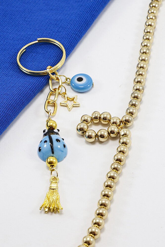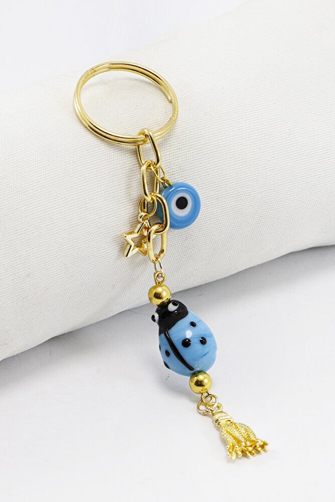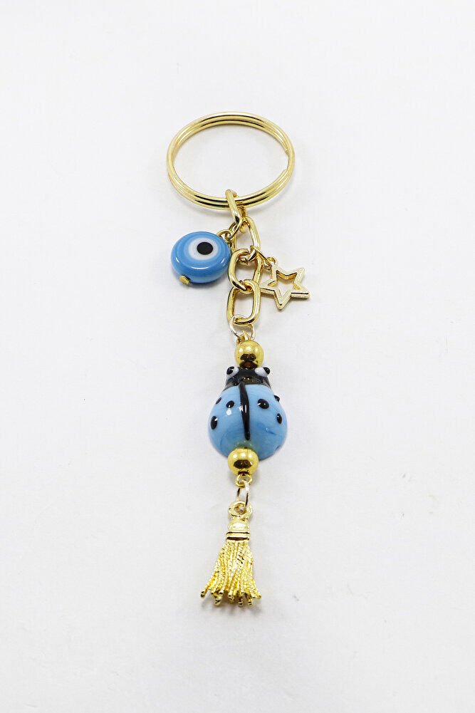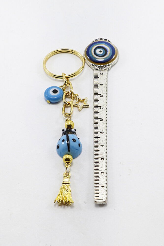 El Yapımı Mavi Cam Uğur Böcekli Yassı Nazar Boncuklu Salkım Anahtarlık, Hediyelik Çanta Süsü