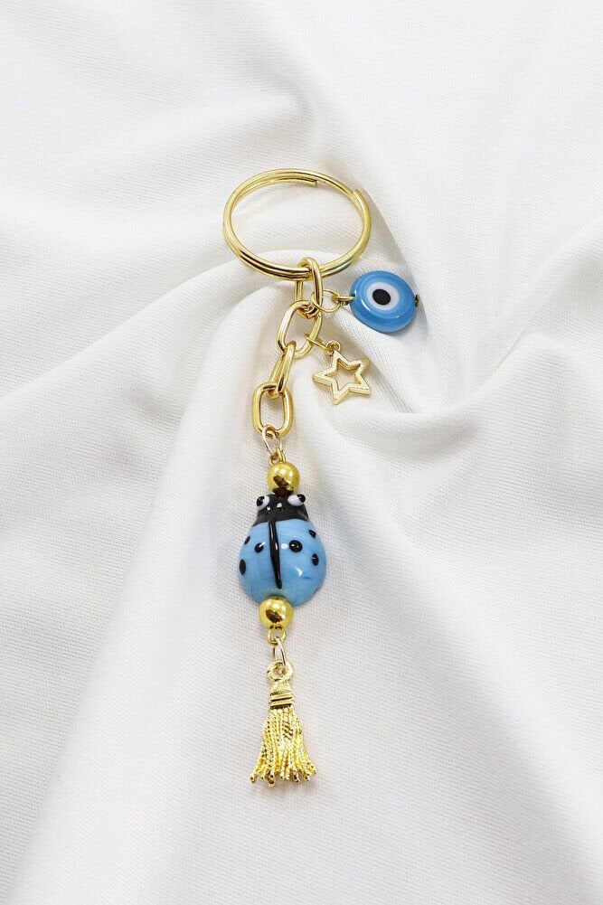 El yapımı mavi cam uğur böcekli yassı nazar boncuklu salkım anahtarlık; el işçiliğiyle üretilmiş, sevimli detayları ve nazar boncuğuyla koruyucu anlamlar taşıyan özel bir aksesuardır.; Uğur böceği figürü, şans ve bereketi simgelerken, yassı cam nazar boncuğu nazardan korunma niyetiyle tasarlanmıştır.; Salkım formu ve renkli tasarımı sayesinde hem anahtarlık hem de çanta süsü olarak tercih edilebilir.; Sevdiklerinize şık ve anlamlı bir hediye olarak da sunulabilir.; TÜM ÜRÜN FOTOĞRAFLARI ENNEA ART FİRMASINA AİTTİR VE ÖZGÜN ÇALIŞMALARDIR.; İZİNSİZ KULLANIM, KOPYALAMA VEYA DAĞITIM KESİNLİKLE YASAKTIR.; GEREKLİ DURUMLARDA YASAL İŞLEM BAŞLATILACAKTIR.