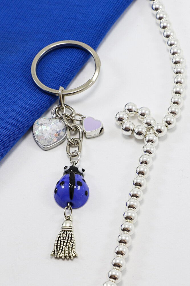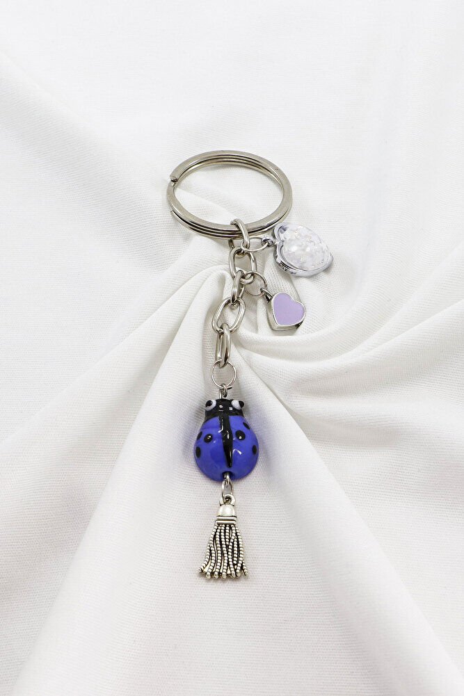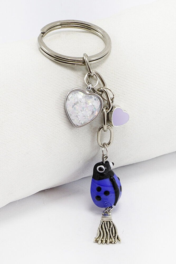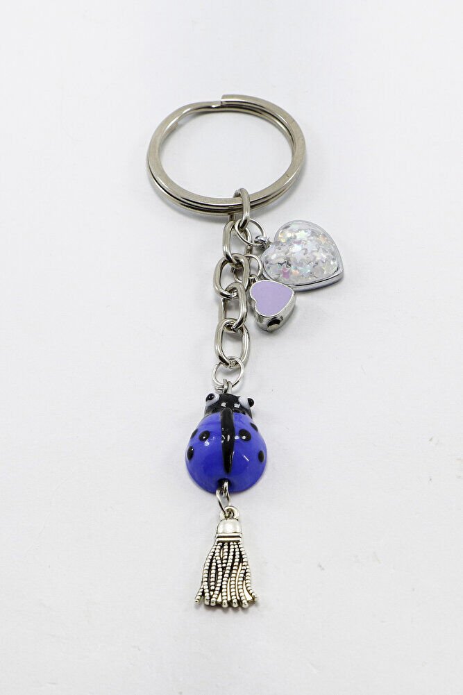 El Yapımı Mor Cam Uğur Böcekli Kalpli Salkım Anahtarlık, Hediyelik Çanta Süsü