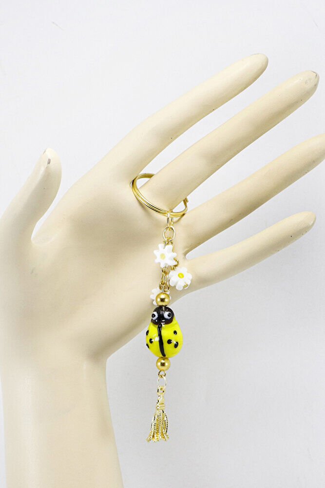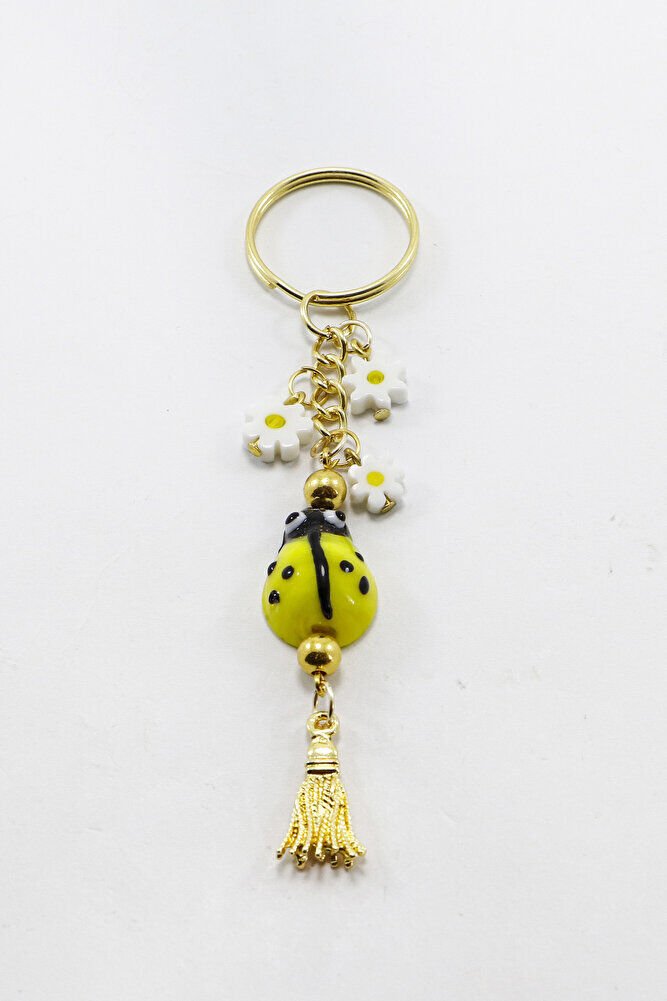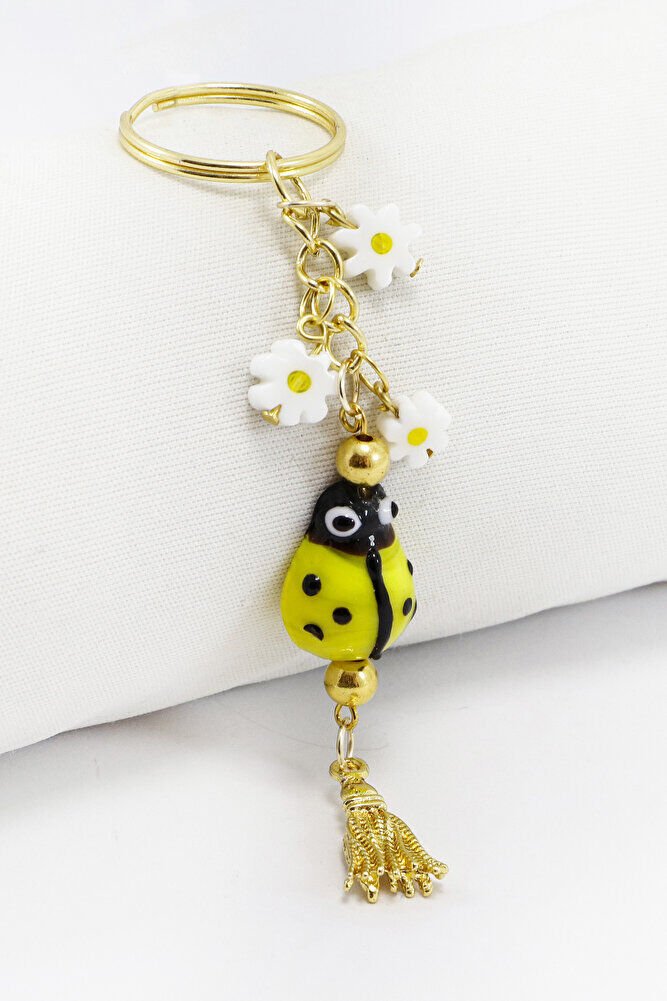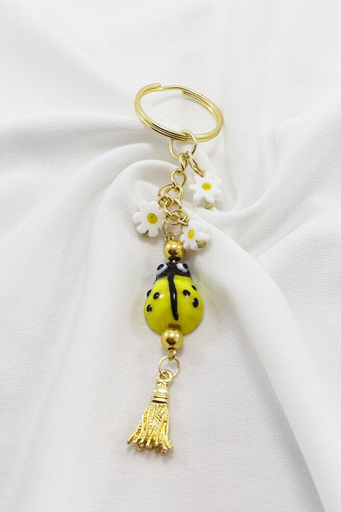 El Yapımı Sarı Cam Uğur Böcekli Papatyalı Anahtarlık, Hediyelik Çanta Süsü