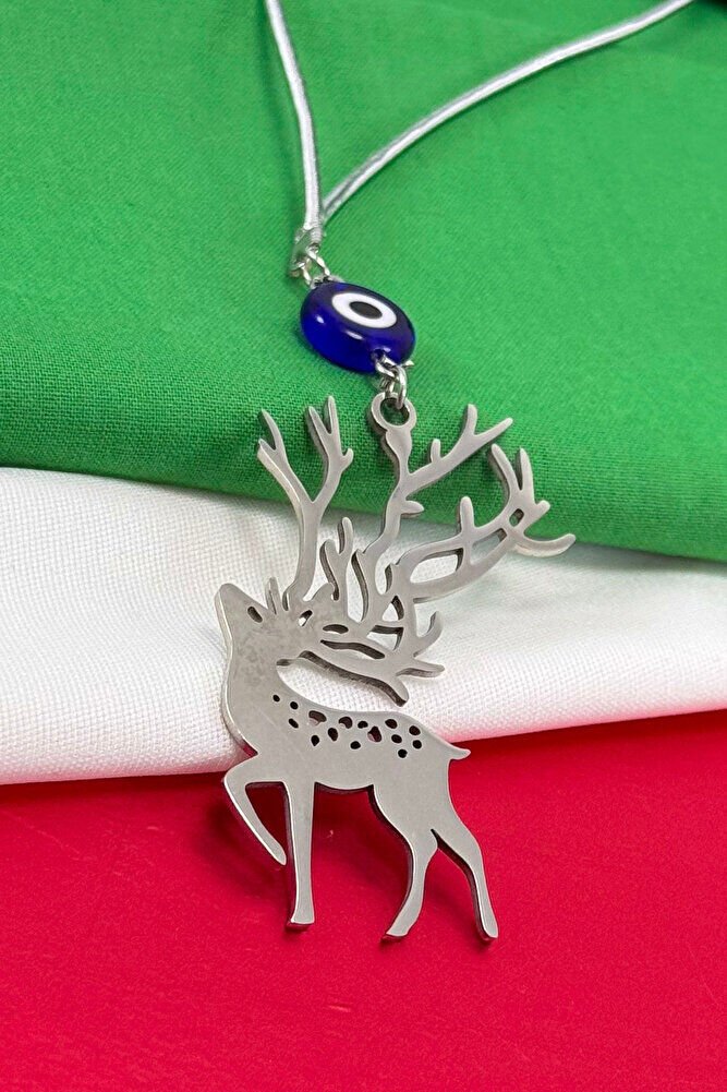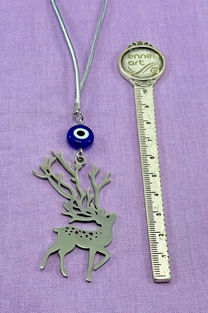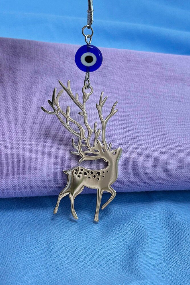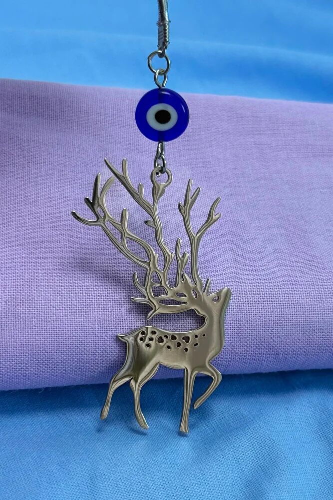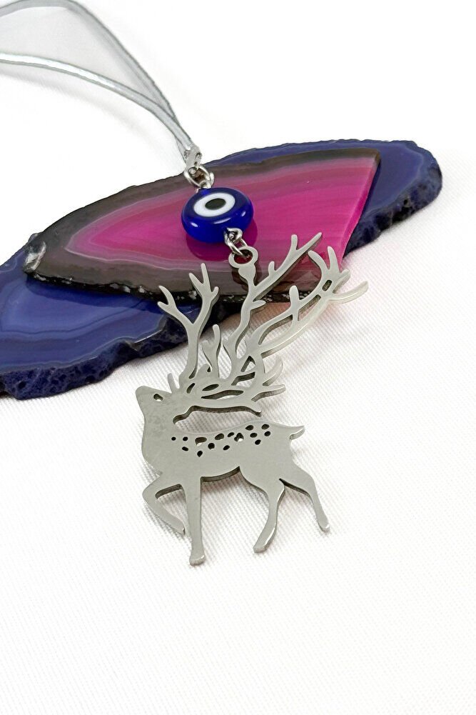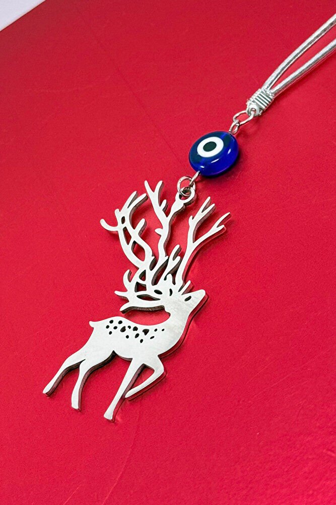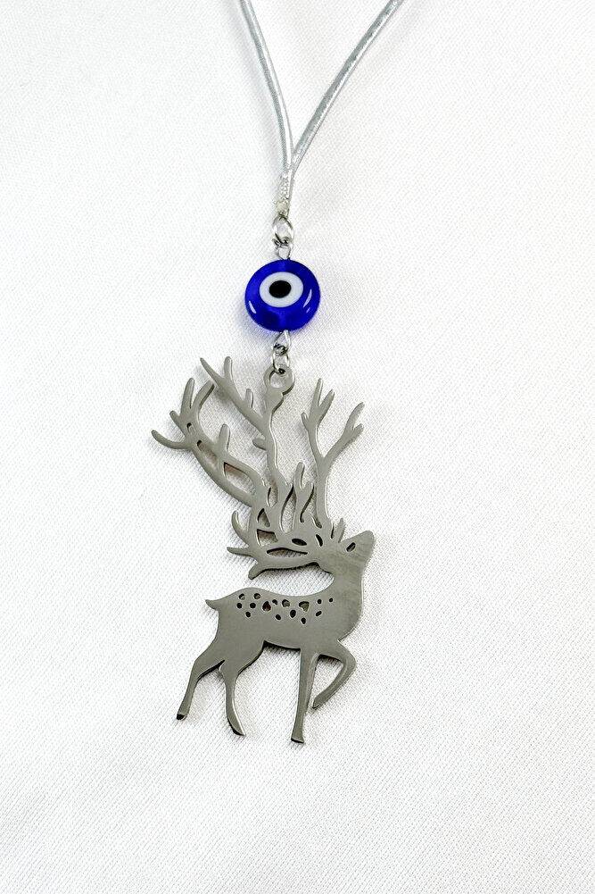 Ürün çift taraflıdır.; Yassı nazar boncuğu el yapımı camdır.; Geyik figürü bağlantı halkaları ve tüm mekanizmaları çeliktir.; İpi lastiklidir.; Her model araca rahatlıkla takılabilmektedir.; Geyik figürü, birçok kültürde zarafet, saflık, doğayla uyum ve ruhsal rehberlik gibi anlamlarla ilişkilendirilmiştir.; Kabul edilen bazı inanışlara göre; - Geyiğin içsel huzuru, sakinliği ve sabrı temsil ettiği, - Manevi uyanışa ve sezgisel güce rehberlik edebileceği, - Yeni başlangıçlara ilham verdiği düşünülmektedir.; Bazı geleneklerde, özellikle boynuzları nedeniyle yaşam döngüsü ve ruhsal bağlantının sembolü olarak görülür.; Bu tür anlamlar kültürden kültüre değişebilir ve kişisel inançlara bağlı olarak yorumlanır.;