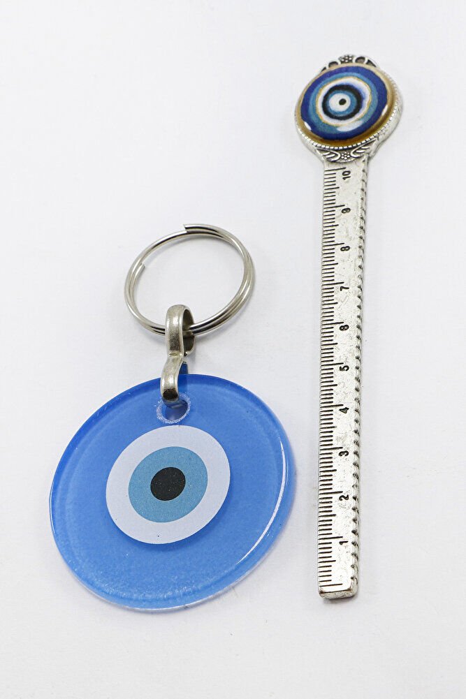 El yapımı yassı cam nazar boncuğu ve lacivert cam nazar detaylarıyla hazırlanan bu anahtarlık, hem şık bir çanta süsü hem de anlamlı bir hediye alternatifidir.; Geleneksel nazar boncuğu motifi, kötü enerjilere ve nazara karşı koruyucu bir sembol olarak kabul edilir.; El işçiliğiyle hazırlanmış bu ürün, zarif detaylarıyla dikkat çekerken manevi bir anlam da taşır.; Sevdiklerinize hediye edebileceğiniz özel ve anlamlı bir aksesuardır.; TÜM ÜRÜN FOTOĞRAFLARI ENNEA ART FİRMASINA AİTTİR VE ÖZGÜN ÇALIŞMALARDIR.; İZİNSİZ KULLANIM, KOPYALAMA VEYA DAĞITIM KESİNLİKLE YASAKTIR.; GEREKLİ DURUMLARDA YASAL İŞLEM BAŞLATILACAKTIR.